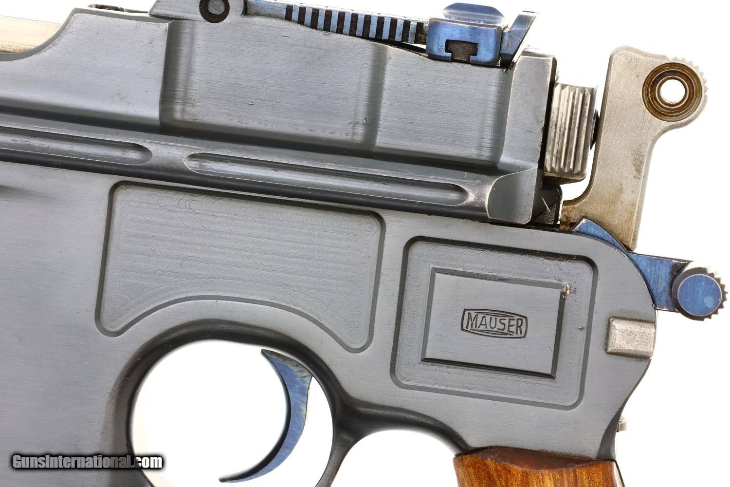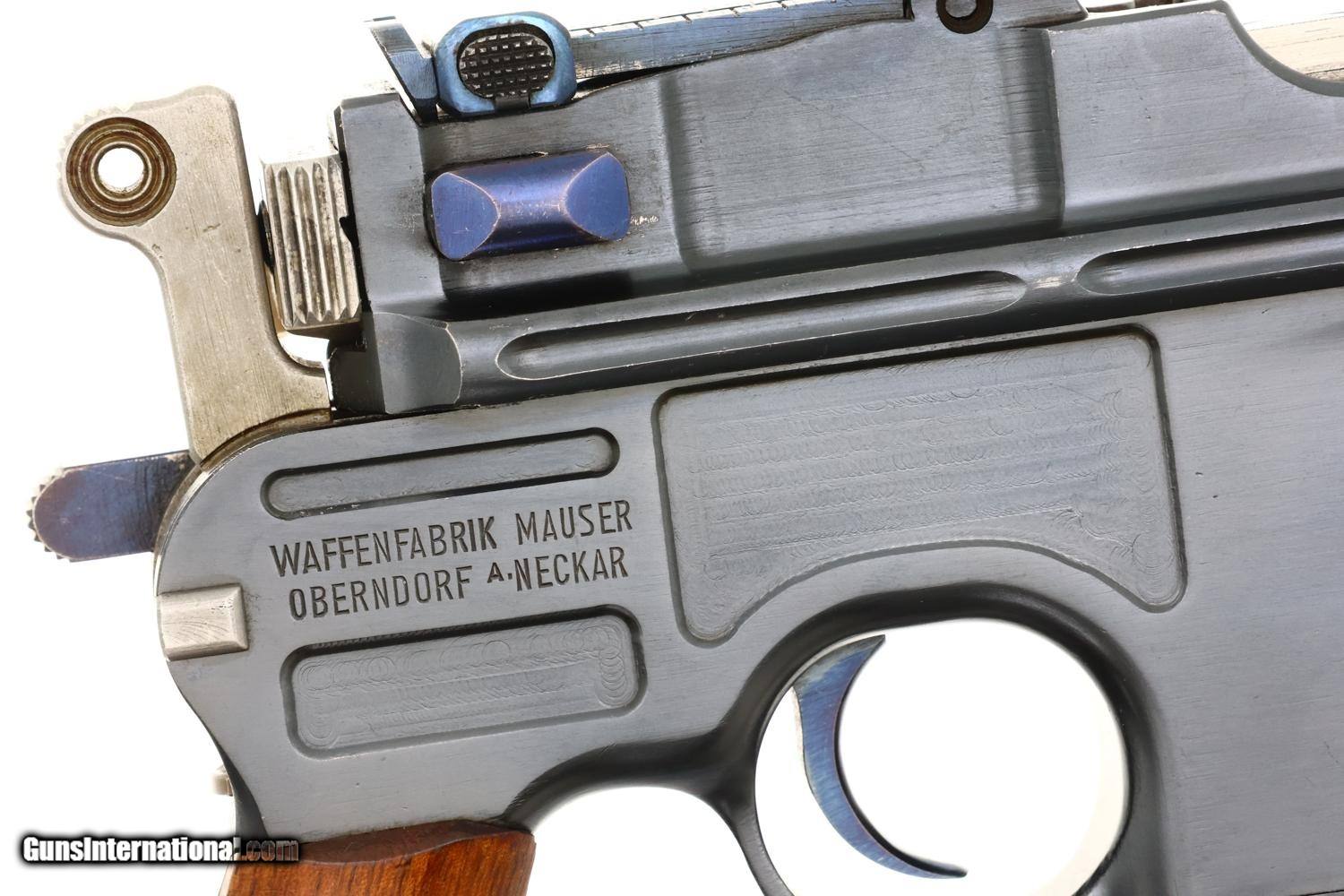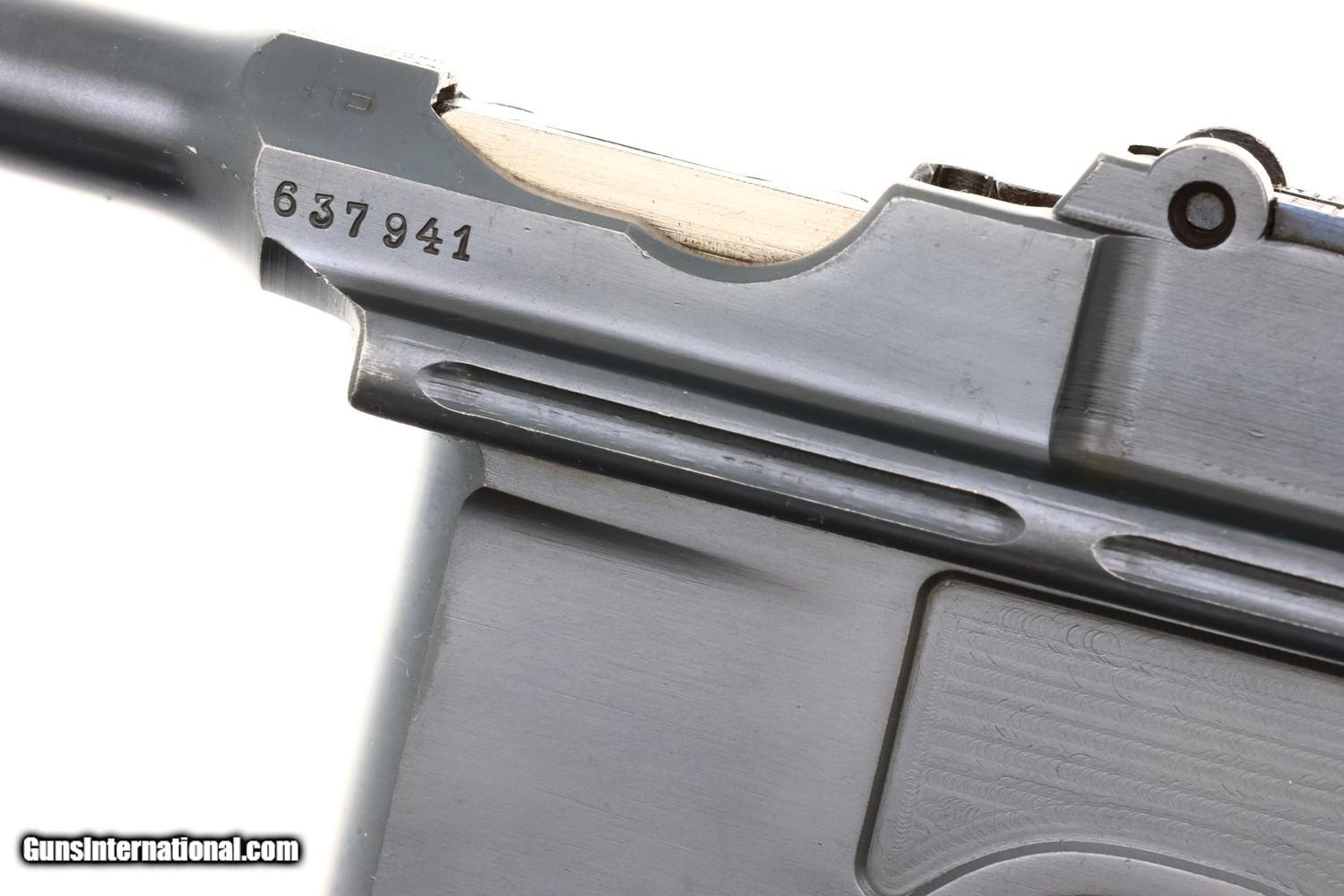 Phenomenal, all original, Mauser C96 Post War Mauser Banner Bolo, all matching serial numbers. Cal: 7.63mm. Standard configuration C96 Mauser Banner Bolo with rust blue finish having 3.9? barrel, slip-in 50-1000 meter tangent rear sight, small extractor, and small ring hammer. Three line “WAFFENFABRIK MAUSER OBERNDORF” address on top of chamber. Crown/C/U proofing on left chamber flat. Full SN: "637941" on left side of barrel extension. Left side of frame with narrow Mauser Banner. Usual two line address on right side of frame. Serrated walnut grips with matching serial number under both grip panels. Original lanyard ring that swivels side-to-side. SN: 637941 places this pistol within the documented Post War Bolo production range of approximately 440,000-793,350, manufactured from the early 1920s through 1930