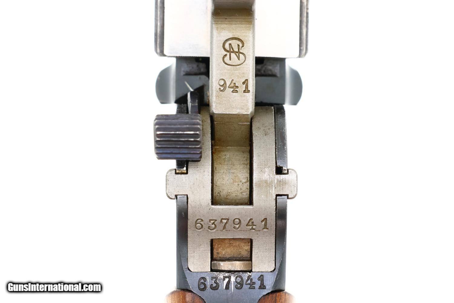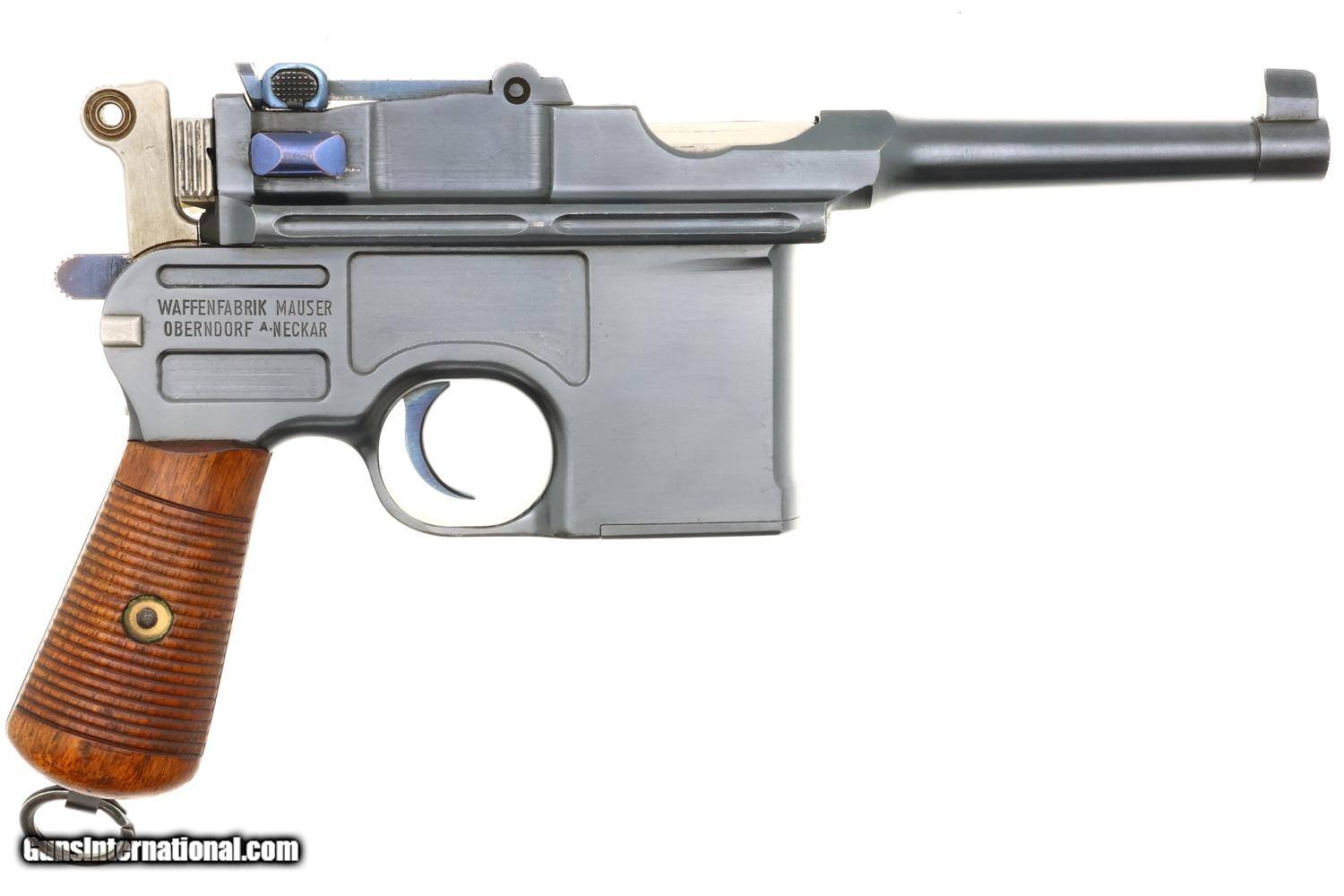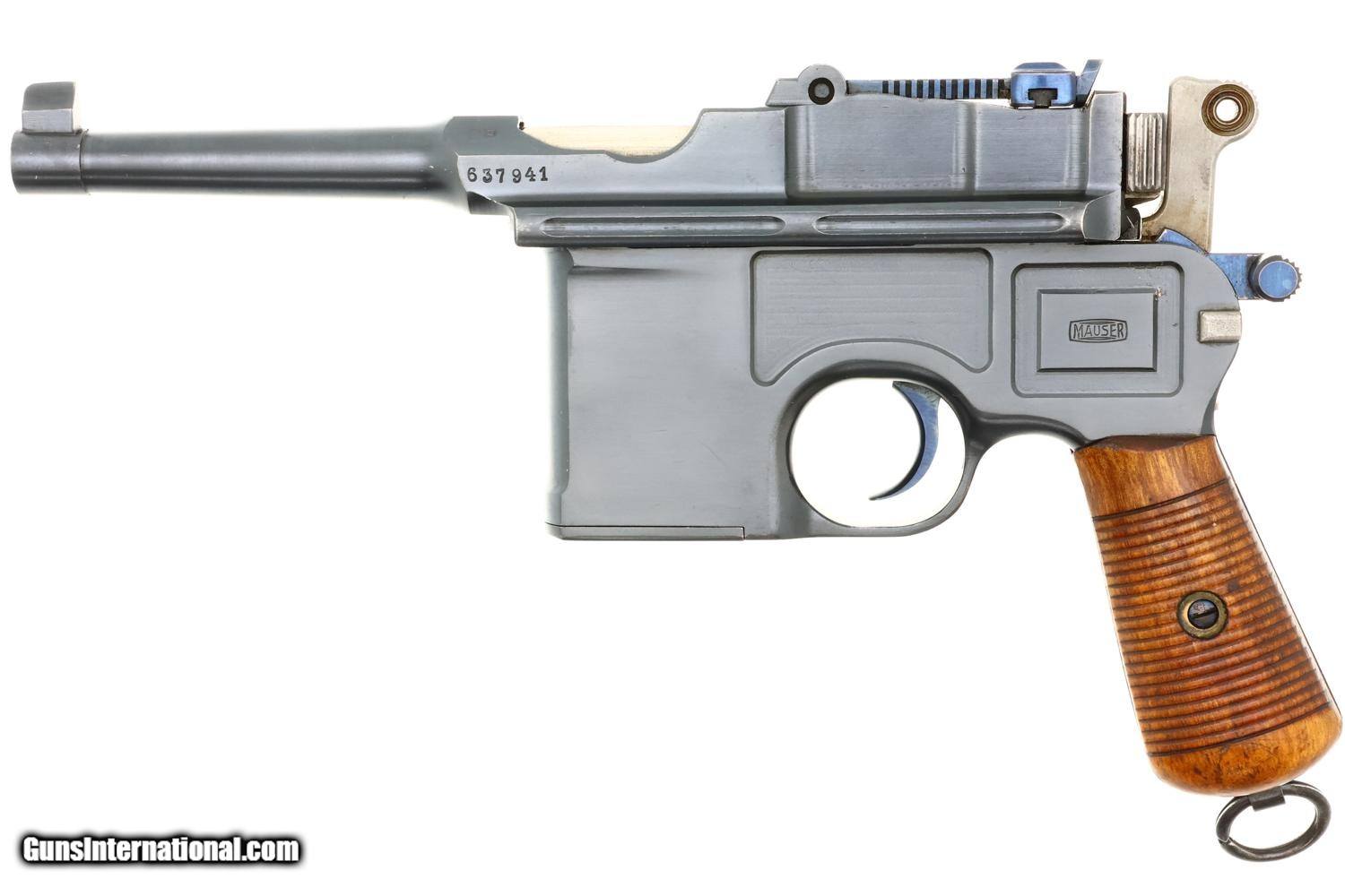 Phenomenal, all original, Mauser C96 Post War Mauser Banner Bolo, all matching serial numbers. Cal: 7.63mm. Standard configuration C96 Mauser Banner Bolo with rust blue finish having 3.9? barrel, slip-in 50-1000 meter tangent rear sight, small extractor, and small ring hammer. Three line “WAFFENFABRIK MAUSER OBERNDORF” address on top of chamber. Crown/C/U proofing on left chamber flat. Full SN: "637941" on left side of barrel extension. Left side of frame with narrow Mauser Banner. Usual two line address on right side of frame. Serrated walnut grips with matching serial number under both grip panels. Original lanyard ring that swivels side-to-side. SN: 637941 places this pistol within the documented Post War Bolo production range of approximately 440,000-793,350, manufactured from the early 1920s through 1930