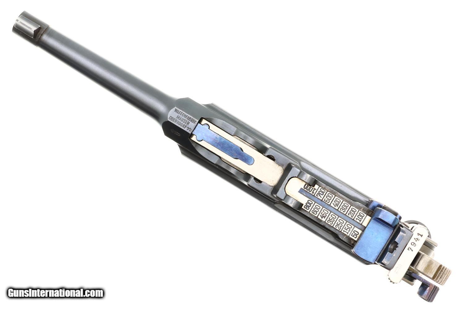 Stunning, nearly new and all-matching Mauser Banner Bolo Broomhandle, a post war pistol with classic rust blue finish, peacock-blue small parts, and mirror bore. Virtually impossible to upgrade!