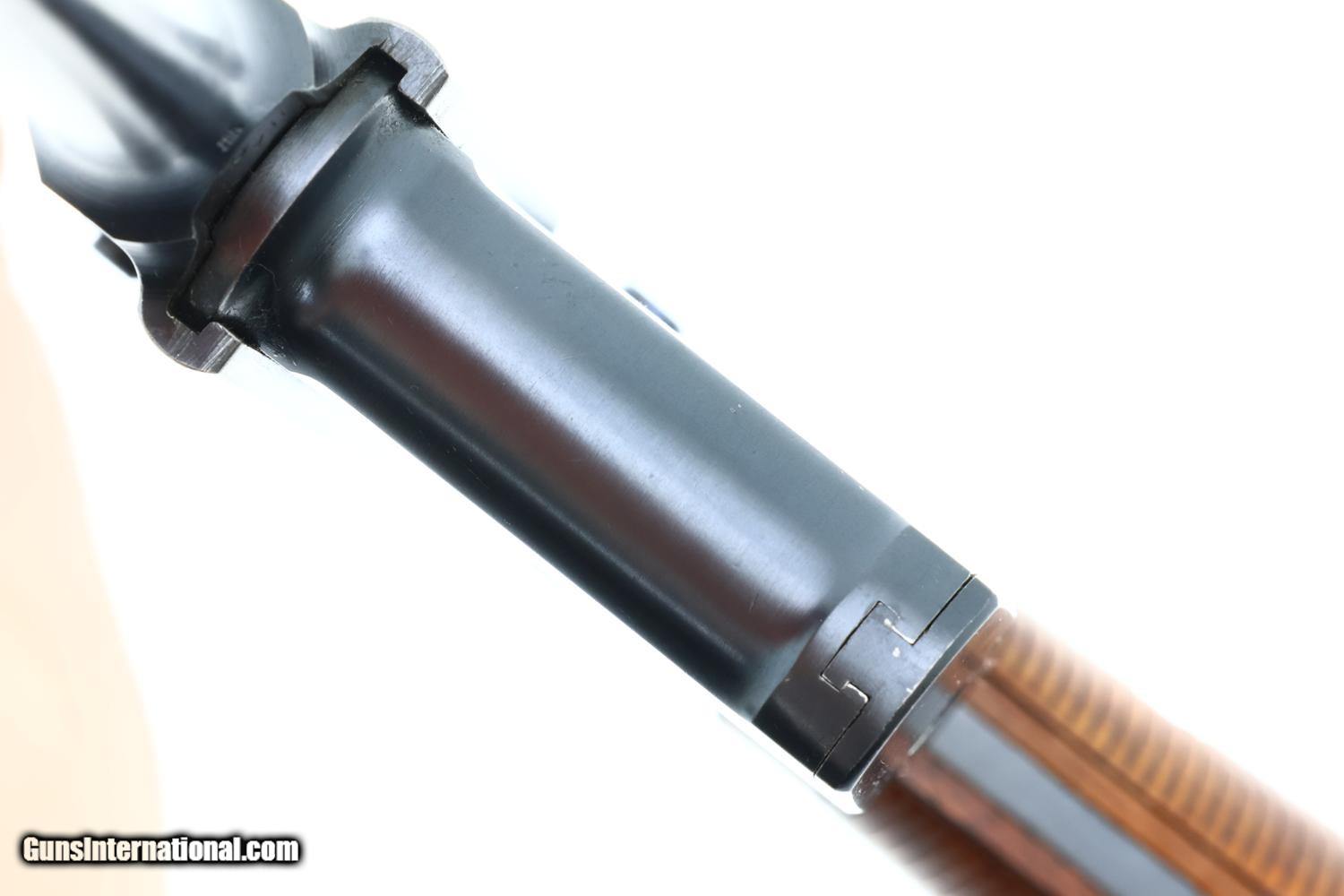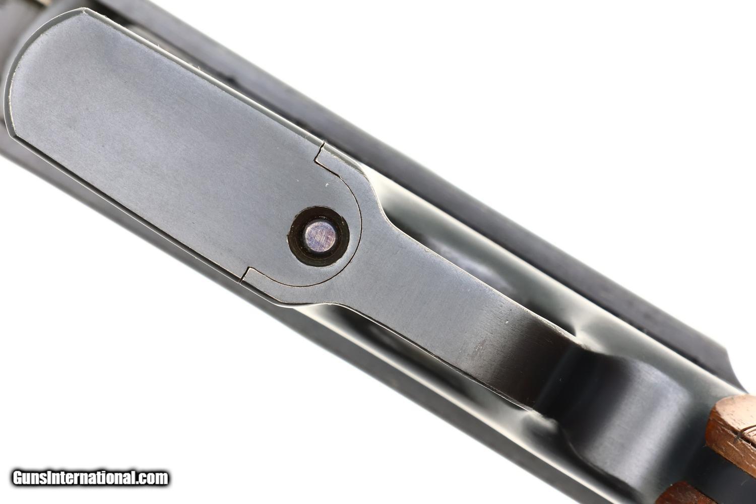 99+% bright original rust blue finish, with minimal sharp edge wear at tips and crest of rails. No wear on forward magazine well or frontstrap. Comparable condition fire-blued small parts. The bolt stop with minimal thinning at crest. Grips retaining virtually all original finish, with only a few handling marks at bottom. Mirror bright bore. Perfect manual mechanics. An exceptional and all matching Mauser Banner Bolo, nearly impossible to upgrade short of finding a similar example with a matching stock!