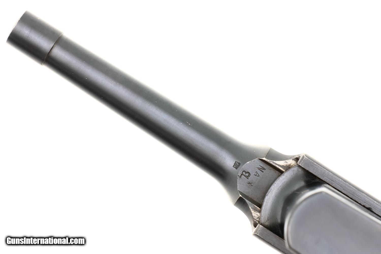 Description: Synopsis: Stunning, nearly new and all-matching Mauser Banner Bolo Broomhandle, a post war pistol with classic rust blue finish, peacock-blue small parts, and mirror bore. Virtually impossible to upgrade! Description: Phenomenal, all original, Mauser C96 Post War Mauser Banner Bolo, all matching serial numbers. Cal: 7.63mm. Standard configuration C96 Mauser Banner Bolo with rust blue finish having 3.9? barrel, slip-in 50-1000 meter tangent rear sight, small extractor, and small ring hammer. Three line “WAFFENFABRIK MAUSER OBERNDORF” address on top of chamber. Crown/C/U proofing on left chamber flat. Full SN: "637941" on left side of barrel extension. Left side of frame with narrow Mauser Banner. Usual two line address on right side of frame. Serrated walnut grips with matching serial number under both grip panels. Original lanyard ring that swivels side-to-side. SN: 637941 places this pistol within the documented Post War Bolo production range of approximately 440,000-793,350, manufactured from the early 1920s through 1930 Condition: 99+% bright original rust blue finish, with minimal sharp edge wear at tips and crest of rails. No wear on forward magazine well or frontstrap. Comparable condition fire-blued small parts. The bolt stop with minimal thinning at crest. Grips retaining virtually all original finish, with only a few handling marks at bottom. Mirror bright bore. Perfect manual mechanics. An exceptional and all matching Mauser Banner Bolo, nearly impossible to upgrade short of finding a similar example with a matching stock! Curio/Relic: Yes Manufacturer: Waffenfabrik Mauser Model: C96 Mauser Banner Bolo Pistol Serial Number: 637941 Caliber Info: 30 Mauser Condition: EXC Price: $4,995.00 Contact Seller |