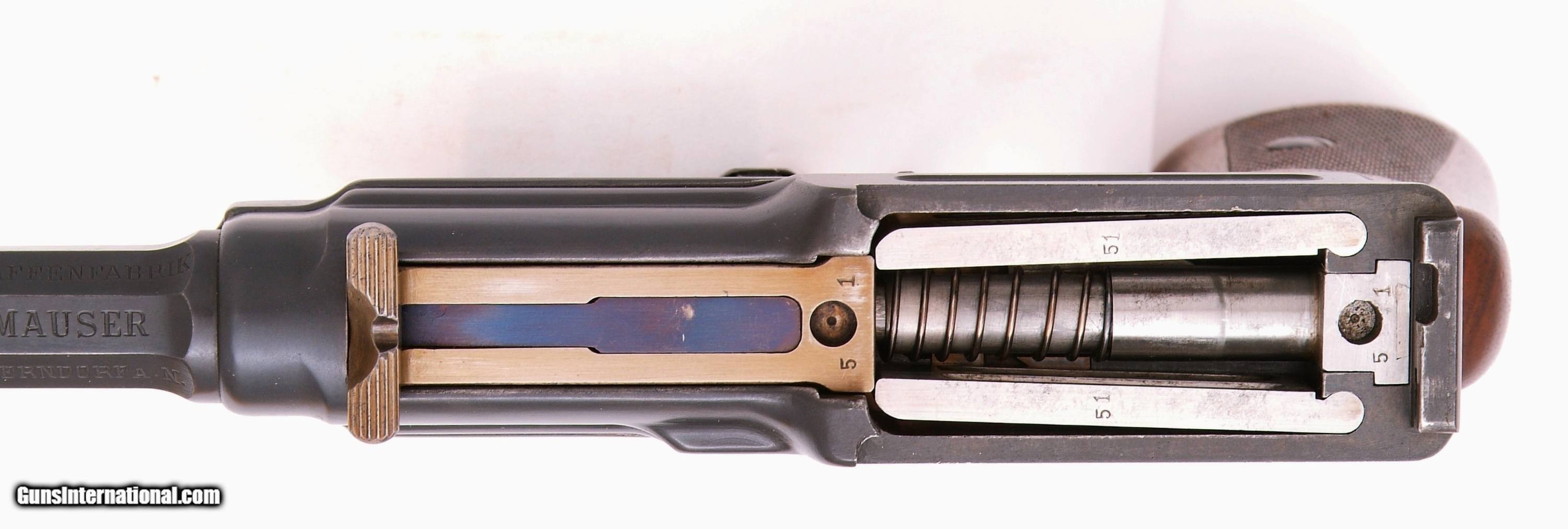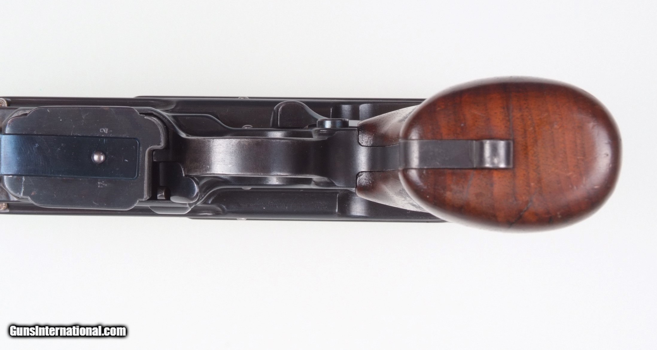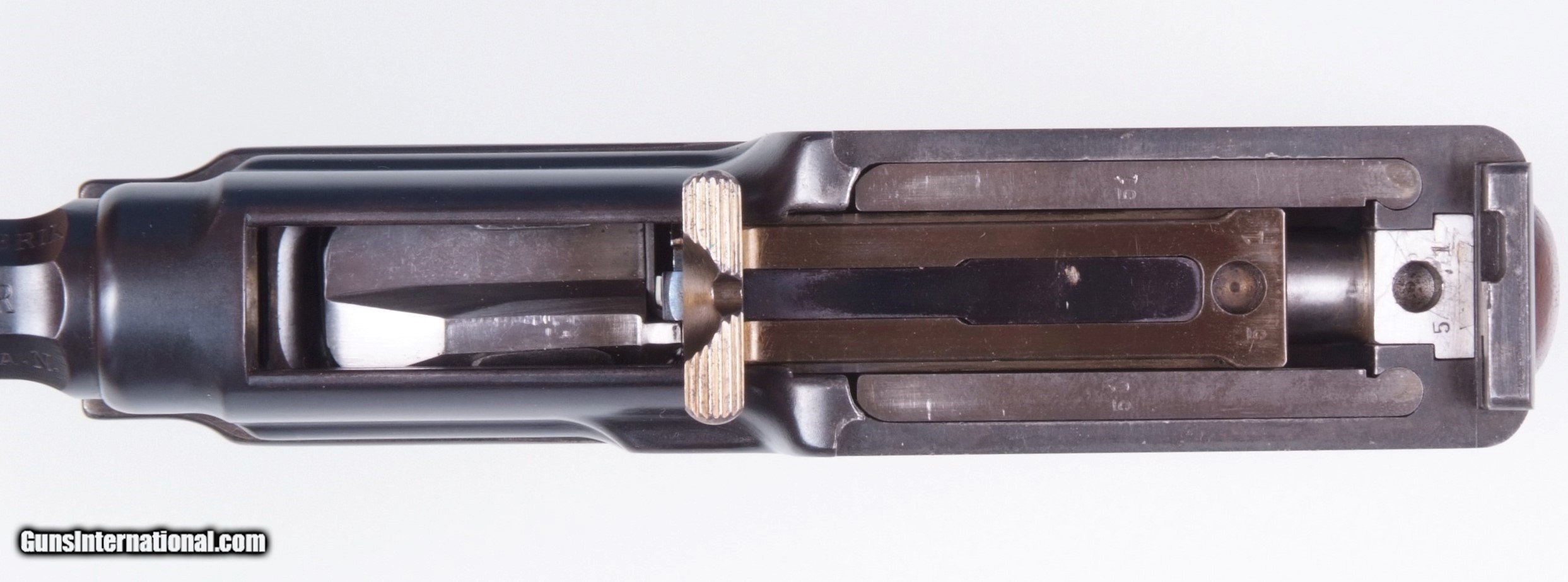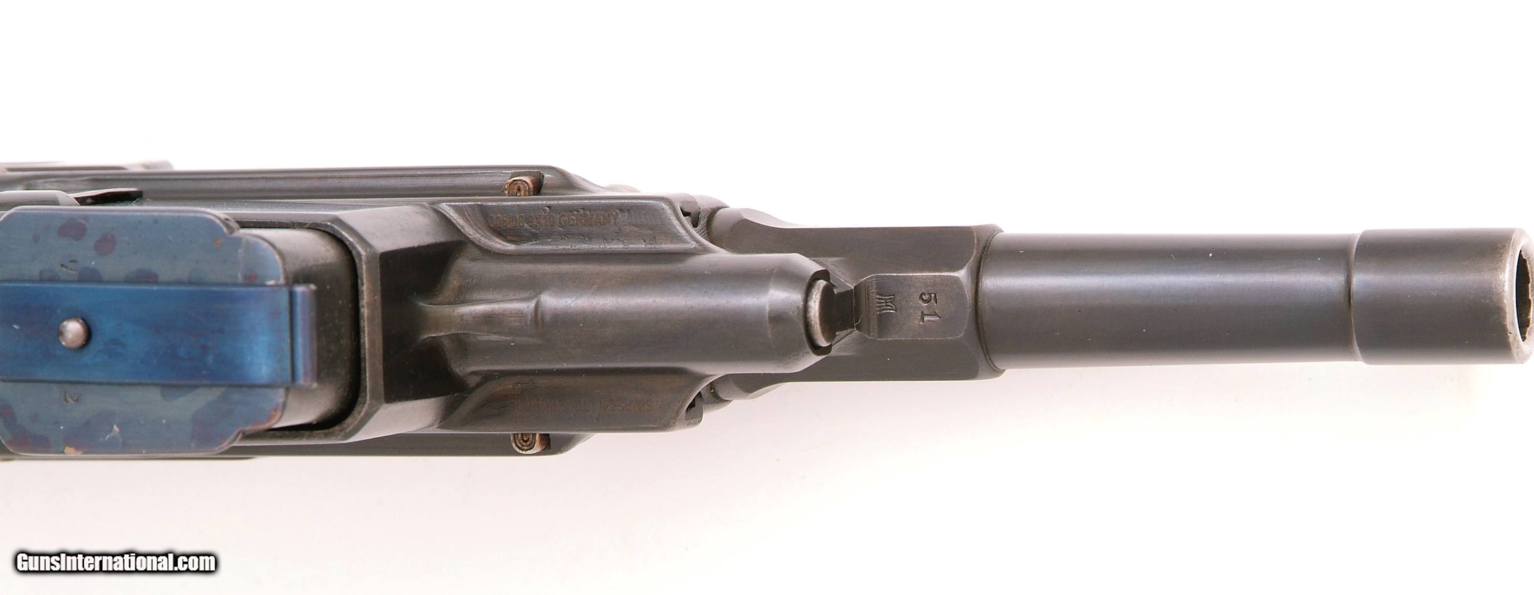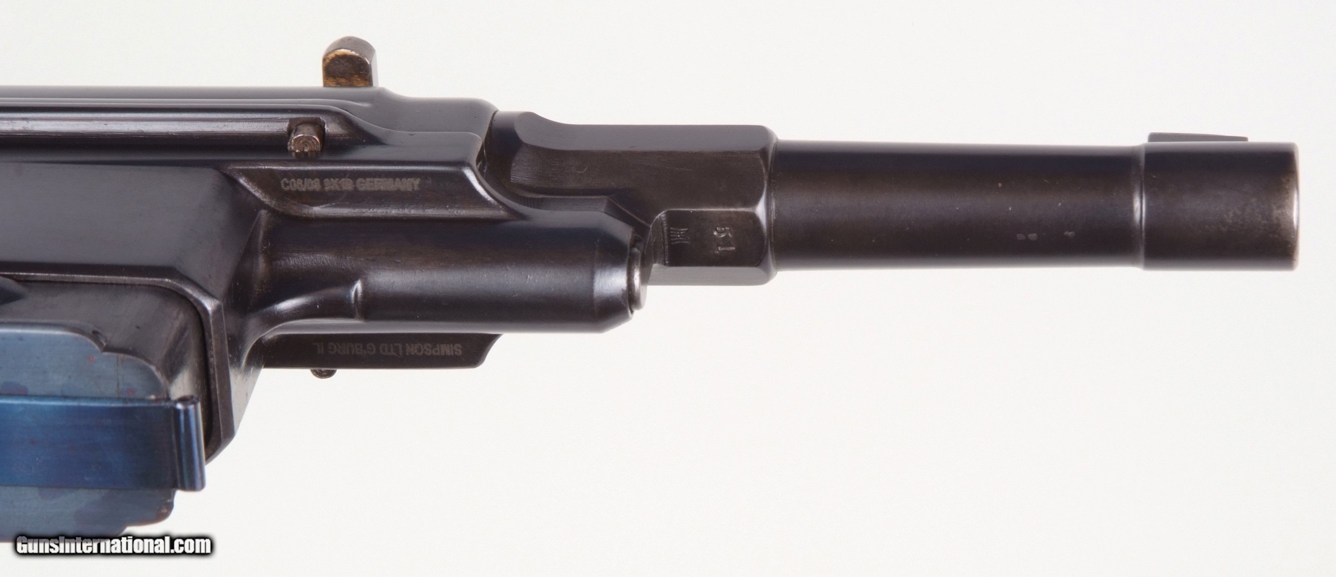 Description: This 2nd variation pistol has a 4" barrel with a banded front sight and a half round-half octagonal barrel whose chamber is hand inscribed "WAFFENFABRIK / MAUSER OBERNDORF A.N.". Major components are rust blued. Bolt is strawed while the extractor, safety, safety release button, trigger, magazine retention spring and grip screw are fire-blued. Disassembly shows all matching numbers except for the magazine whose body is numbered "142" and whose fire-blued base is numbered"72". Impeccable provenance with previous owners including Henk Visser and and Dr. Geoffrey Sturgess. Exact gun illustrated in the Borchardt & Luger Automatic Pistols, Vol 1-3 book but with a 20-shot magazine. Synopsis: Super rare and well documented Mauser M1906-08 experimental pistol, one of fewer than 100 made (highest recorded number is 77), and the first Mauser to have a flap-locked mechanism. Condition: Superb professional restoration with deep chamber markings, flat planes, sharp edges. Major parts with correct rust blue; enhanced fire blue on the small parts. Original grip retaining much of its original varnish. Slight blunting of checkering. Bright bore with sharp rifling. Perfect manual mechanics . One of the most unusual, recognizable and desirable pistols ever made by Mauser that could easily be the centerpiece of any early automatic pistol collection. A HISTORIC INVESTMENT! ~~Insured shipping fee of $155; most packages shipped using FedEx 2nd Day.~~ SOLD Curio/Relic: Yes Manufacturer: Mauser Serial Number: 51 Caliber Info: 9x25 mm |