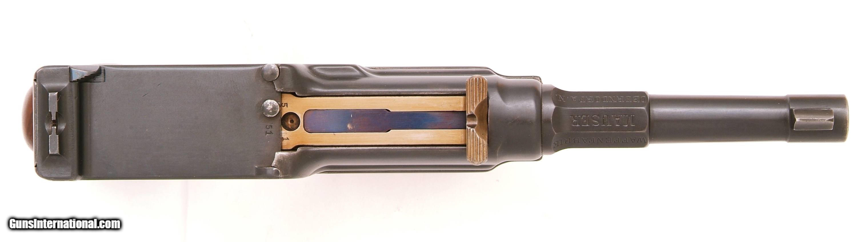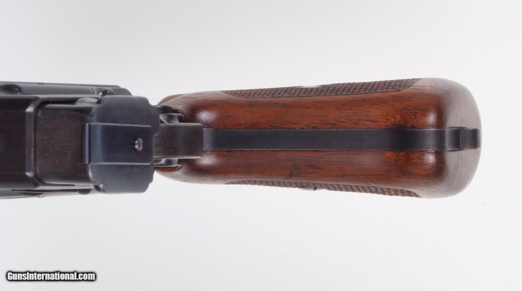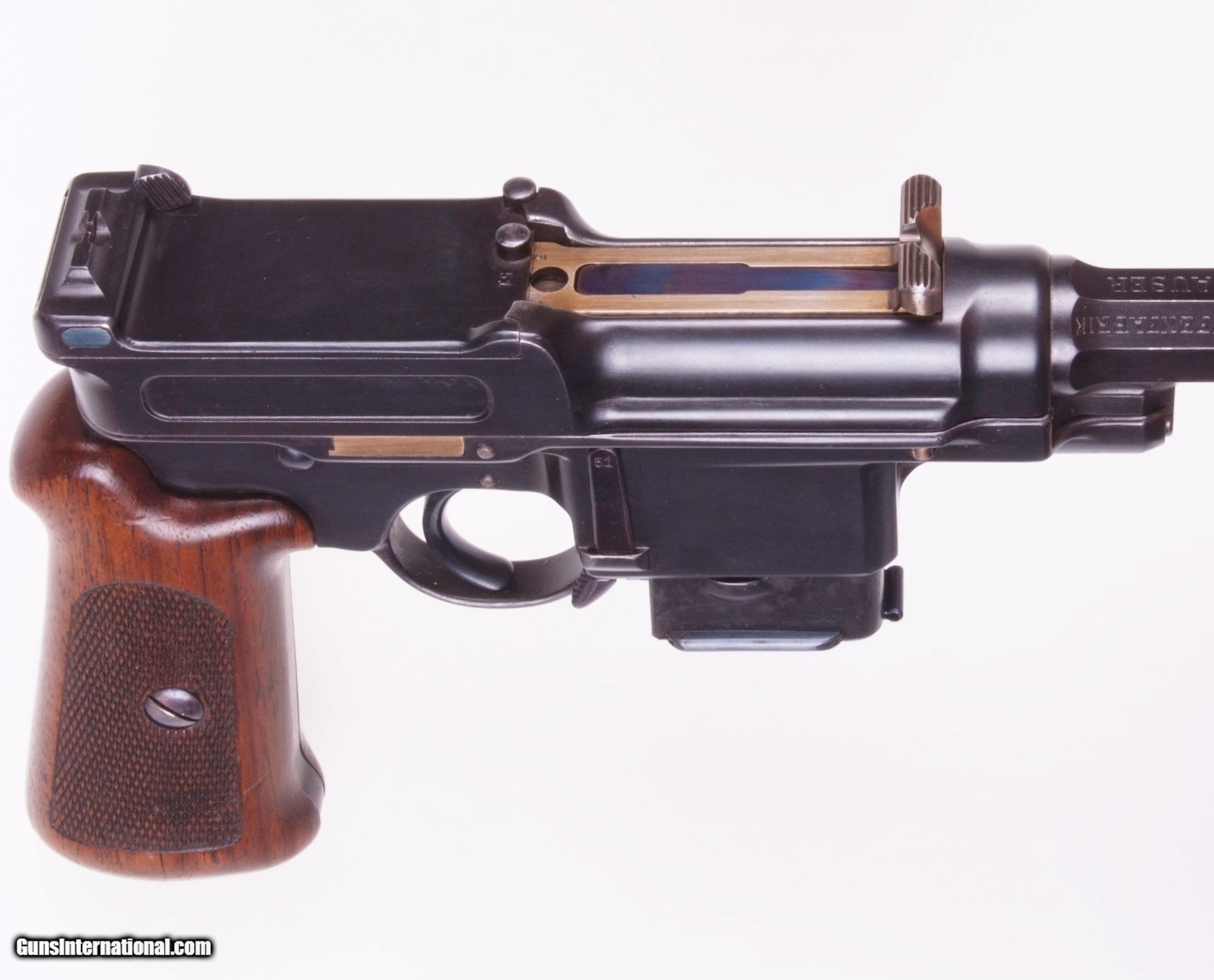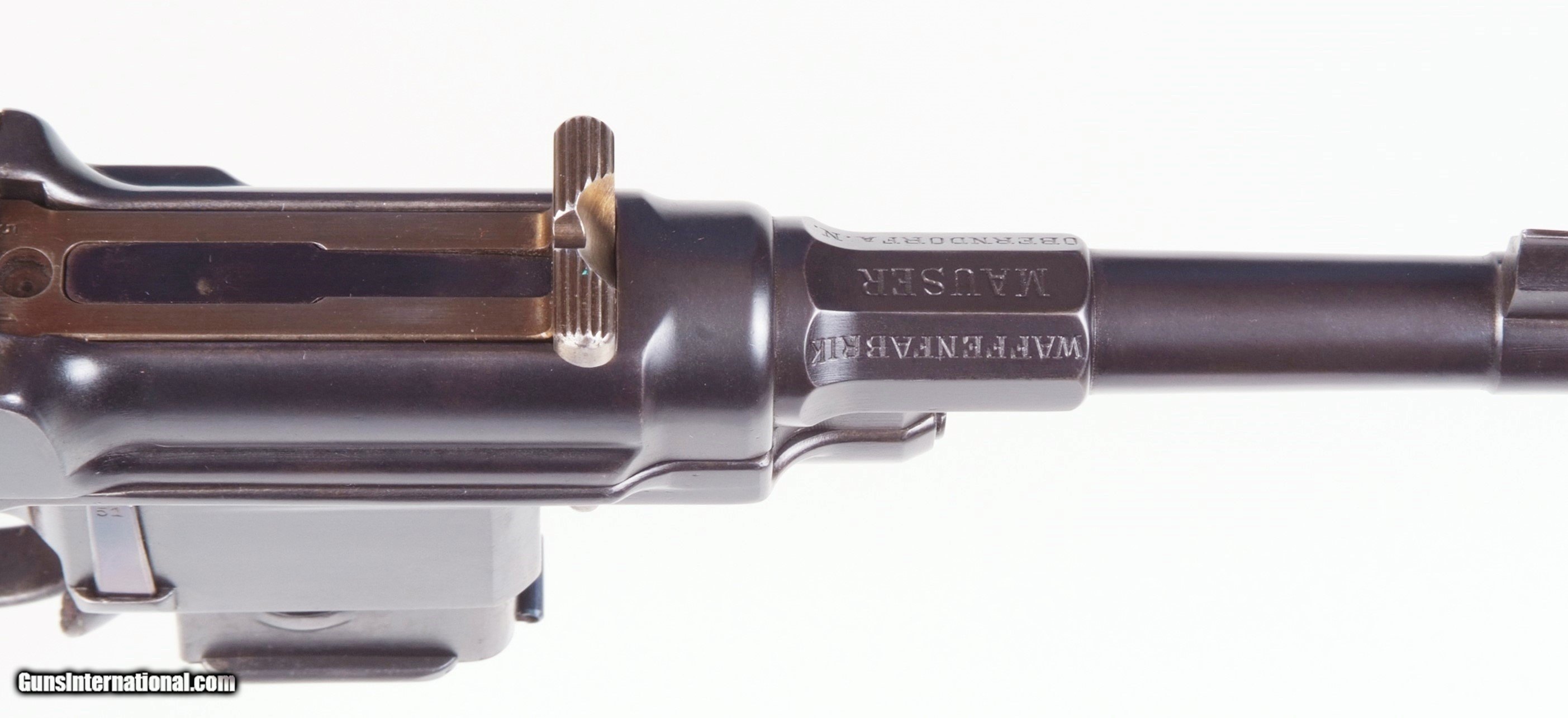 Description: This 2nd variation pistol has a 4" barrel with a banded front sight and a half round-half octagonal barrel whose chamber is hand inscribed "WAFFENFABRIK / MAUSER OBERNDORF A.N.". Major components are rust blued. Bolt is strawed while the extractor, safety, safety release button, trigger, magazine retention spring and grip screw are fire-blued. Disassembly shows all matching numbers except for the magazine whose body is numbered "142" and whose fire-blued base is numbered"72". Impeccable provenance with previous owners including Henk Visser and and Dr. Geoffrey Sturgess. Exact gun illustrated in the Borchardt & Luger Automatic Pistols, Vol 1-3 book but with a 20-shot magazine. Synopsis: Super rare and well documented Mauser M1906-08 experimental pistol, one of fewer than 100 made (highest recorded number is 77), and the first Mauser to have a flap-locked mechanism. Condition: Superb professional restoration with deep chamber markings, flat planes, sharp edges. Major parts with correct rust blue; enhanced fire blue on the small parts. Original grip retaining much of its original varnish. Slight blunting of checkering. Bright bore with sharp rifling. Perfect manual mechanics . One of the most unusual, recognizable and desirable pistols ever made by Mauser that could easily be the centerpiece of any early automatic pistol collection. A HISTORIC INVESTMENT! ~~Insured shipping fee of $155; most packages shipped using FedEx 2nd Day.~~ SOLD Curio/Relic: Yes Manufacturer: Mauser Serial Number: 51 Caliber Info: 9x25 mm |
