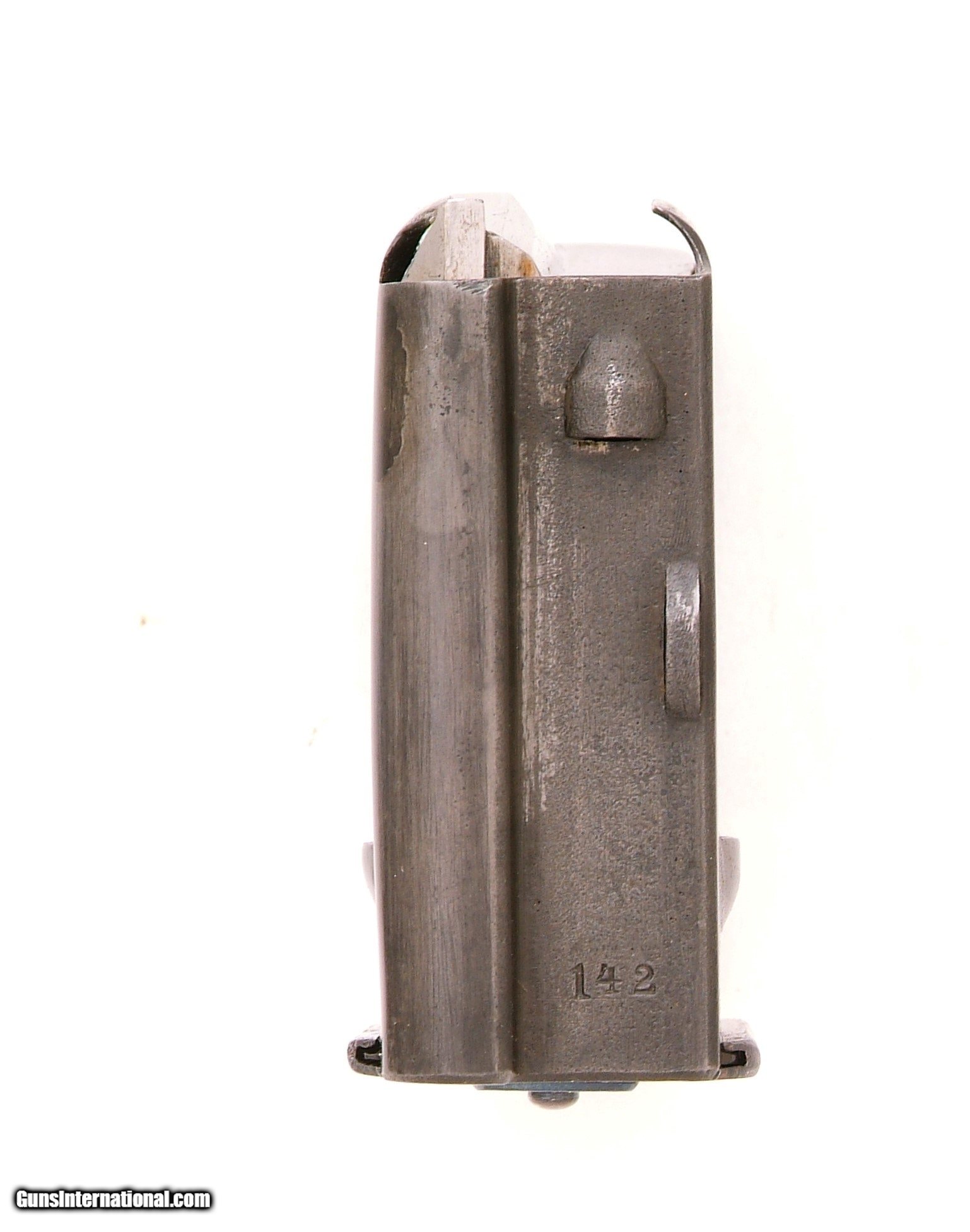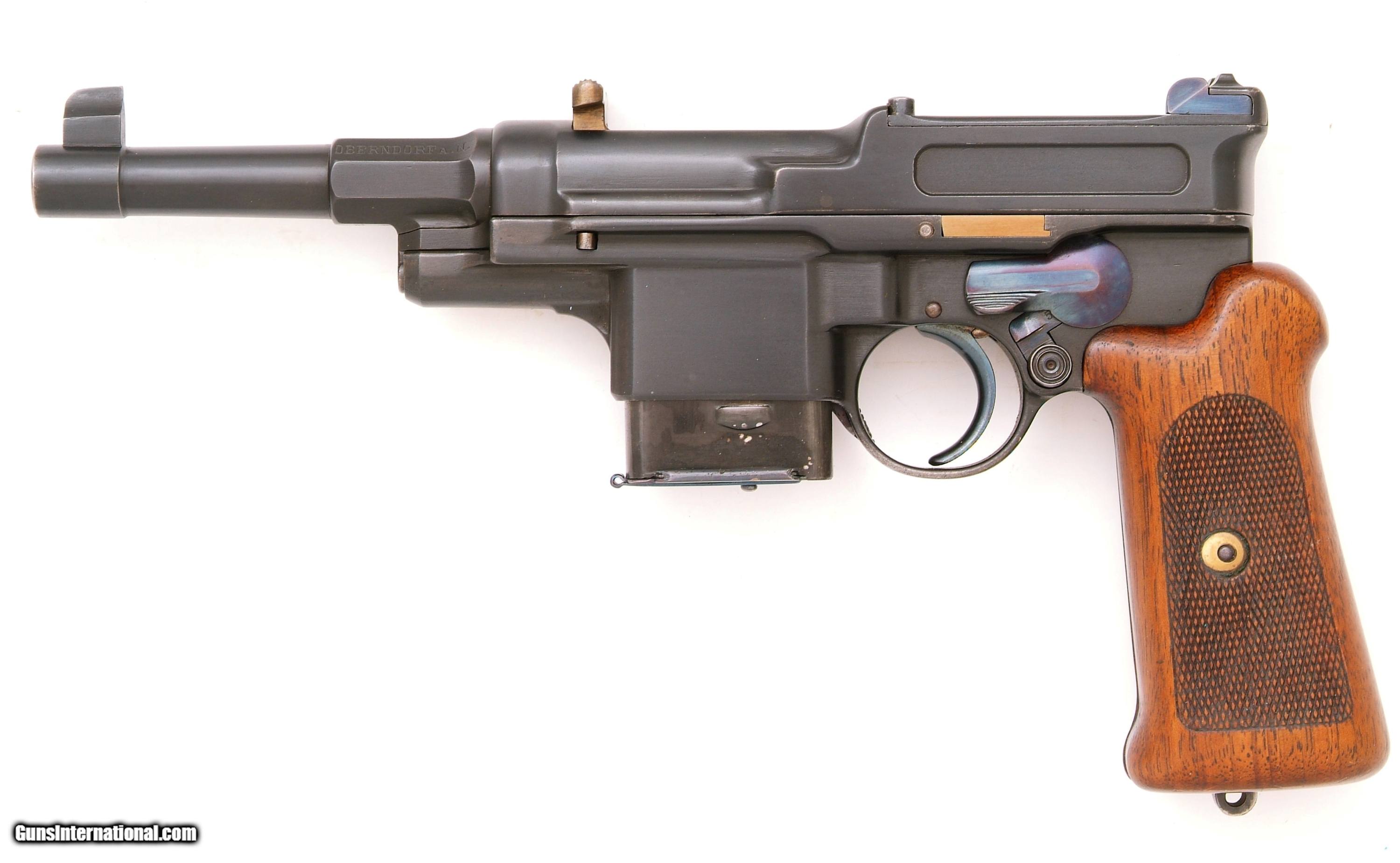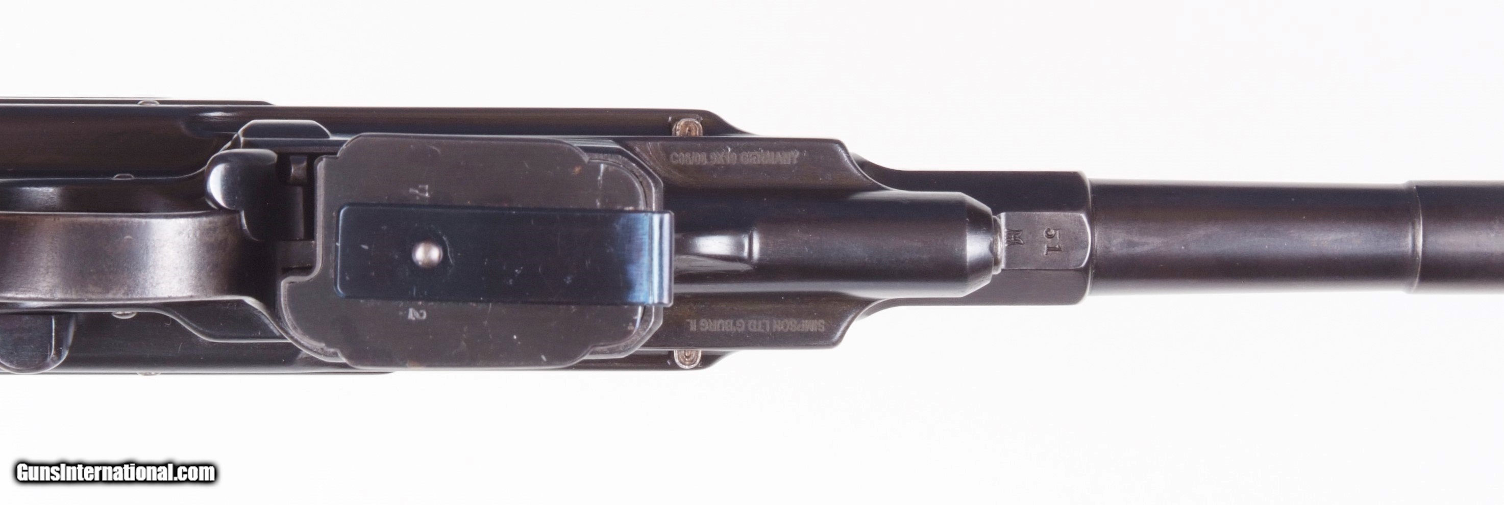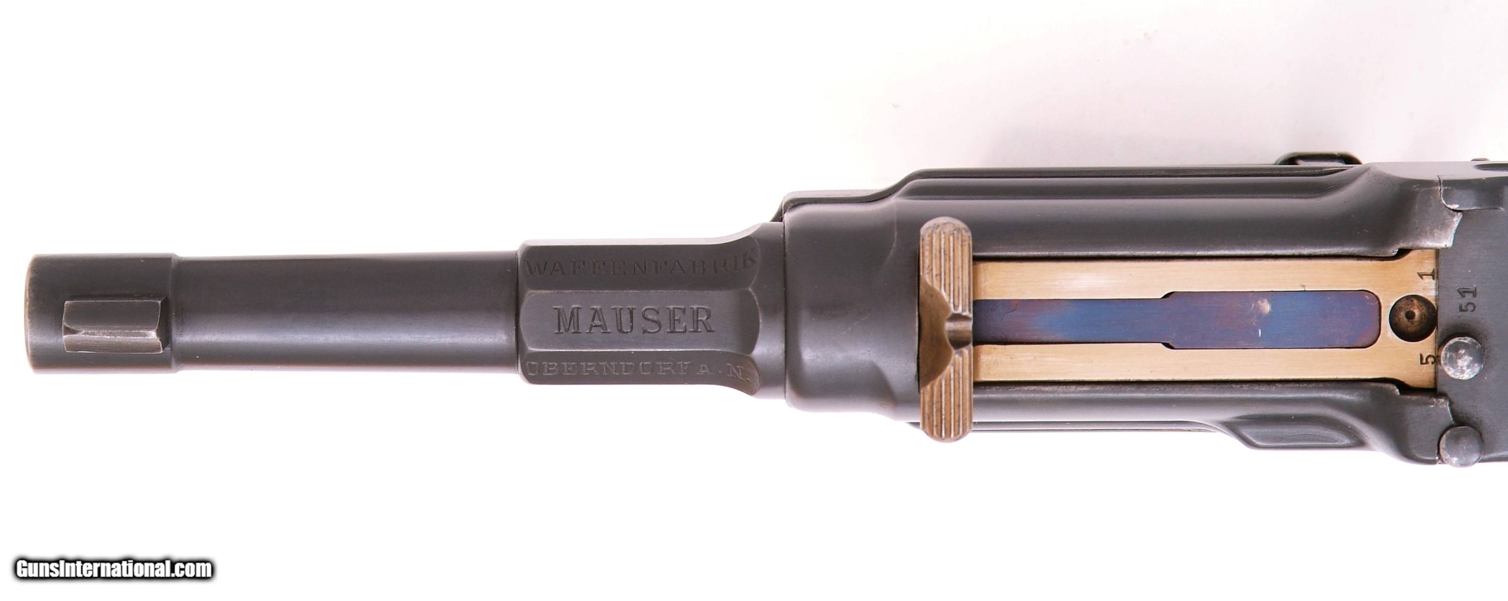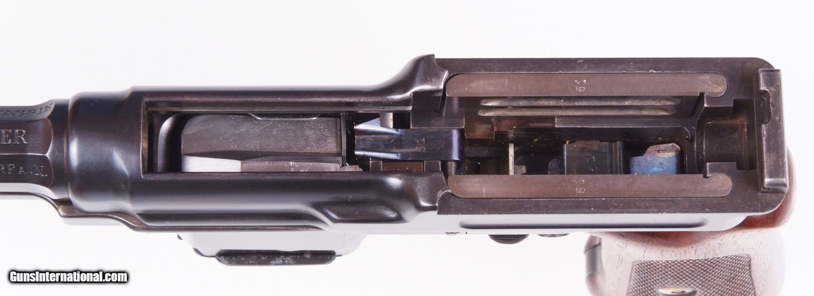 Description: This 2nd variation pistol has a 4" barrel with a banded front sight and a half round-half octagonal barrel whose chamber is hand inscribed "WAFFENFABRIK / MAUSER OBERNDORF A.N.". Major components are rust blued. Bolt is strawed while the extractor, safety, safety release button, trigger, magazine retention spring and grip screw are fire-blued. Disassembly shows all matching numbers except for the magazine whose body is numbered "142" and whose fire-blued base is numbered"72". Impeccable provenance with previous owners including Henk Visser and and Dr. Geoffrey Sturgess. Exact gun illustrated in the Borchardt & Luger Automatic Pistols, Vol 1-3 book but with a 20-shot magazine. Synopsis: Super rare and well documented Mauser M1906-08 experimental pistol, one of fewer than 100 made (highest recorded number is 77), and the first Mauser to have a flap-locked mechanism. Condition: Superb professional restoration with deep chamber markings, flat planes, sharp edges. Major parts with correct rust blue; enhanced fire blue on the small parts. Original grip retaining much of its original varnish. Slight blunting of checkering. Bright bore with sharp rifling. Perfect manual mechanics . One of the most unusual, recognizable and desirable pistols ever made by Mauser that could easily be the centerpiece of any early automatic pistol collection. A HISTORIC INVESTMENT! ~~Insured shipping fee of $155; most packages shipped using FedEx 2nd Day.~~ SOLD Curio/Relic: Yes Manufacturer: Mauser Serial Number: 51 Caliber Info: 9x25 mm |