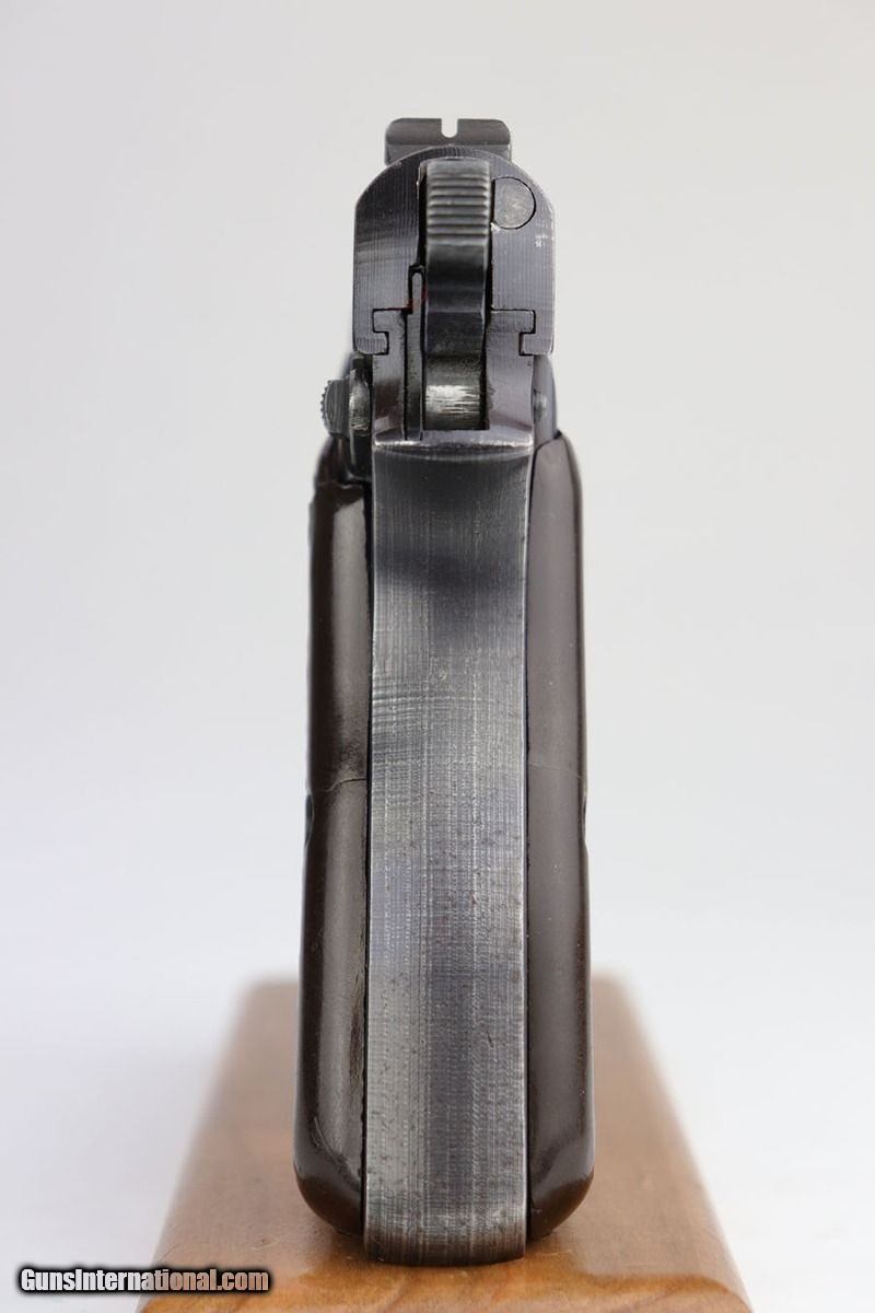Description: This is an all matching and original late-war example of the FN Browning High Power, as issued to the German Army. There's a uniform thinning to the finish on the slide and frame, but no major centralized areas of wear. Mint bore with excellent unmarked magazine. The grips have a small chip in the left panel, and the upper area of the right panel is also a bit dinged up. SOLD Curio/Relic: Yes Manufacturer: FN Herstal Model: High Power Serial Number: 61976b Caliber Info: 9mm Condition: 85-90% Bore Condition: 9.5/10 Manufacture Date: ~1944 |