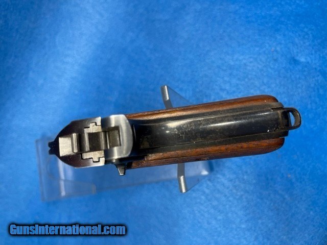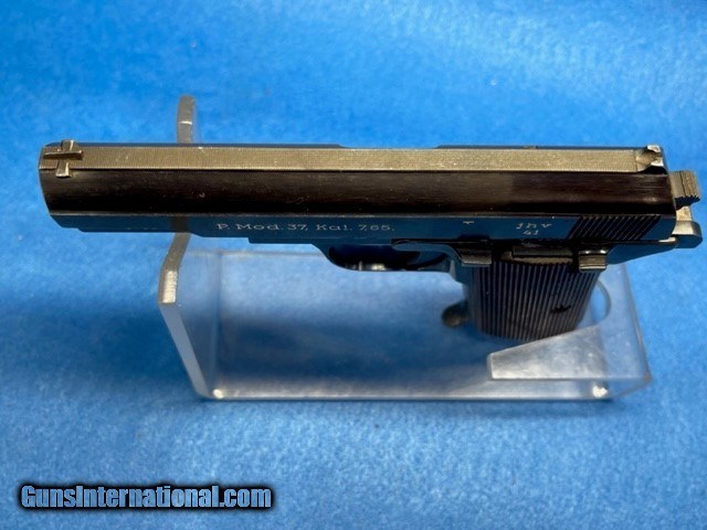 Description: PRISTINE FEMARU MDL. 37M, "1ST. VARIATION" RIG, CAL. .32ACP, SER. 8905. THIS "HOLSTER QUEEN" A FAVORITE OF THE LUFTWAFFE LOOKS AS IF IT NEVER LEF A HOLSTER ALL DURINGTHE WAR .. RETAINING ABOUT 99+% OF THE ORIGINAL BLUED FINISH. THE SLIDE ALSO SHOWS THE EARLY TWO TONE CASE HARDENED FRAME.FRAME.THE LITTLE LOSS OF FINISH IT HAS IS DUE TO SHARP EDGE SILVERING FROM HOLSTER WEAR. THERE ARE NO PITS, RUST, SPOTS, RUB MARKS OR SCRATCHES ANYWHERE. THE GRIP STRAP SHOW NO SIGN OF GRAYING..THE FRAME.SLIDE AND BARREL MATCH AND ALL HAVE THE PROPER WAFFENAMTS**. THE STRIATED WOODEN GRIPS ARE ASOLUTELY PERFECT AS IS THE GRIP SCREW. THE SLIDE RAILS, BOLT FACE AND FEED RAMP AND MAGAZINE FOLLOWER SHOW LITTLE IF ANY USE AT ALL.THE BORE IS PRISTINE LIKE THE REST OF THE GUN, MIRROR BRIGHT WITH RAZOR SHARP RIFLING. NOT A WHISP OF FROST ANYWHERE. IT COMES WITH TWO ORIGINAL MAGAZINES STAMPED "M37 AND A LEATHER HOLSTER THAT DOES SHOW A FIELD REPAIR..THIS PRISTINE "HOLSTER QUEEN" WITH THE TWO MAGAZINEWOULD SATISFY THE MOST CRITICAL COLLECTOR AND COULD EASILY BE A CENTERPIECE OF ANY WWII MILITARY GUN COLLECTION. INVESTMENT PRICED AT..... $1695**. *THE HARMLESS WHITE WAX CRAYON IS TO SHOW THE MARKINGS ARE CORRECT. IT IS EASY TO REMOVE WITH LIGHTER FLUID AND A BRUSH. WE WILL DO IT ON REQUEST. ***100% 0F THE GUN'S PRICE IS SATISFACTION GURANTEED SOLD Curio/Relic: Yes Handgun Caliber: .32 ACP (7.65x17mm Browning SR) |