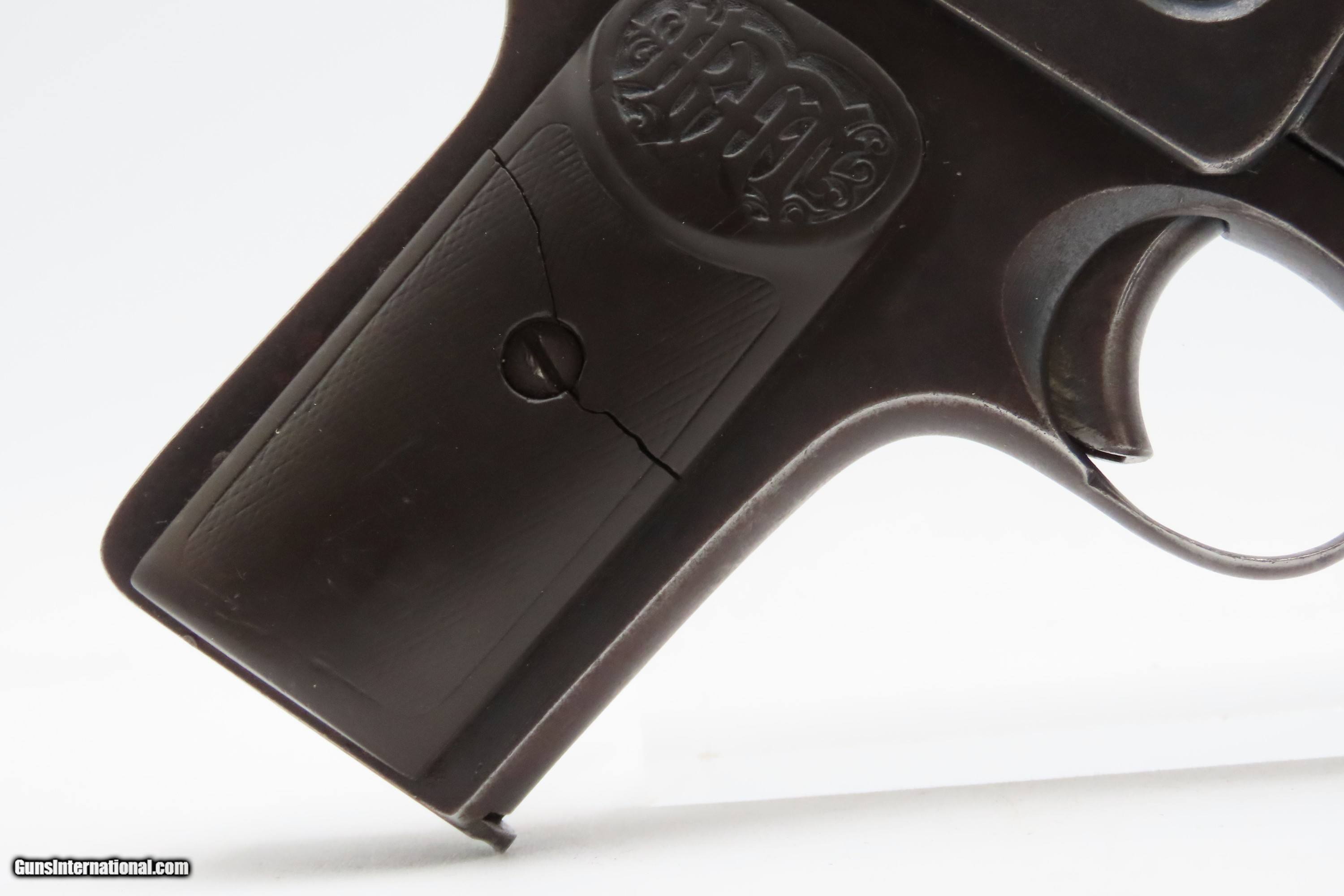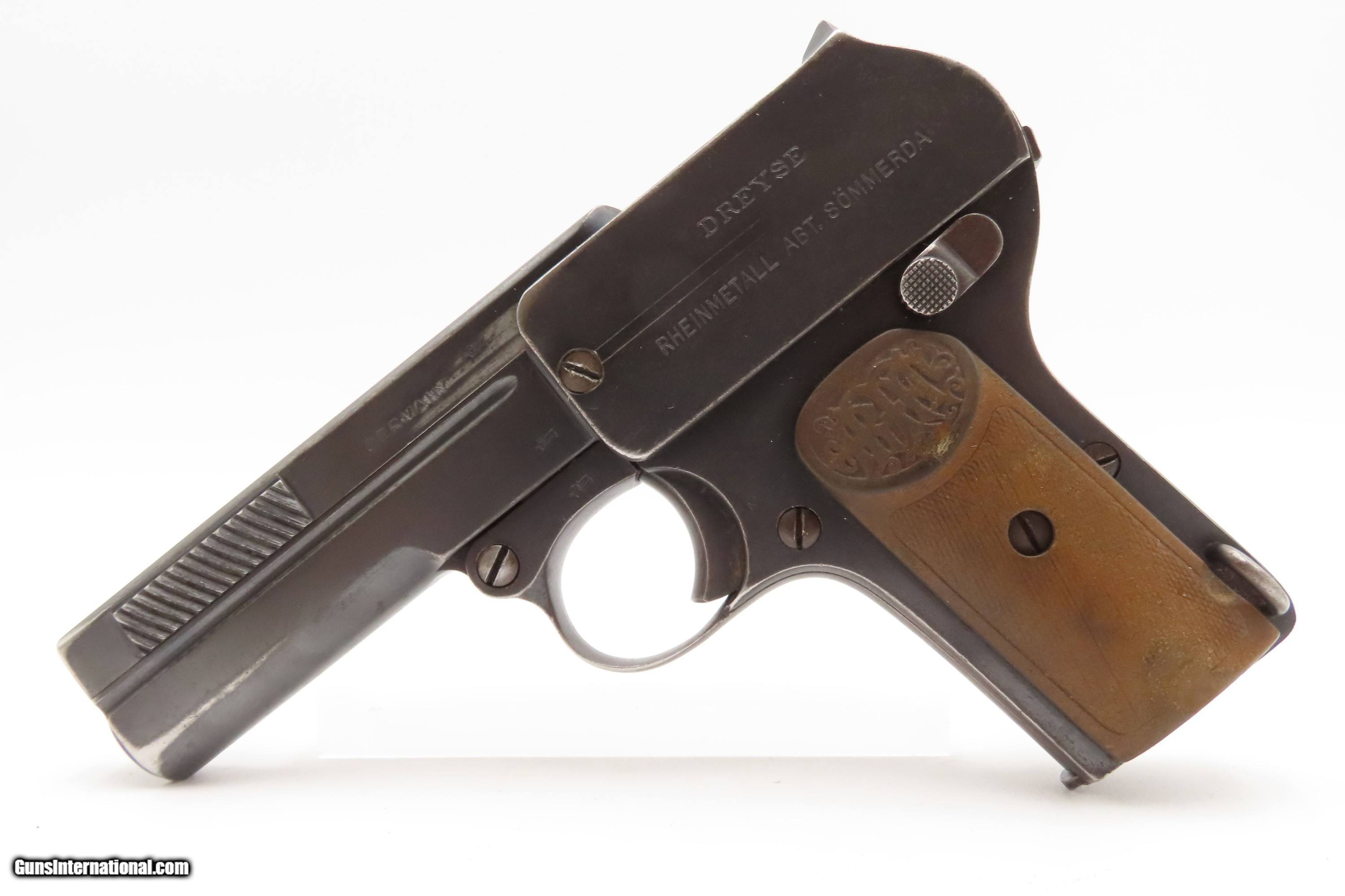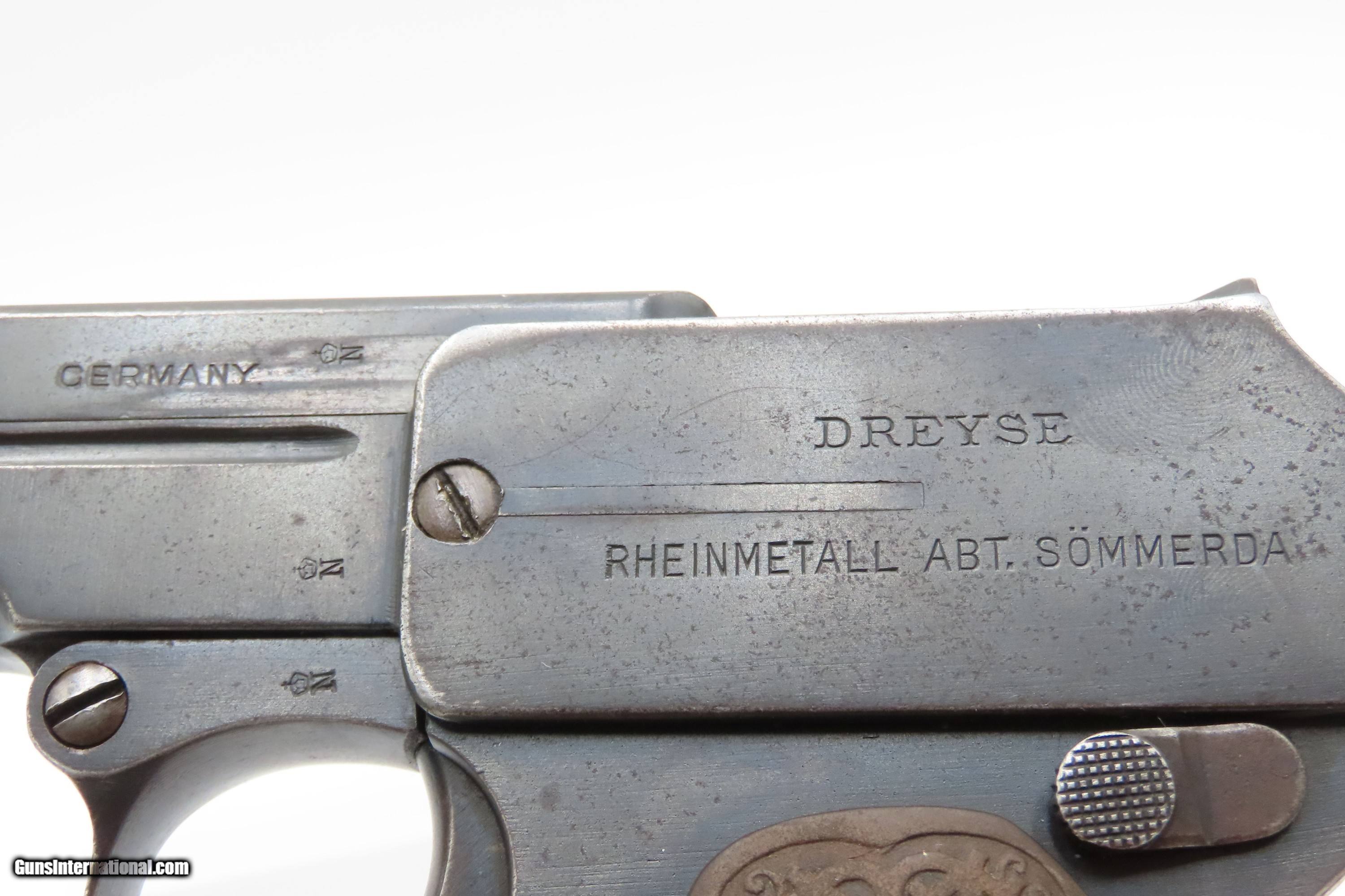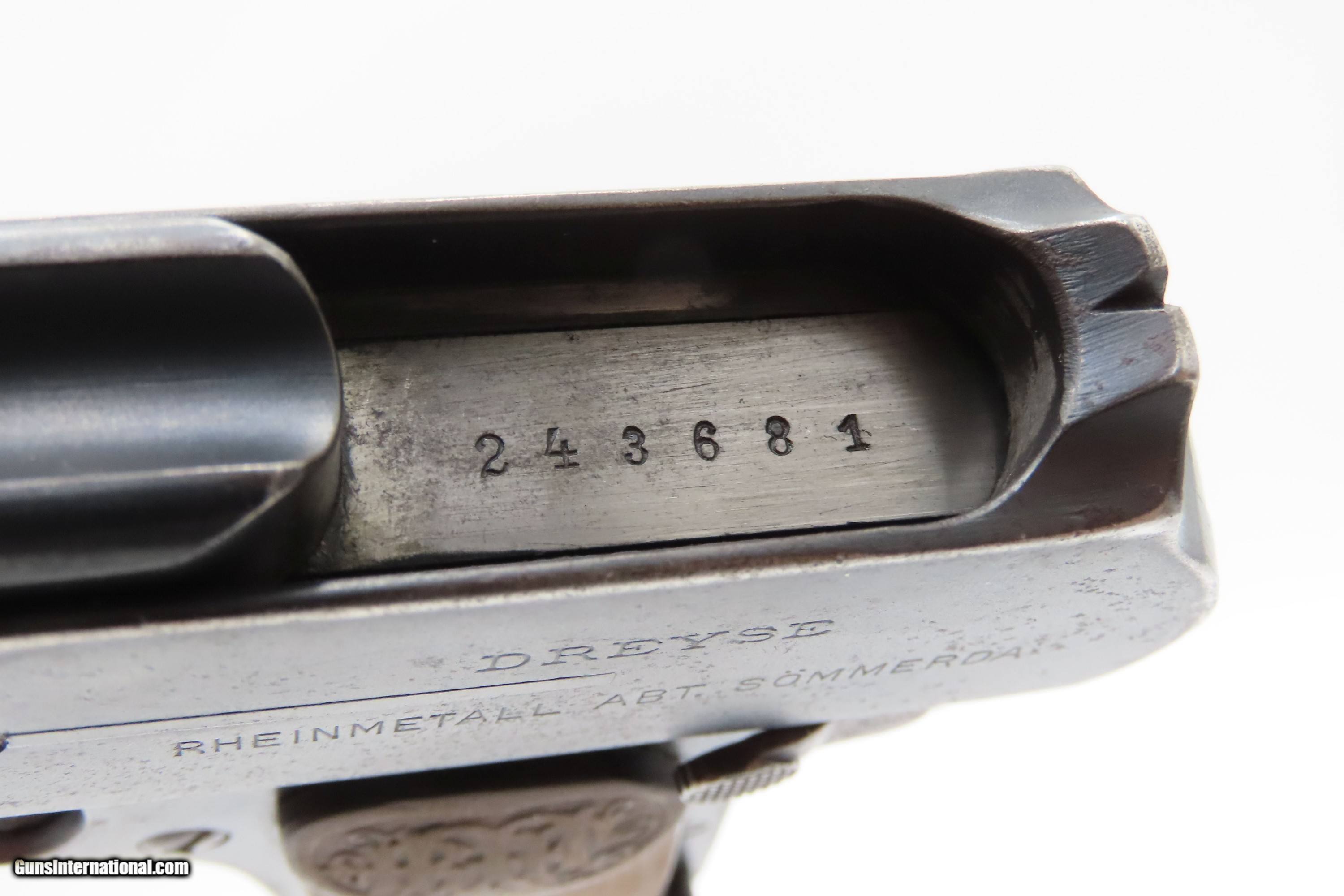 Description: RHEINMETALL Dreyse M1907 7.65 Semi-Automatic SELF-DEFENSE Pistol C&R Small Conceal & Carry Pistol Made Circa 1910 Here we present a C&R Rheinmetall Dreyse Model 1907 Semi-Automatic Pistol, made circa 1910 in Sömmerda, Germany with a production run between 1907 and 1915. The Rheinische Metallwaaren & Maschinenfabrik (RM&M, later known as Rheinmetall) of Sömmerda was an engineering firm founded in 1889 that primarily made field artillery. In 1901 they purchased Waffenfabrik von Dreyse, a manufacturer of sporting rifles and revolvers which had fallen on hard times. Thereafter, RM&M used the Dreyse name for its small arms production, including machine guns and pistols. The Waffenfabrik von Dreyse was founded around 1841 to manufacture the famous Dreyse Needle gun for the Prussian Army, and they also made needle-pistols and caplock revolvers. The Dreyse Factory went into decline after the German Army adopted the Mauser in 1872. The Dreyse Model 1907 is a semi-automatic pistol designed by Louis Schmeisser. The gun was named after Nikolaus von Dreyse, the designer of the Dreyse Needle Gun. The pistol had an interesting feature for the time, that when the gun was ready to fire, the firing pin projected through the back of the breech block, serving as an early handgun-cocking indicator. The pistol and its derivatives, which were the Dreyse Model 1907 Pocket Pistol and the Dreyse Model 1912 Parabellum, all had a simple blowback recoil operation, though of unusual design. The same company also manufactured a 6.35mm pocket version (also named Model 1907). In 1912 the 9 mm Parabellum Dreyse Model 1912 emerged as the gun's successor. Marked as the RM & M Dreyse, it was chambered for 9mm Parabellum. The overall condition is fine. Original finished is preserved. Strong action. The bore has dimmed with no remaining shimmer and is thinly rifled. Markings are sharp. The right grip is cracked and has a bit of wiggle. The left side is solid. Numbers match. “GERMANY” marked left slide. Own the original! This firearm is classified as a Curio & Relic. Barrel is 3-3/4 inches. Caliber: 7.65mm Auto (.32 ACP) Overall condition as seen in photos. Very Fast. Very Safe. FREE SHIPPING. Will need to be sent to your local FFL or C&R licensee. This firearm is classified as a Curio & Relic. Guaranteed AUTHENTIC & Includes CERTIFICATE OF AUTHENTICITY. ancestryguns $1200 #250036 SOLD Curio/Relic: Yes |