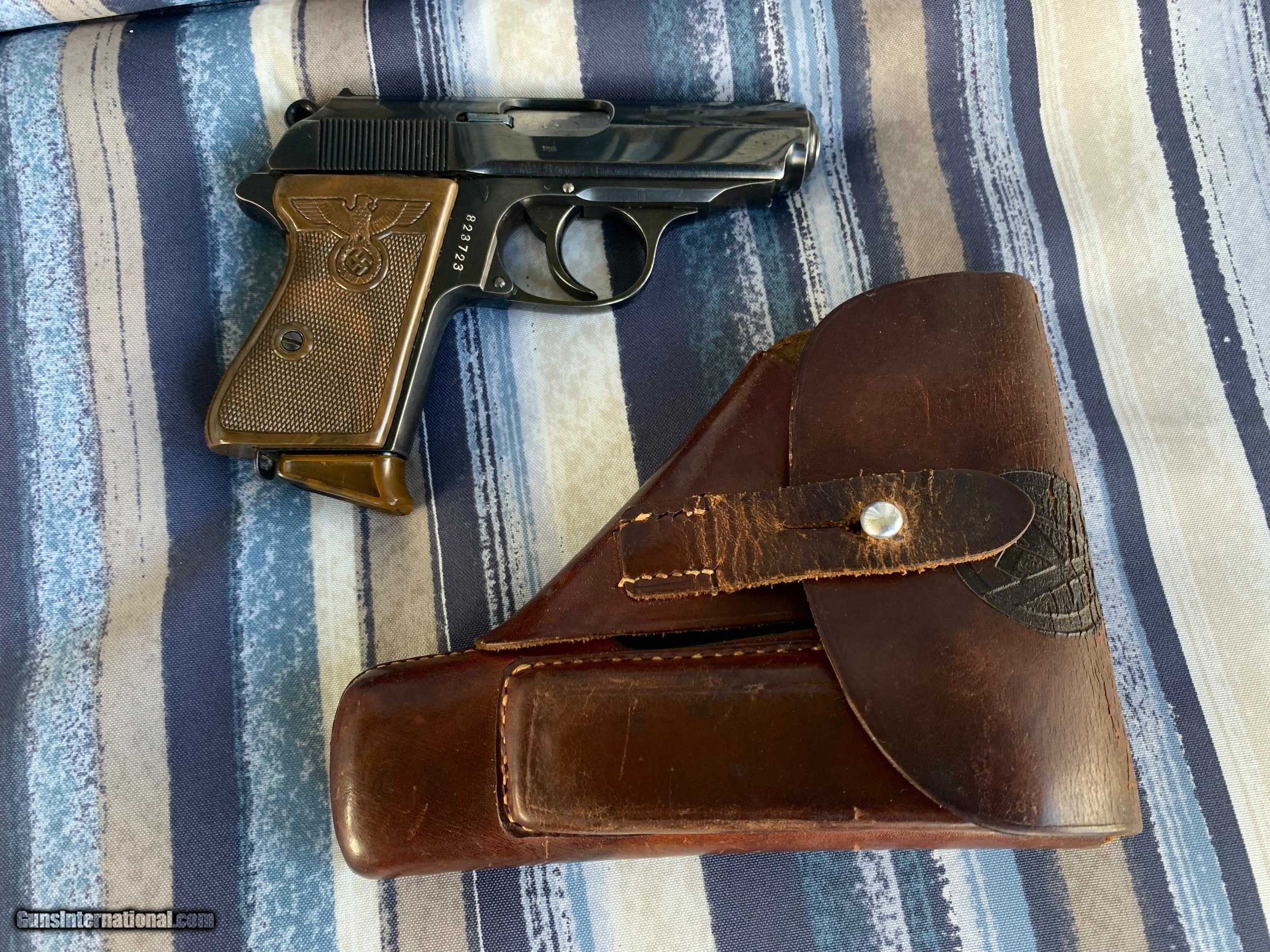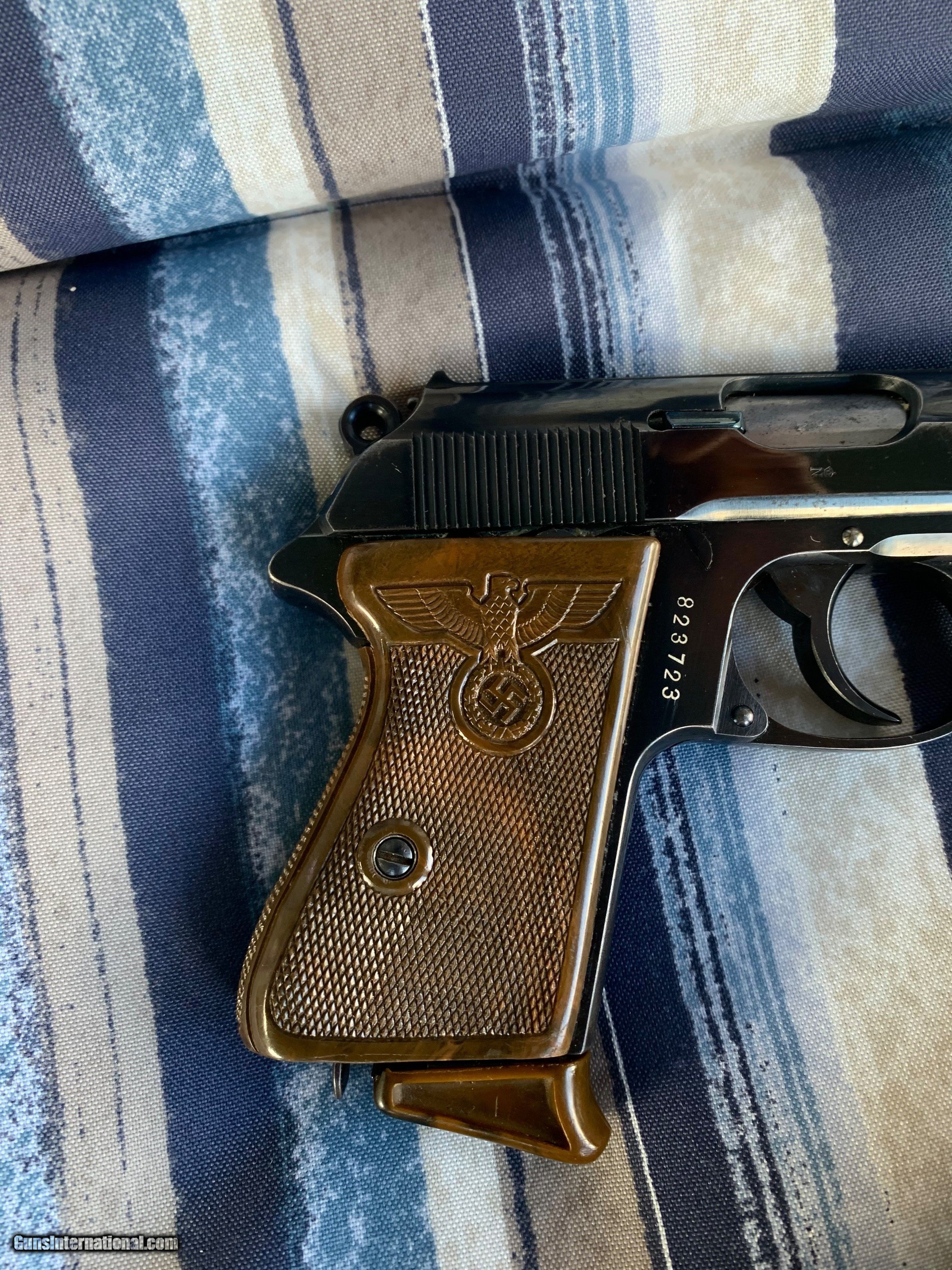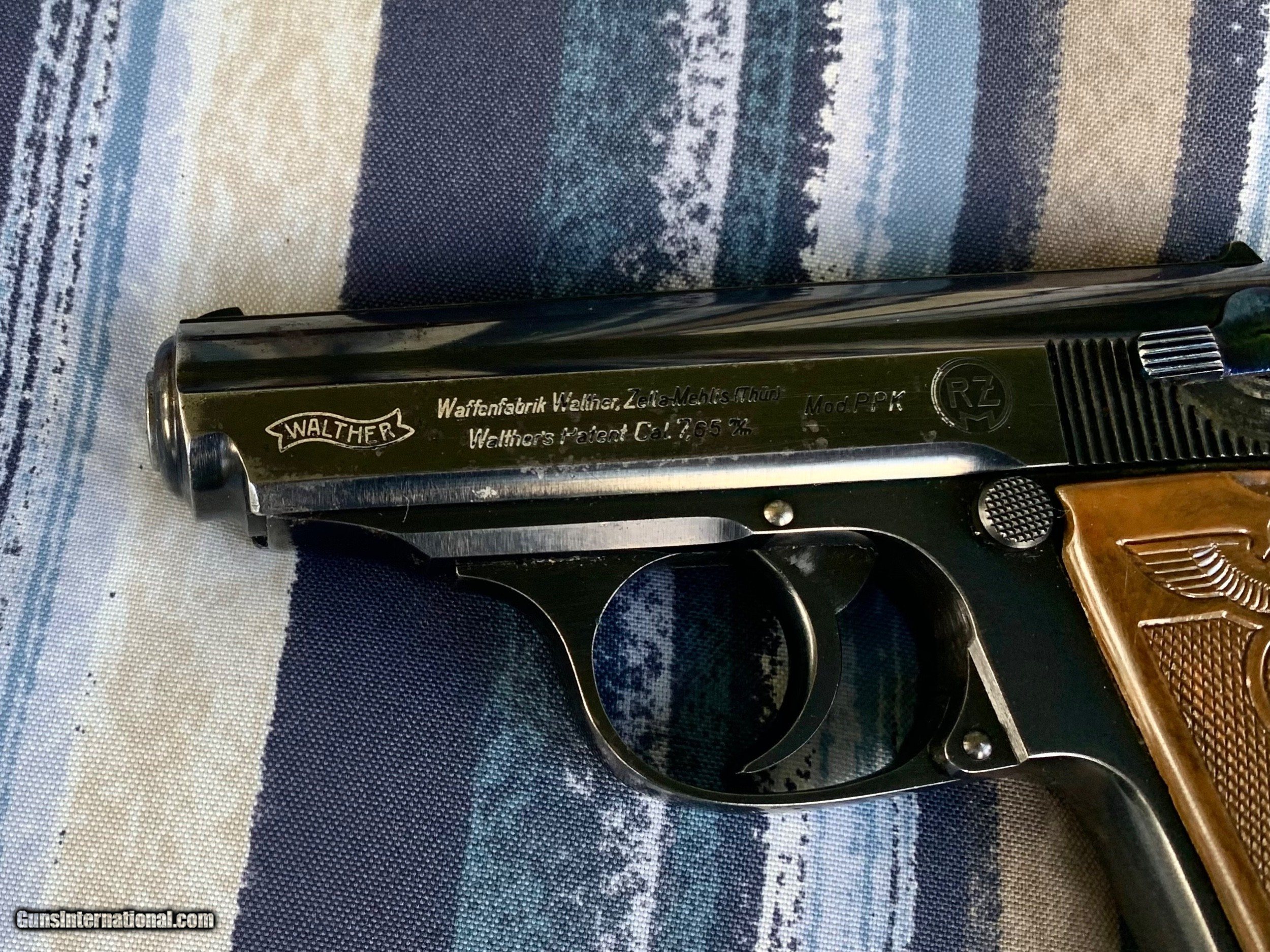 Description: Here's a WW2 German Nazi Party Leaders PPK with original holster and magazine . 32 caliber . Serial number 823723. My research shows that RZM Party Leader PPK's where only made between serial numbers 820000 to 845000 . Not sure on how many where made ? Condition is Excellent Plus Condition. Bore and mechanics are in Excellent Plus Condition. Gun has most all of its high polished blue finish . With mostly all holster wear on edges and on left side of gun. Gun is in unused mint condition mechanically. Grips are correct with reinforced metal plate inside grip. Grip does have a little slight hole at 12:00 on back of grip . Other that that grips are in excellent condition. Gun has correct original mag. Gun has original sights . Holster is in excellent original condition with some minor stressing of the leather mostly on the top of holster . Leather is in excellent condition still soft and subtle. Overall this is a Un-used Condition Example of a rare Walter PPK . Please review my photos and email me with any questions? 3 day inspection as allways! Thank you for looking Little Jo SOLD Curio/Relic: Yes Handgun Caliber: .32 ACP (7.65x17mm Browning SR) Manufacturer: Walter Model: PPK Serial Number: 823723 Barrel Length: Mint Condition: Crisp Example! |