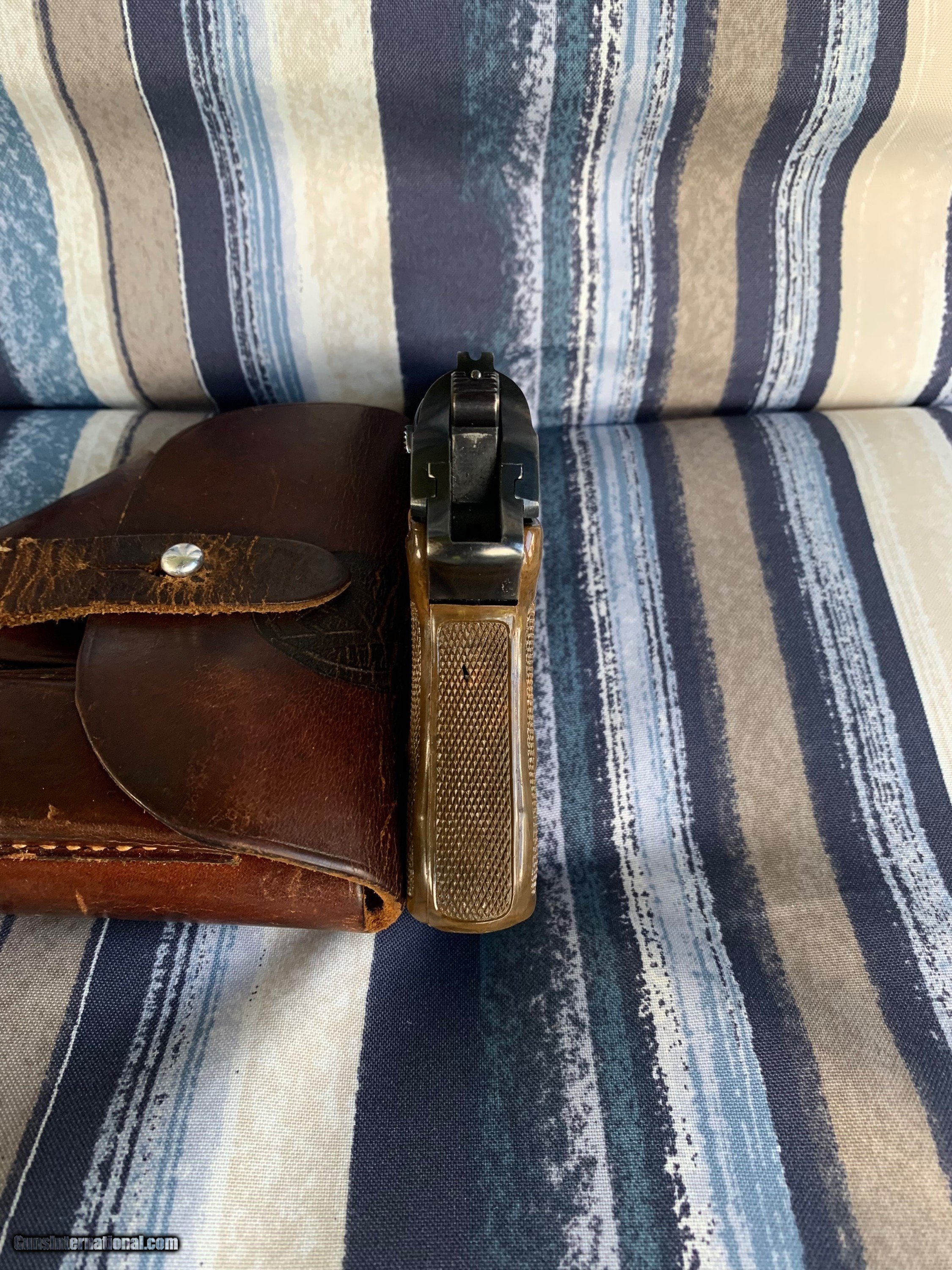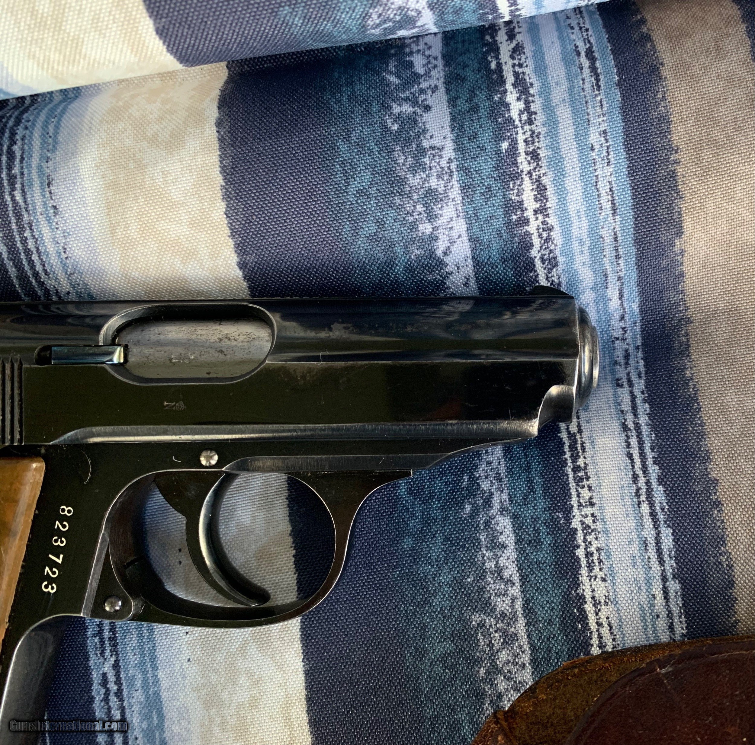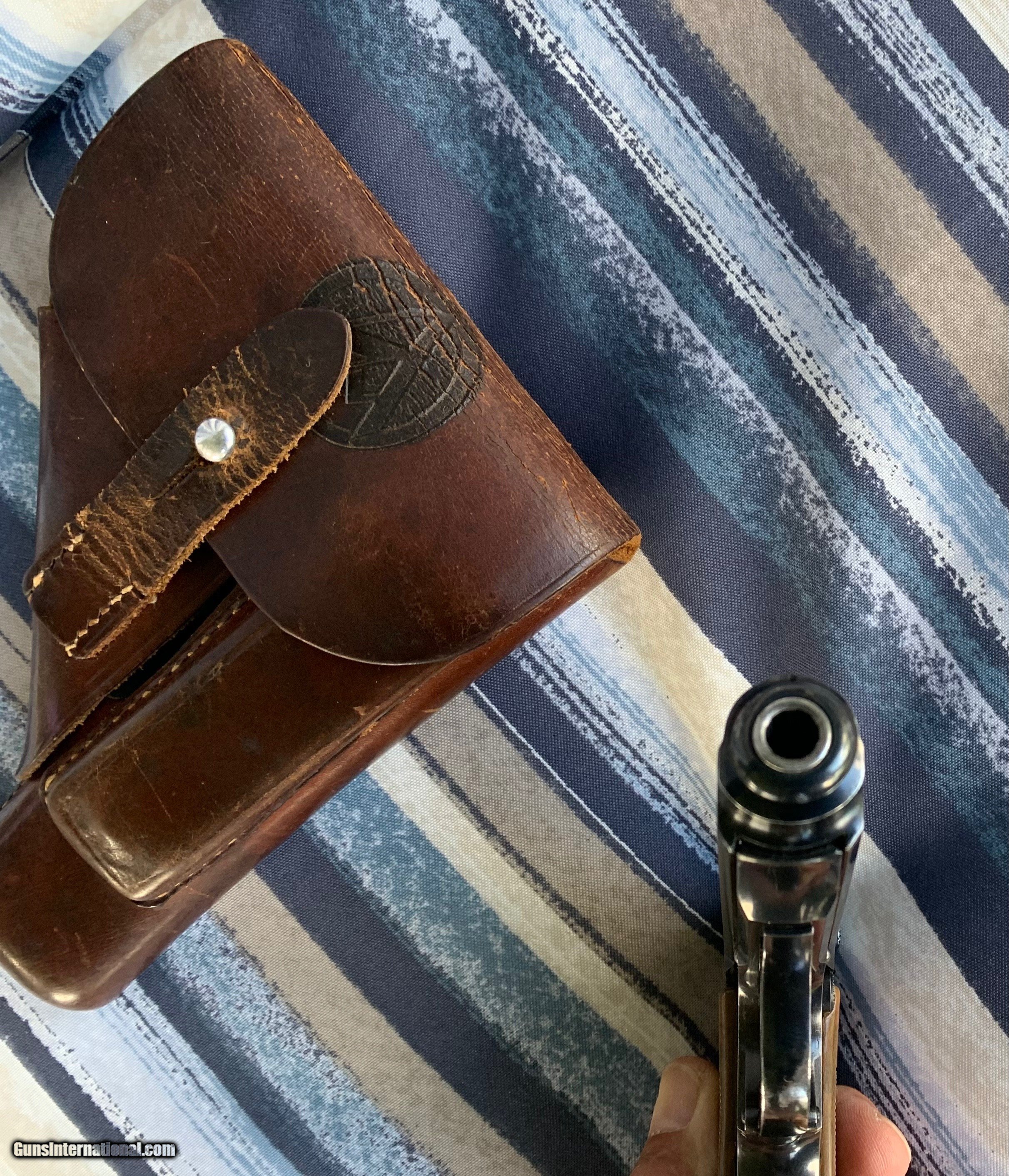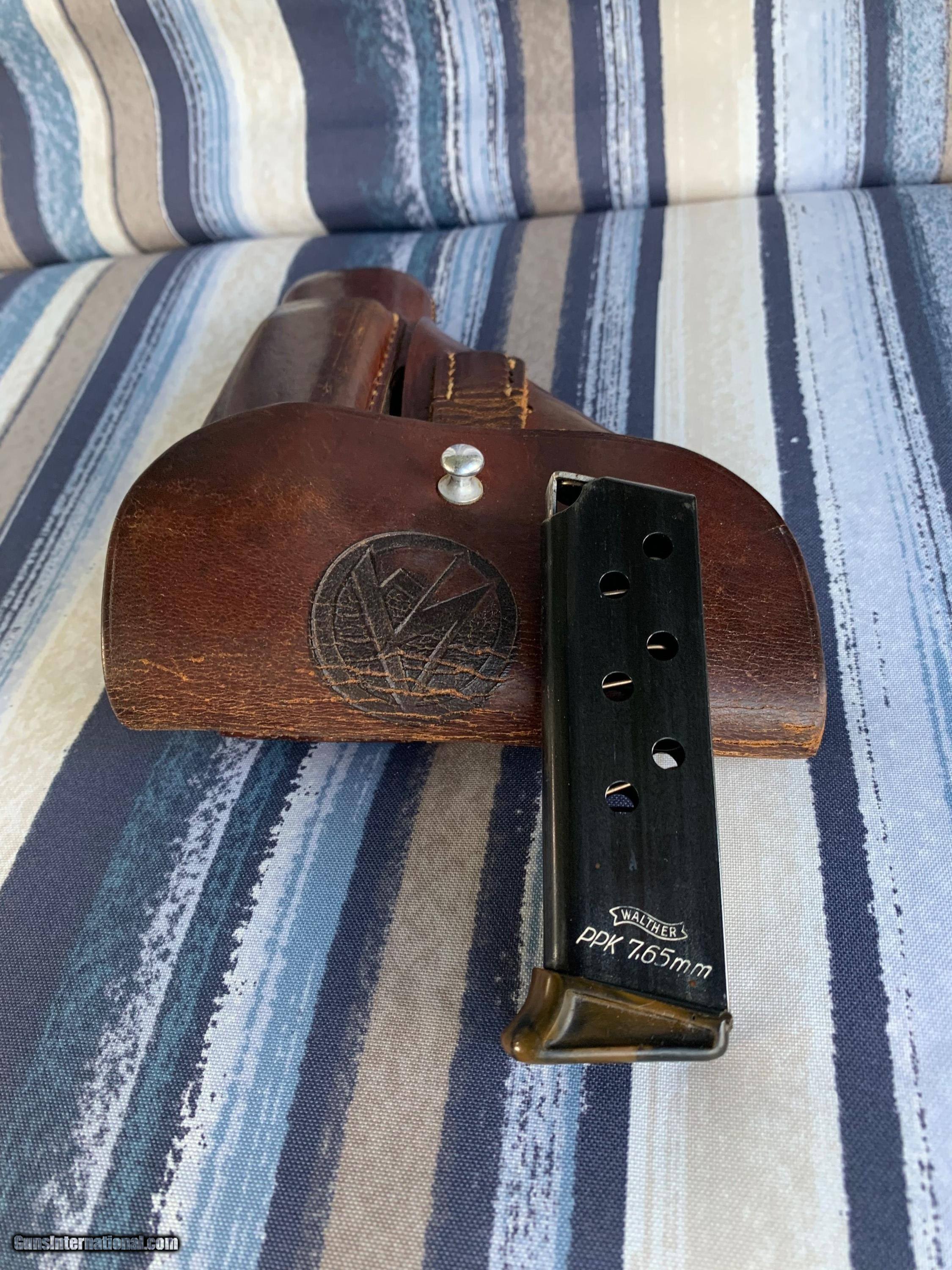 Description: Here's a WW2 German Nazi Party Leaders PPK with original holster and magazine . 32 caliber . Serial number 823723. My research shows that RZM Party Leader PPK's where only made between serial numbers 820000 to 845000 . Not sure on how many where made ? Condition is Excellent Plus Condition. Bore and mechanics are in Excellent Plus Condition. Gun has most all of its high polished blue finish . With mostly all holster wear on edges and on left side of gun. Gun is in unused mint condition mechanically. Grips are correct with reinforced metal plate inside grip. Grip does have a little slight hole at 12:00 on back of grip . Other that that grips are in excellent condition. Gun has correct original mag. Gun has original sights . Holster is in excellent original condition with some minor stressing of the leather mostly on the top of holster . Leather is in excellent condition still soft and subtle. Overall this is a Un-used Condition Example of a rare Walter PPK . Please review my photos and email me with any questions? 3 day inspection as allways! Thank you for looking Little Jo SOLD Curio/Relic: Yes Handgun Caliber: .32 ACP (7.65x17mm Browning SR) Manufacturer: Walter Model: PPK Serial Number: 823723 Barrel Length: Mint Condition: Crisp Example! |