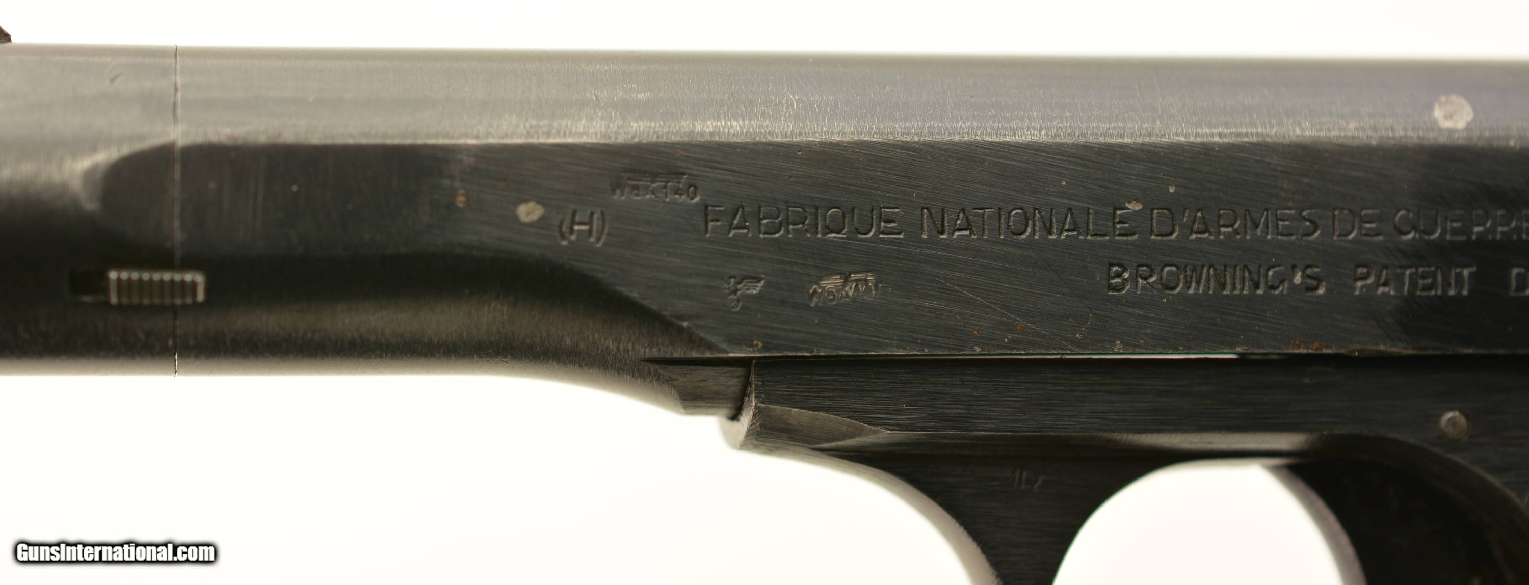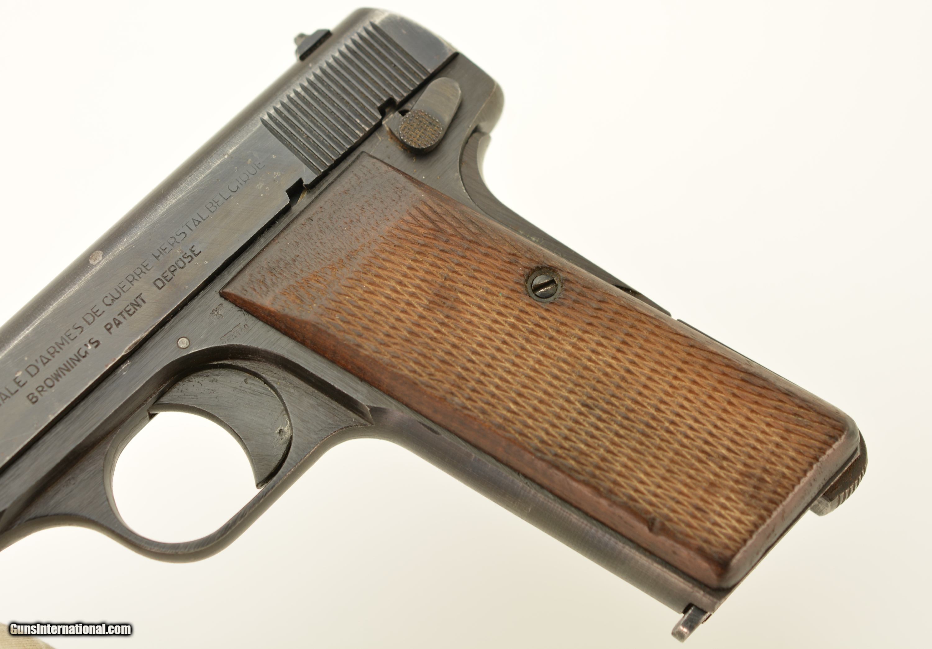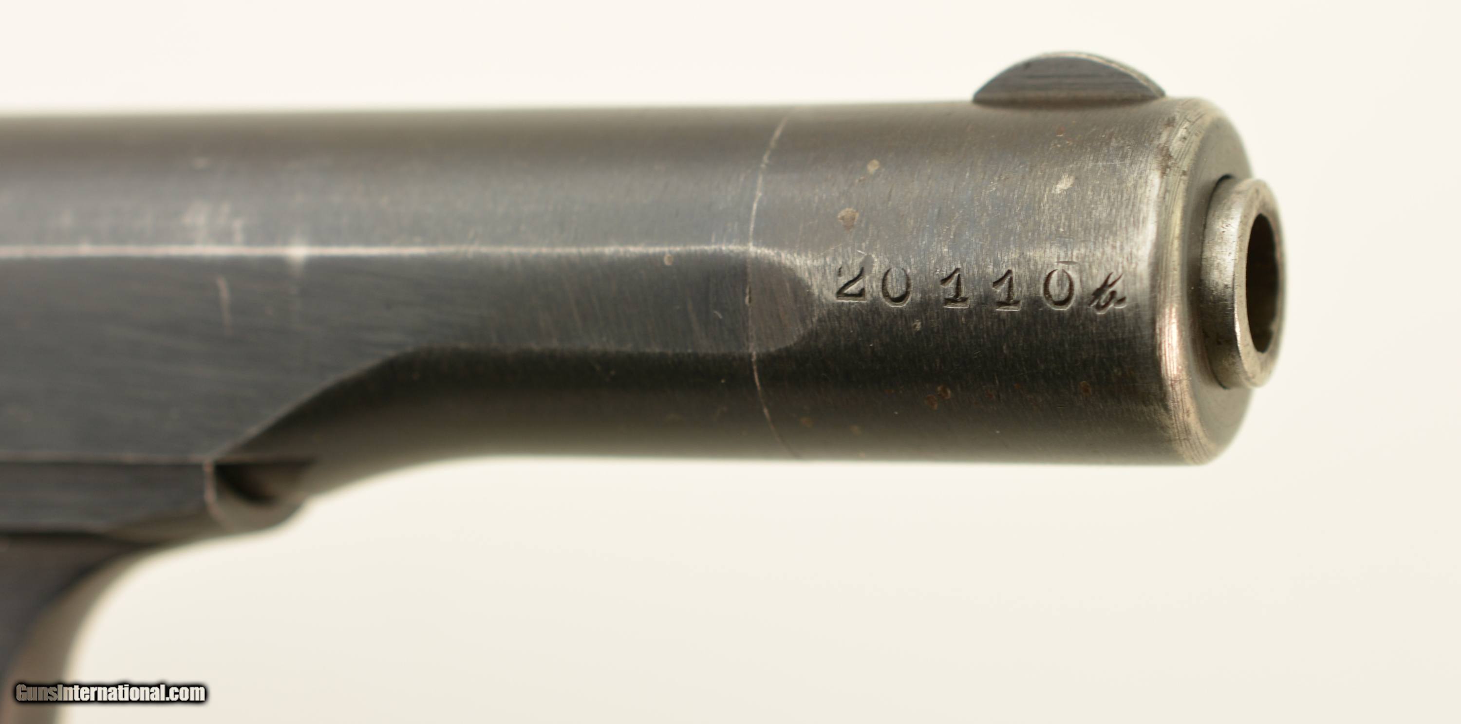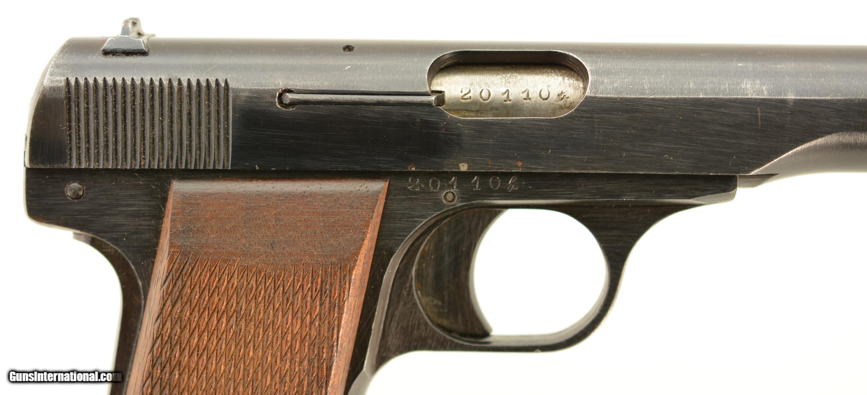 Description: Serial #20110b, .32 ACP, 4 1/2" barrel with a fine, bright bore that has some trace freckling within the grooves. The metal surfaces of this all-matching numbered pistol retain about 90-92% of the original blue with silvering at the muzzle, along the high and exposed edges, and on the bearing surfaces. The barrel remains mostly armory bright, and all markings are intact and strong with proper eagle firing proofs and "(Eagle) / WaA140" Waffenamts. The checkered walnut grips remain in excellent condition only a few minor handling marks. A single correct, “FN" marked magazine is included, and the action is fully functional. This is a very nice example of a German-used FN pistol, and rates fine-near excellent overall. FFL or C&R SOLD Curio/Relic: Yes Manufacturer: FN Model: 1910/22 Serial Number: 20110b Caliber Info: .32 ACP Gauge Info: .32 ACP |