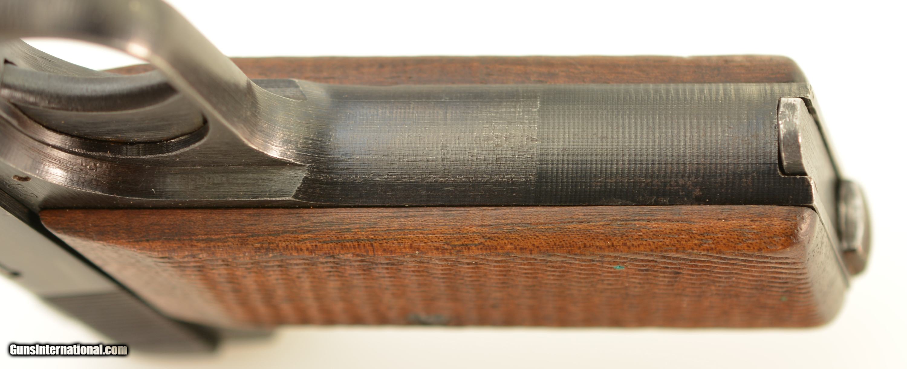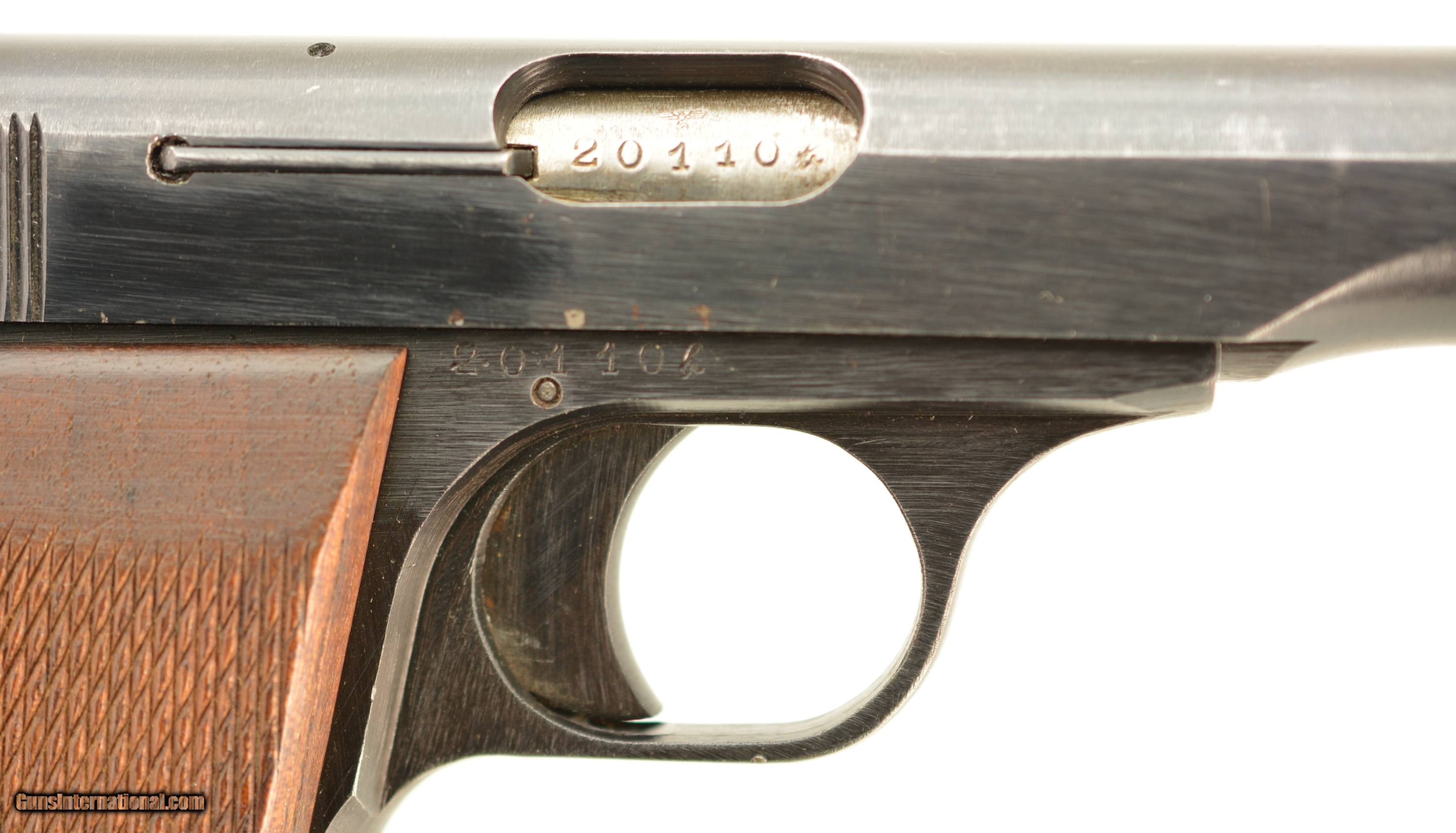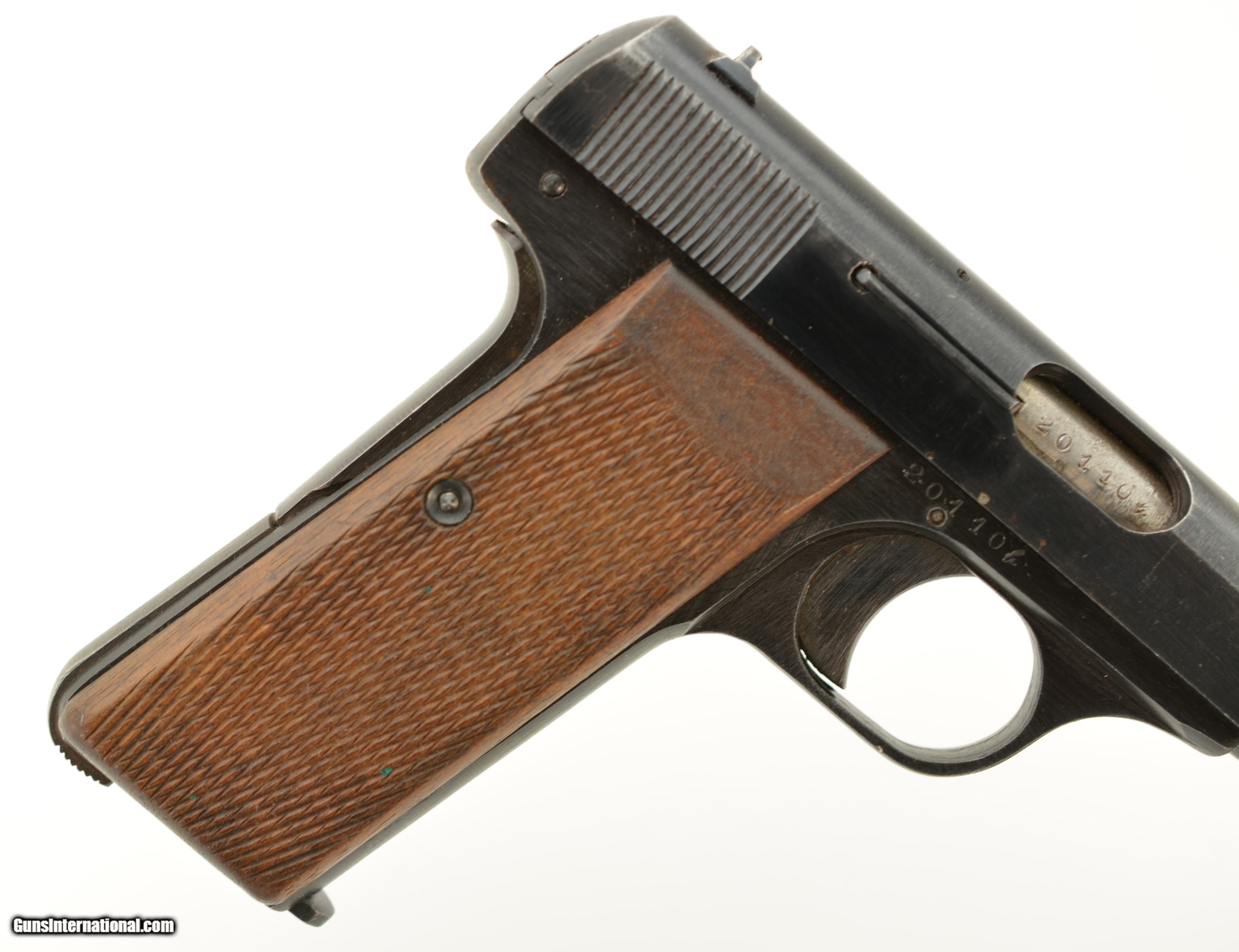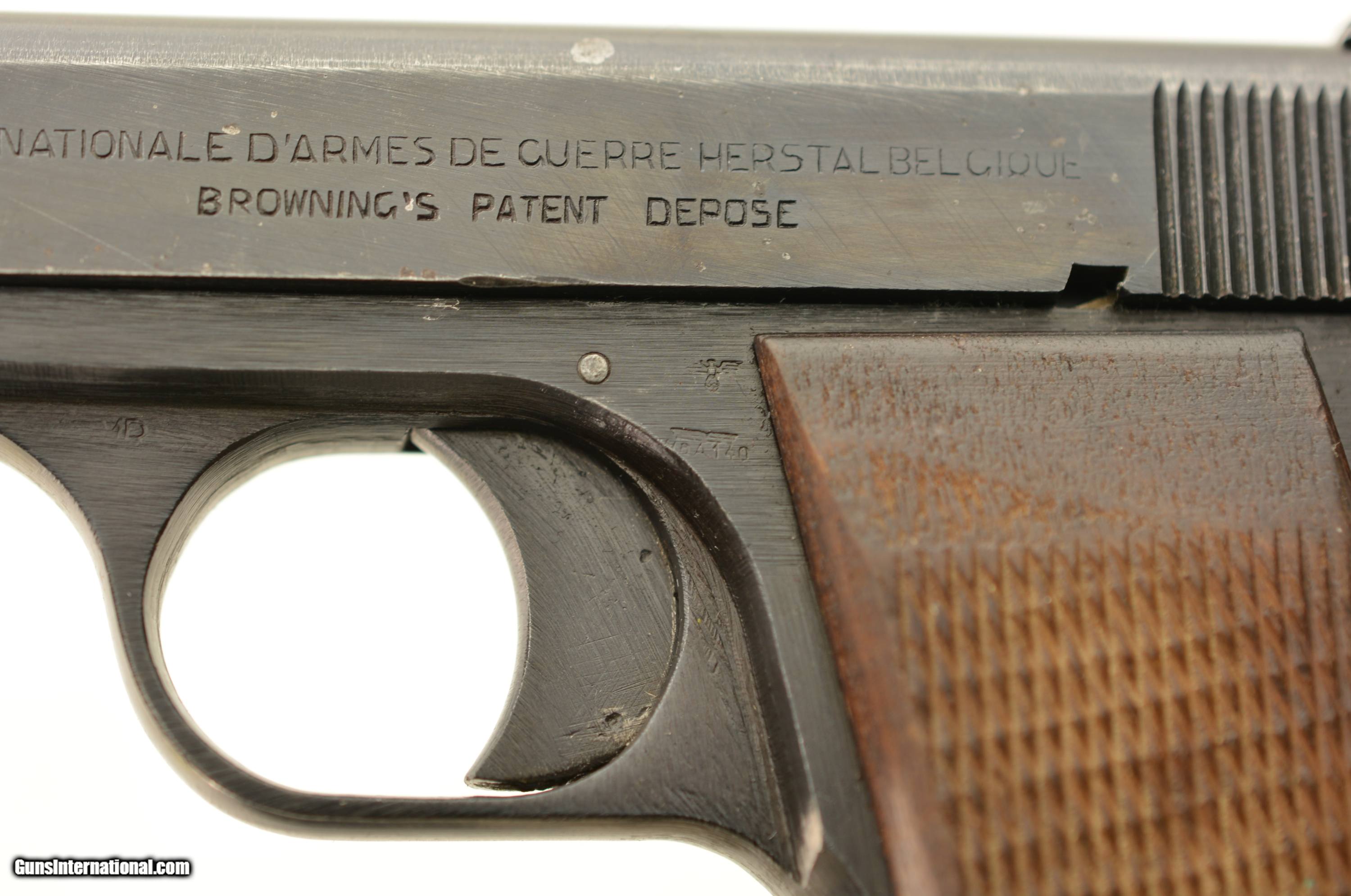 Description: Serial #20110b, .32 ACP, 4 1/2" barrel with a fine, bright bore that has some trace freckling within the grooves. The metal surfaces of this all-matching numbered pistol retain about 90-92% of the original blue with silvering at the muzzle, along the high and exposed edges, and on the bearing surfaces. The barrel remains mostly armory bright, and all markings are intact and strong with proper eagle firing proofs and "(Eagle) / WaA140" Waffenamts. The checkered walnut grips remain in excellent condition only a few minor handling marks. A single correct, “FN" marked magazine is included, and the action is fully functional. This is a very nice example of a German-used FN pistol, and rates fine-near excellent overall. FFL or C&R SOLD Curio/Relic: Yes Manufacturer: FN Model: 1910/22 Serial Number: 20110b Caliber Info: .32 ACP Gauge Info: .32 ACP |