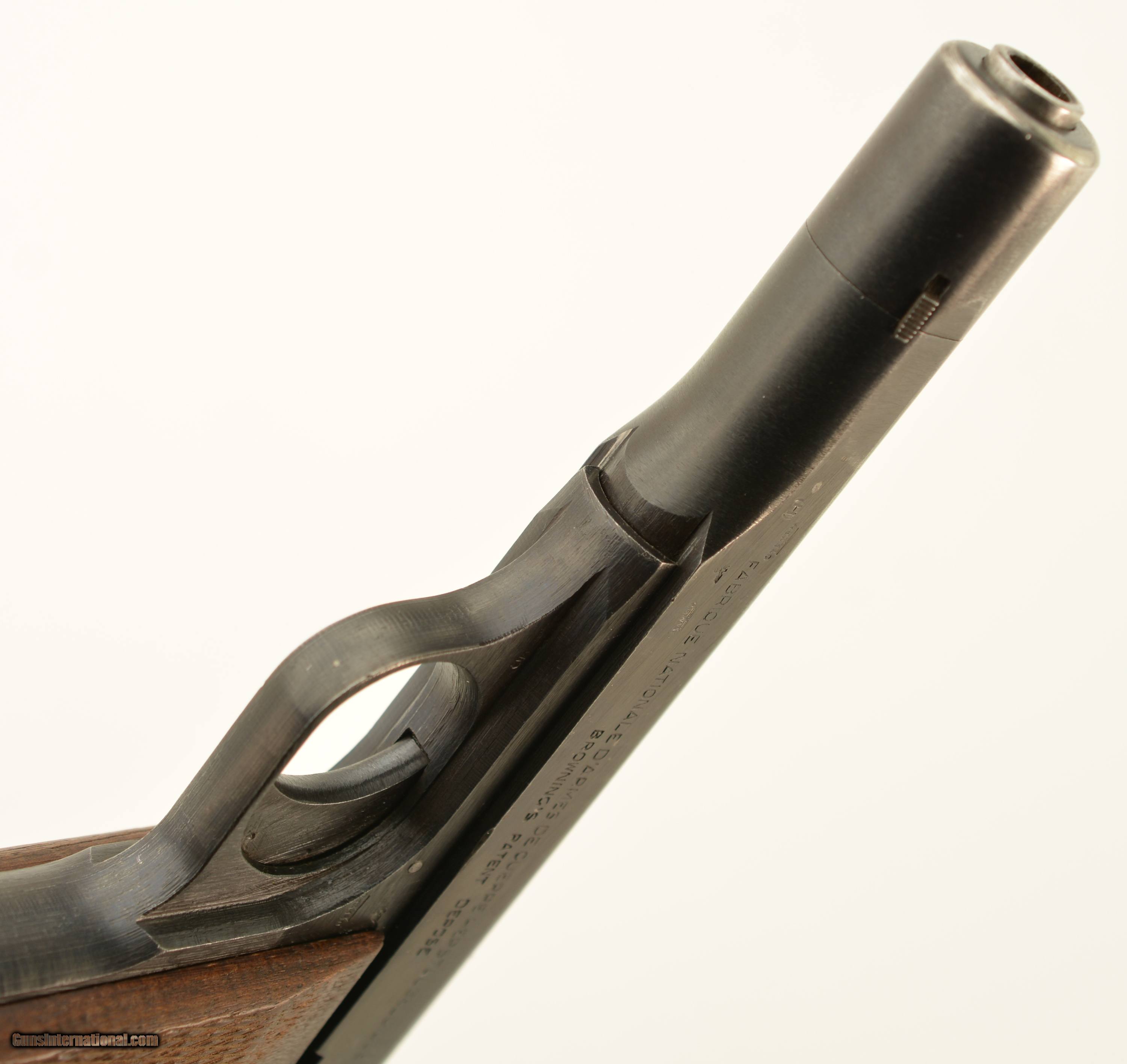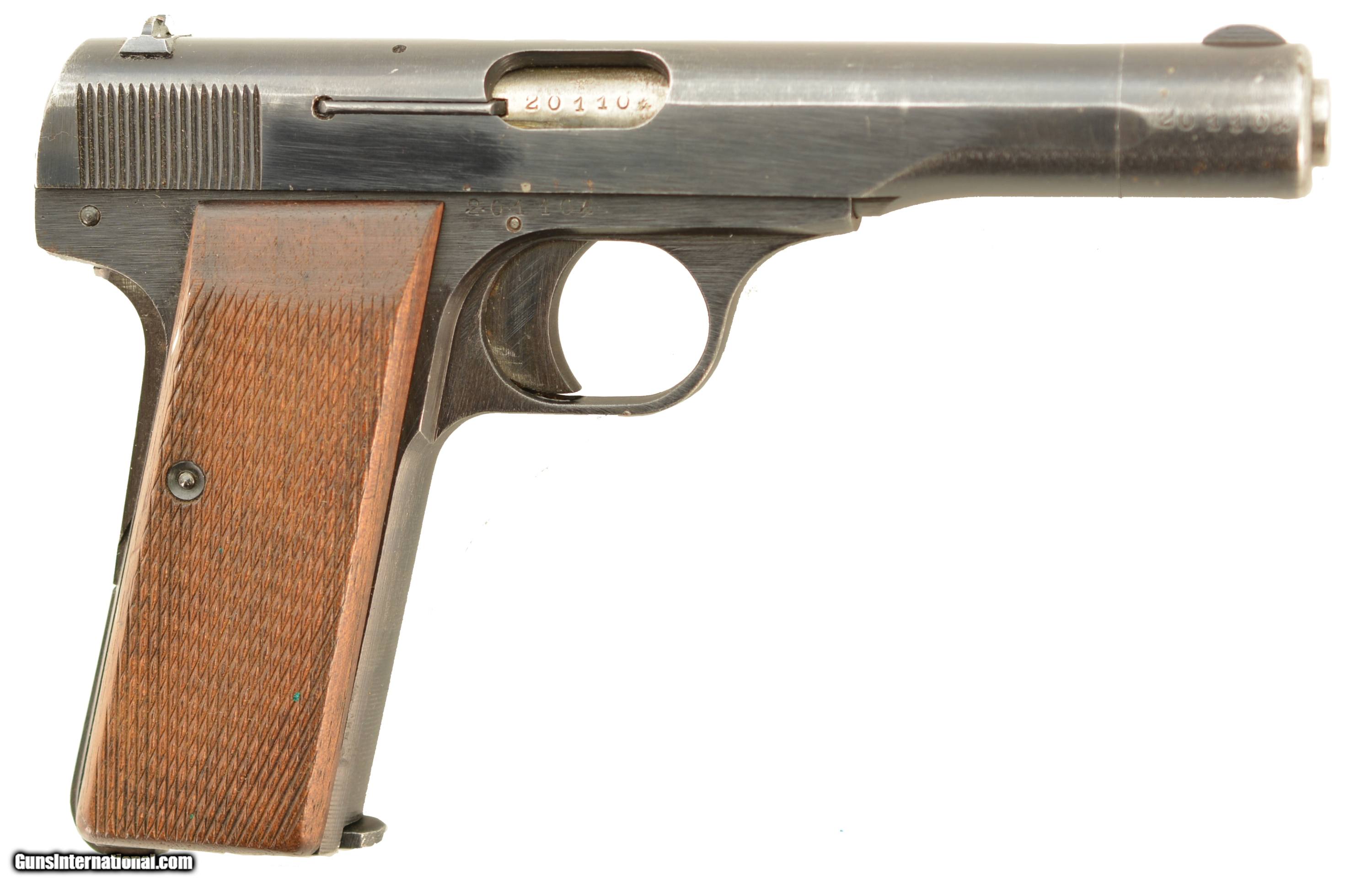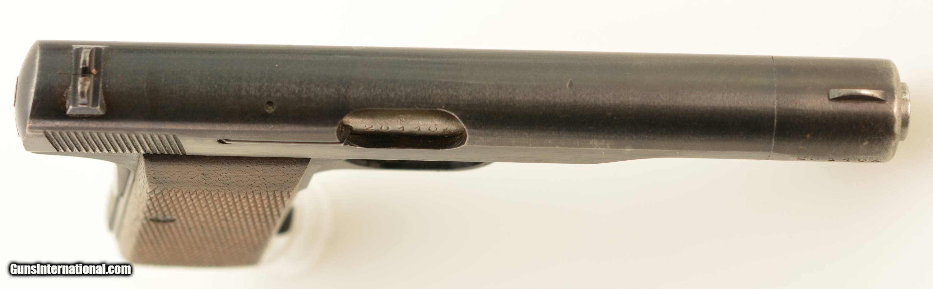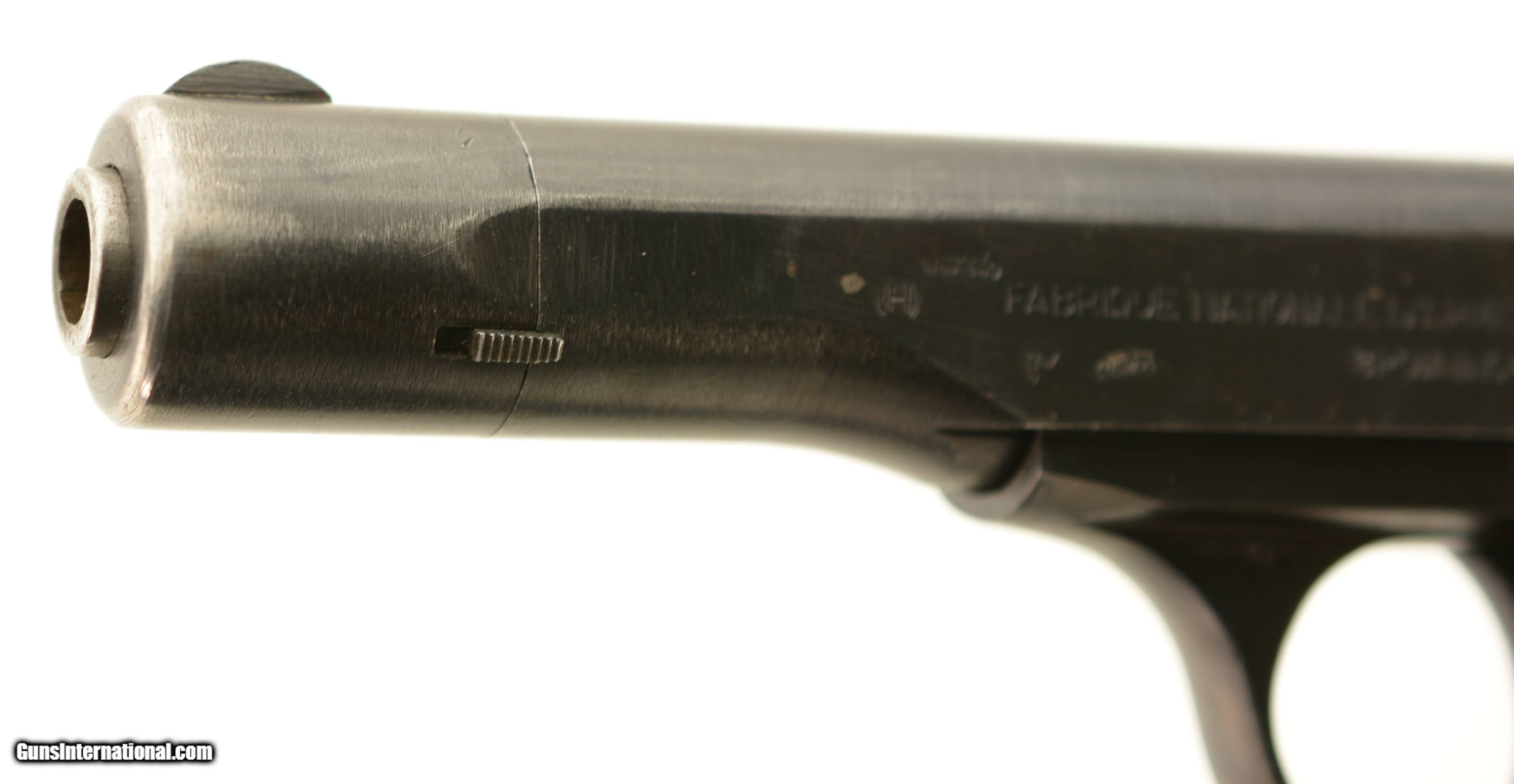 Description: Serial #20110b, .32 ACP, 4 1/2" barrel with a fine, bright bore that has some trace freckling within the grooves. The metal surfaces of this all-matching numbered pistol retain about 90-92% of the original blue with silvering at the muzzle, along the high and exposed edges, and on the bearing surfaces. The barrel remains mostly armory bright, and all markings are intact and strong with proper eagle firing proofs and "(Eagle) / WaA140" Waffenamts. The checkered walnut grips remain in excellent condition only a few minor handling marks. A single correct, “FN" marked magazine is included, and the action is fully functional. This is a very nice example of a German-used FN pistol, and rates fine-near excellent overall. FFL or C&R SOLD Curio/Relic: Yes Manufacturer: FN Model: 1910/22 Serial Number: 20110b Caliber Info: .32 ACP Gauge Info: .32 ACP |