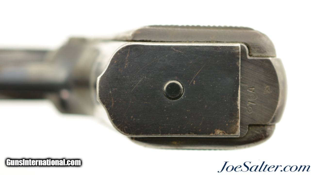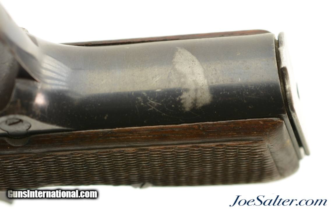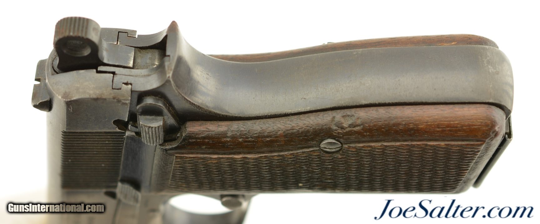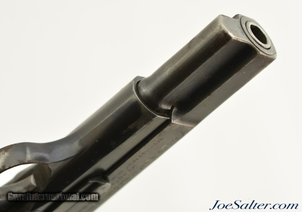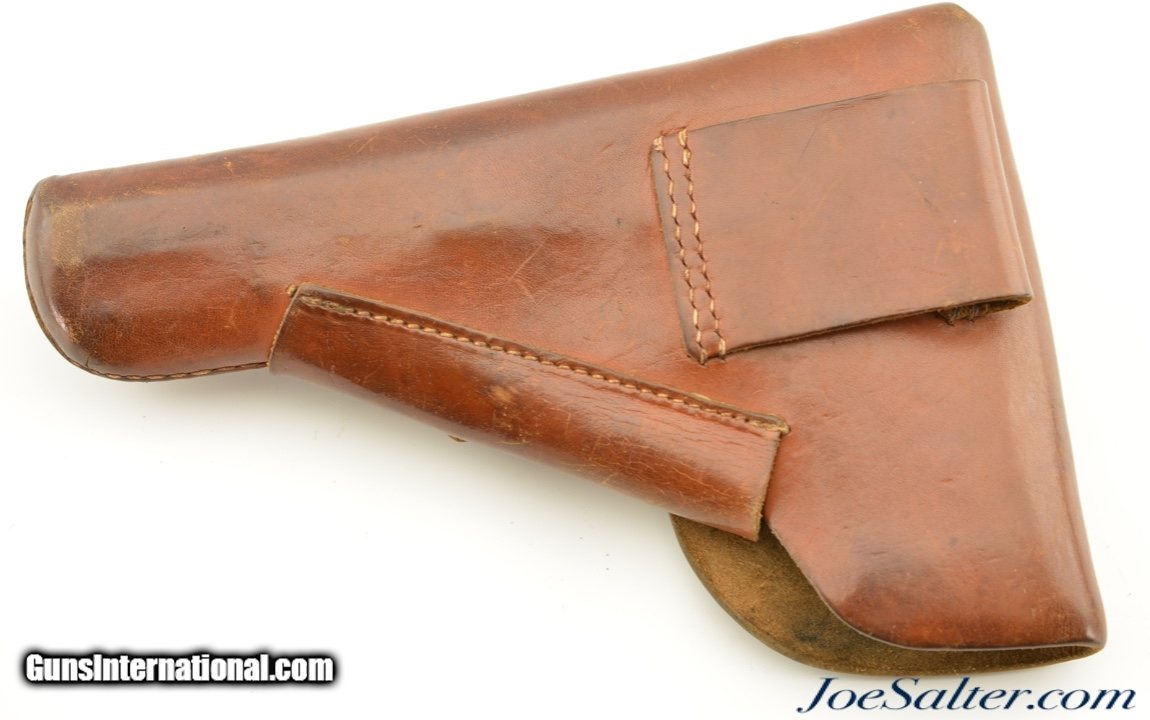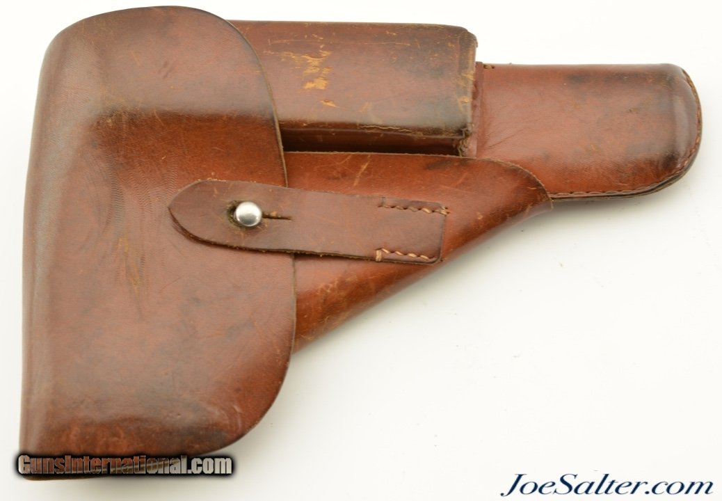 Description: Serial #152617, 9mm Para., 4 3/4" barrel with a fine, bright bore that has a small amount of mild freckling within the grooves. This is a fixed sight-equipped, unslotted pistol that has matching numbers on the frame, barrel, and slide. The metal retains about 85-90% of the original blue finish that has silvered at the muzzle and along the exposed edges and surfaces. There is some further plum-brown freckling on either side of the slide, and curved area of finish loss on the frontstrap. The Waffenamt stamps and other markings are still crisp and clear. The checkered walnut grips are original and are in very good shape, although there is some moderate wear and flattening of the points commensurate with the condition of the rest of the gun. The pistol comes with a single post-war magazine, and is housed in a brown leather, P.35-type private purchase soft-side holster with no visible markings. The leather is in very good condition; still supple and intact, but with minor scuffs and blemishes, as well as a very small amount of flaking and crazing along the flex points and edges. This is a fine wartime occupation High Power that looks great, and would make a fine addition to any World War II collection. FFL or C&R SOLD |