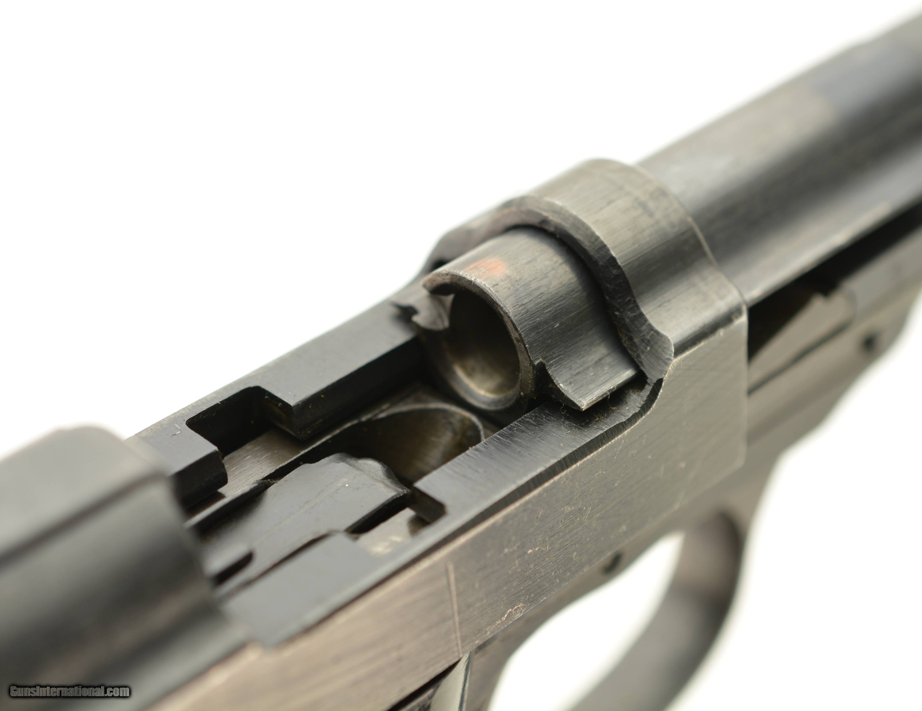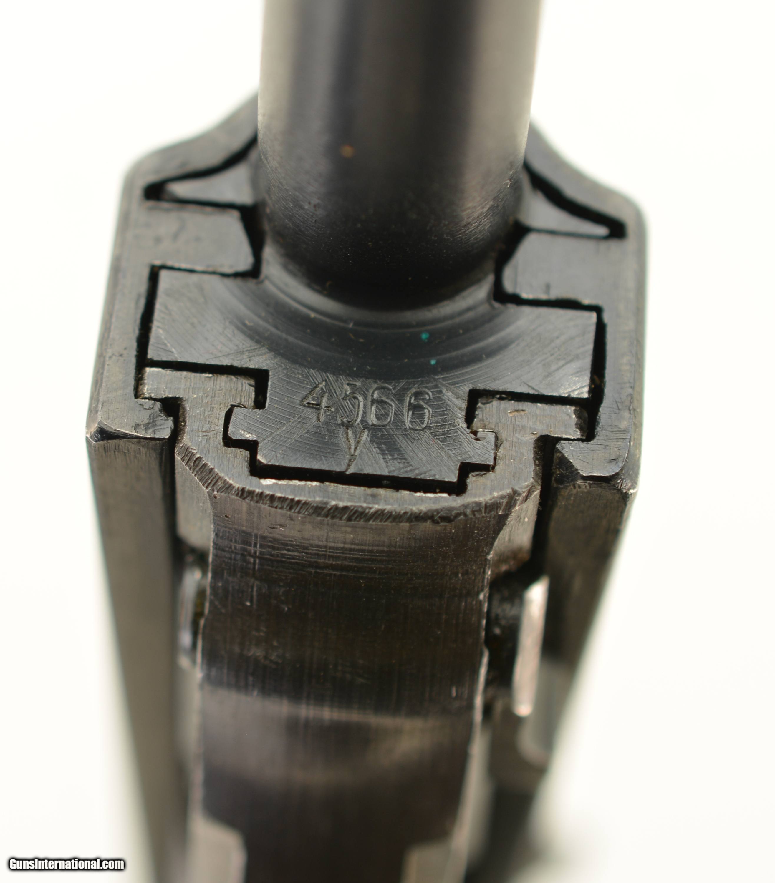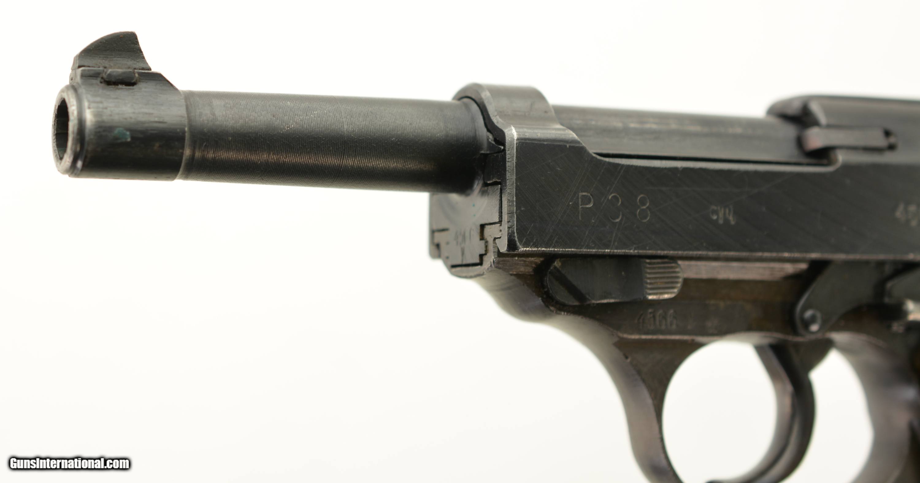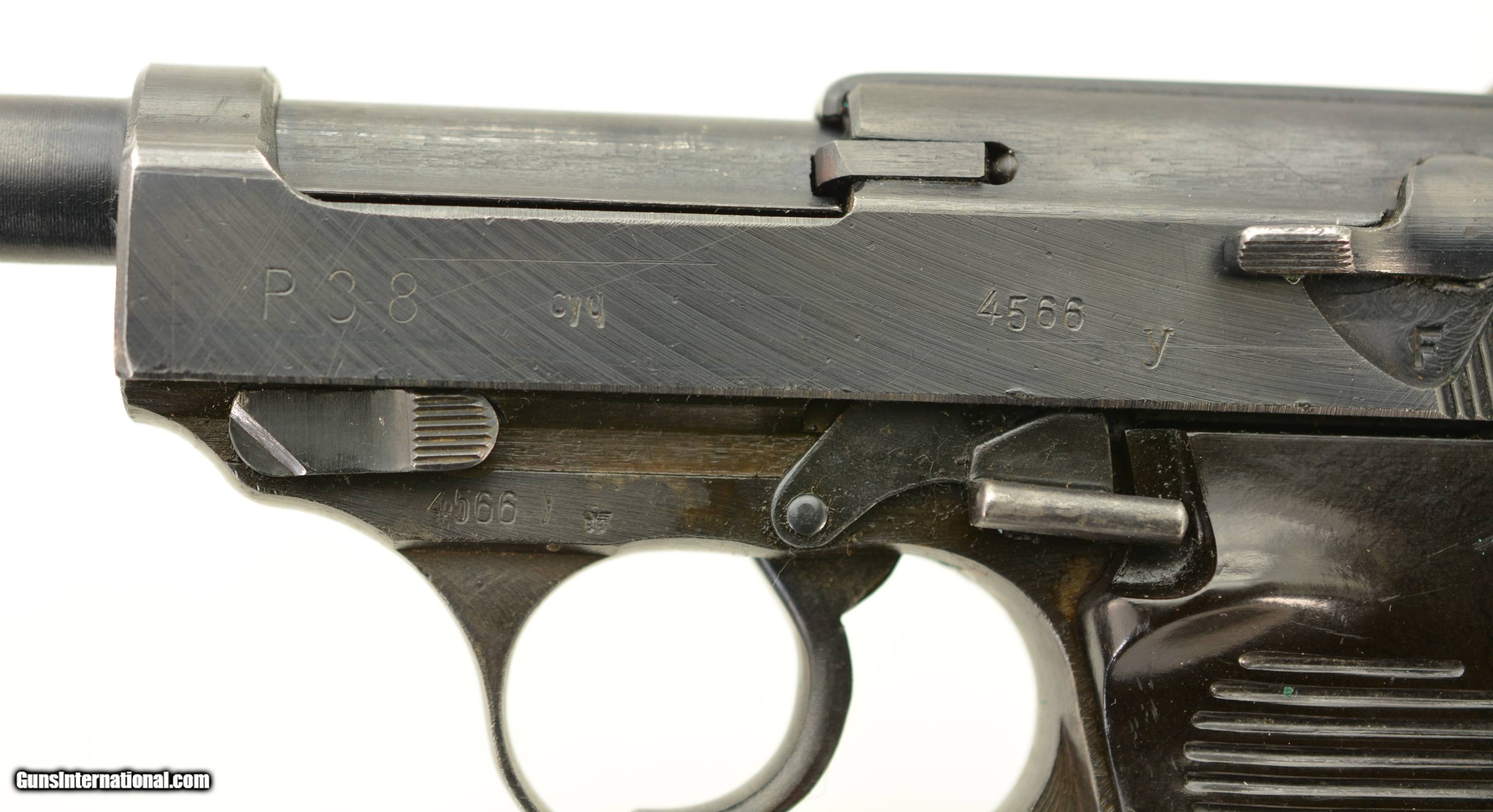 Description: Serial #4566y, 9mm Para., 4 3/4" barrel with an excellent, bright bore. This is a "cyq" coded pistol that has matching numbers on the frame, slide, barrel, and locking block, with the metal retaining about 97-98% of the original blue finish that has silvered lightly at the muzzle, as well as on the projecting edges and bearing surfaces. The Waffenamt proofs are crisp and clear and a few faint traces of the white and red paint are still present within the "F" and "S" indicators on the safety/de-cocker cut-out. The dark brown phenolic resin grips are in fine-near excellent shape with only very minor surface scratches and small blemishes on either panel. The pistol comes with two Waffenamt marked magazines, and is housed in an Austrian-made, "dvr / 42" (Johann Proelich Koffer und Lederwarenfabrik, Vienna) coded soft-side holster with a NS-Reichskriegerbund (National Socialist State Veteran League) uniform breast eagle pinned to the cover flap. This is a great looking WW2 P.38, with a fine mid-war holster as well. FFL or C&R SOLD Curio/Relic: Yes Manufacturer: German Model: P.38 Serial Number: 4566y Caliber Info: 9mm Gauge Info: 9mm |