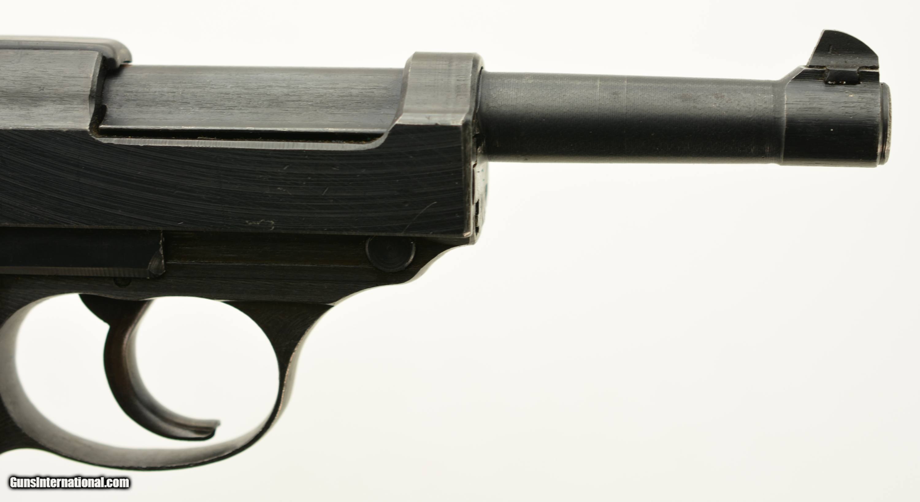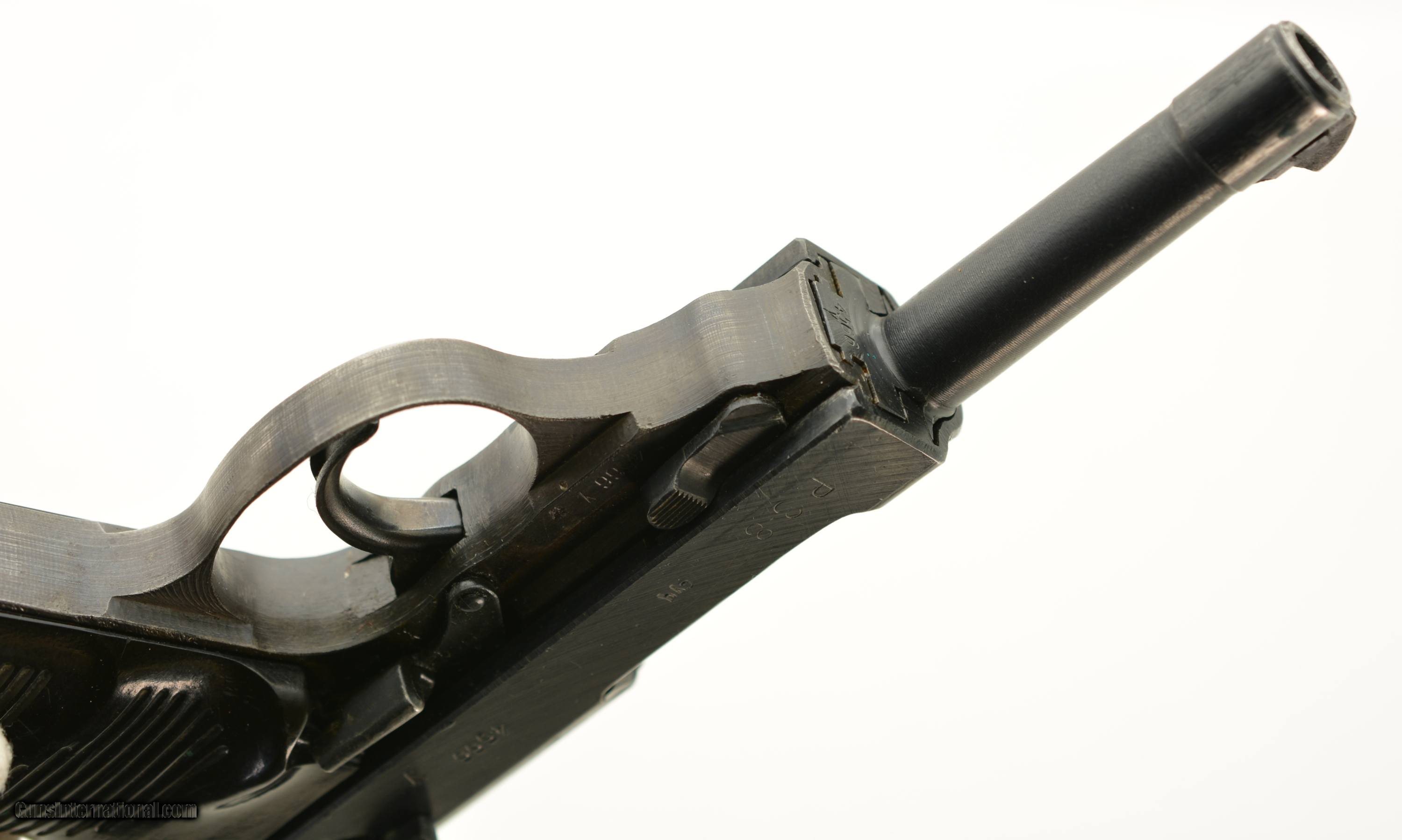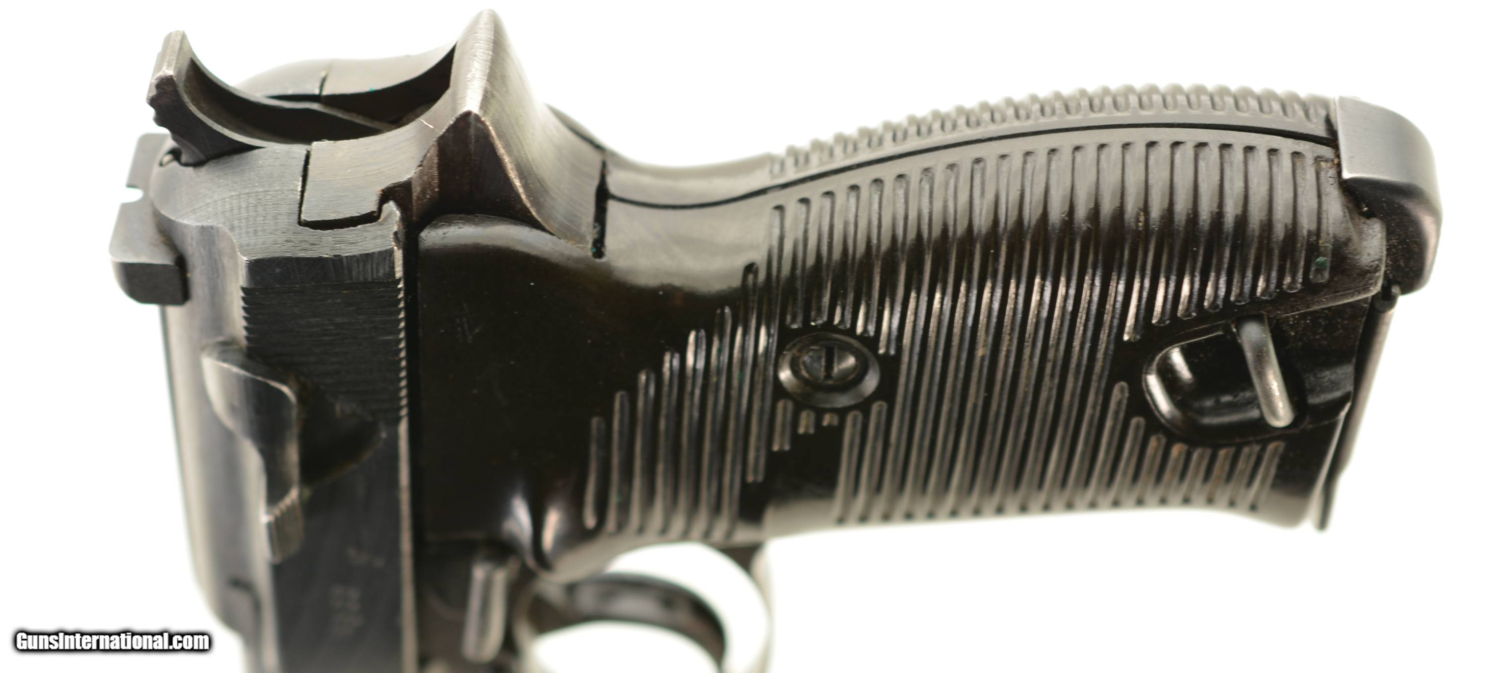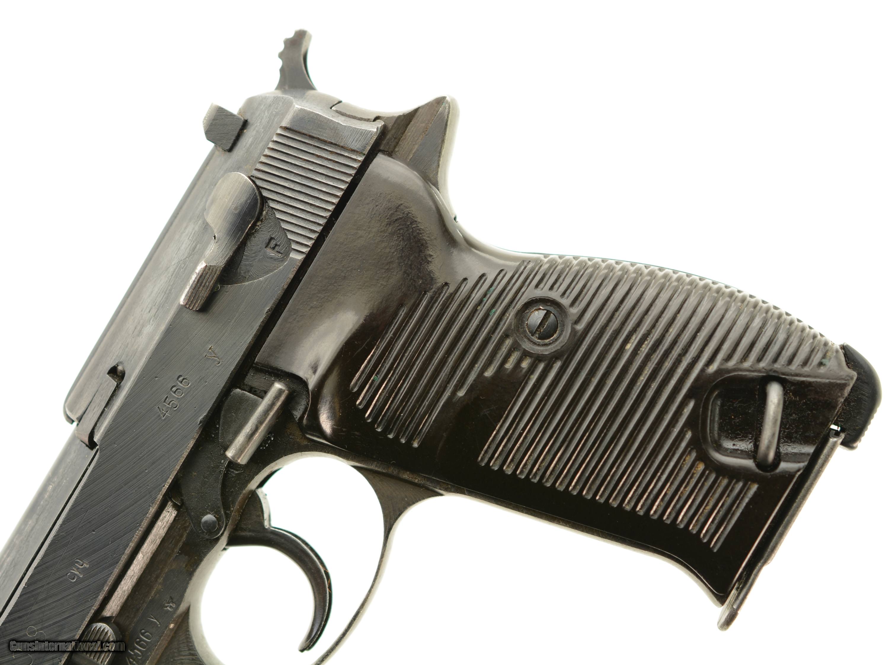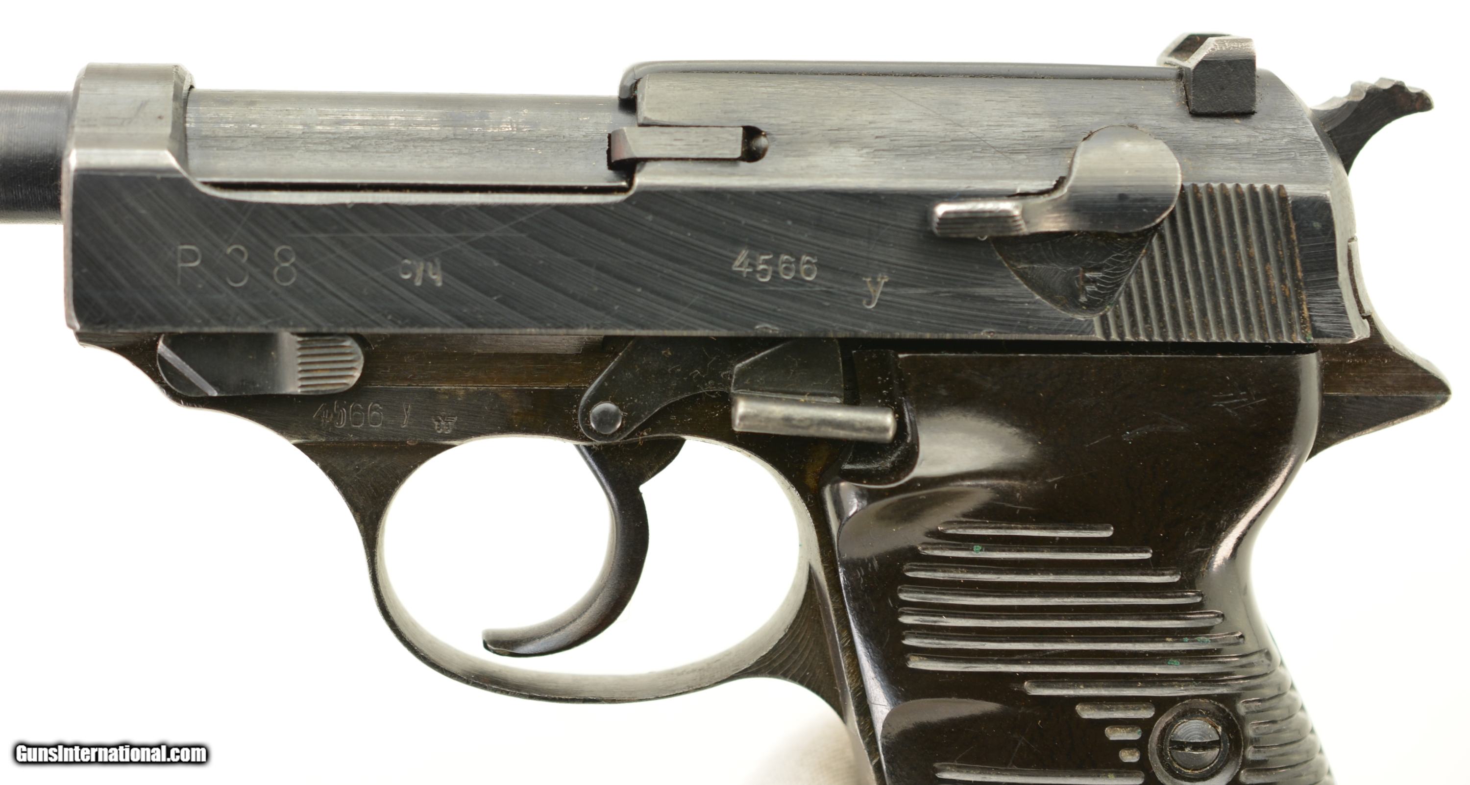 Description: Serial #4566y, 9mm Para., 4 3/4" barrel with an excellent, bright bore. This is a "cyq" coded pistol that has matching numbers on the frame, slide, barrel, and locking block, with the metal retaining about 97-98% of the original blue finish that has silvered lightly at the muzzle, as well as on the projecting edges and bearing surfaces. The Waffenamt proofs are crisp and clear and a few faint traces of the white and red paint are still present within the "F" and "S" indicators on the safety/de-cocker cut-out. The dark brown phenolic resin grips are in fine-near excellent shape with only very minor surface scratches and small blemishes on either panel. The pistol comes with two Waffenamt marked magazines, and is housed in an Austrian-made, "dvr / 42" (Johann Proelich Koffer und Lederwarenfabrik, Vienna) coded soft-side holster with a NS-Reichskriegerbund (National Socialist State Veteran League) uniform breast eagle pinned to the cover flap. This is a great looking WW2 P.38, with a fine mid-war holster as well. FFL or C&R SOLD Curio/Relic: Yes Manufacturer: German Model: P.38 Serial Number: 4566y Caliber Info: 9mm Gauge Info: 9mm |