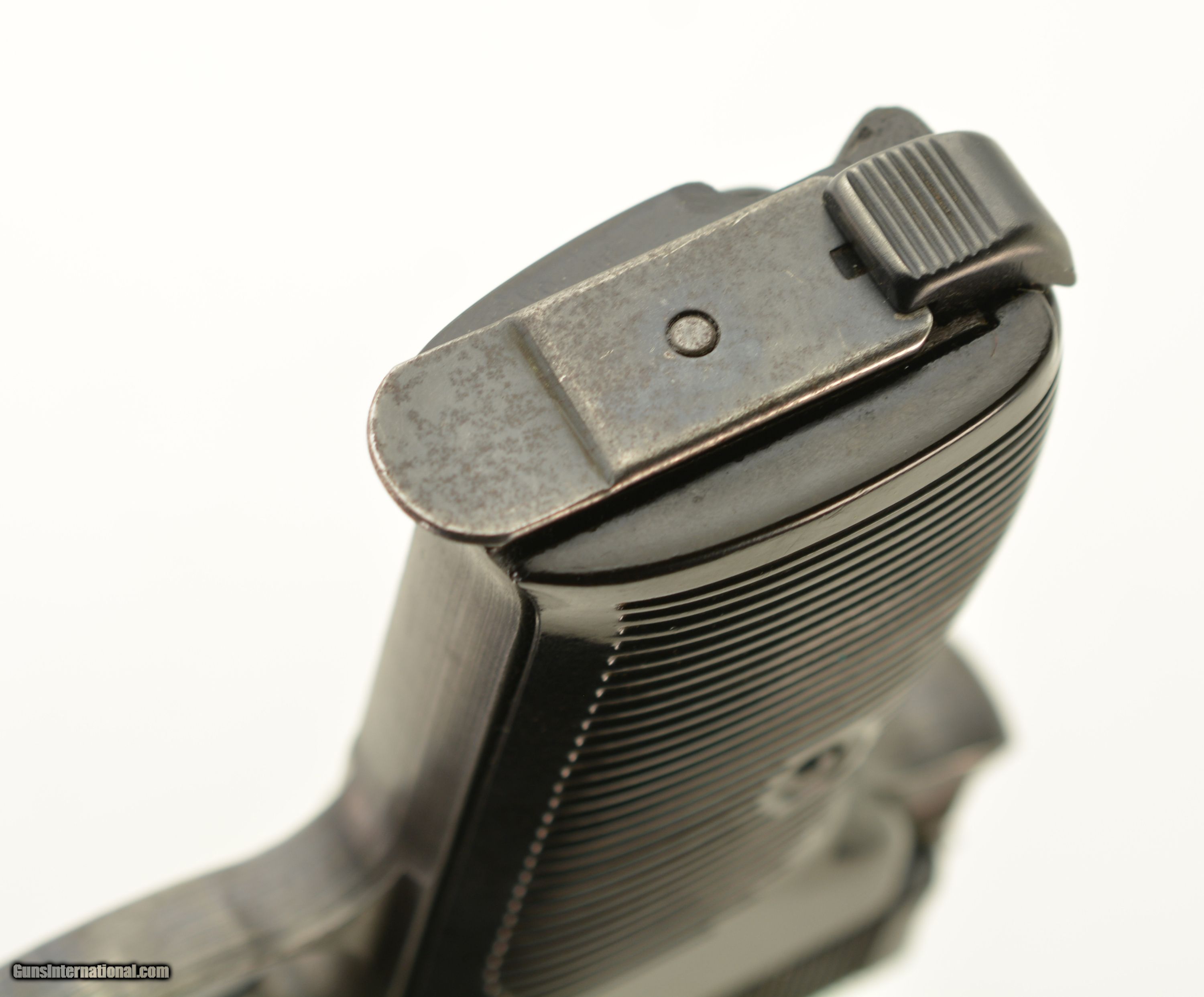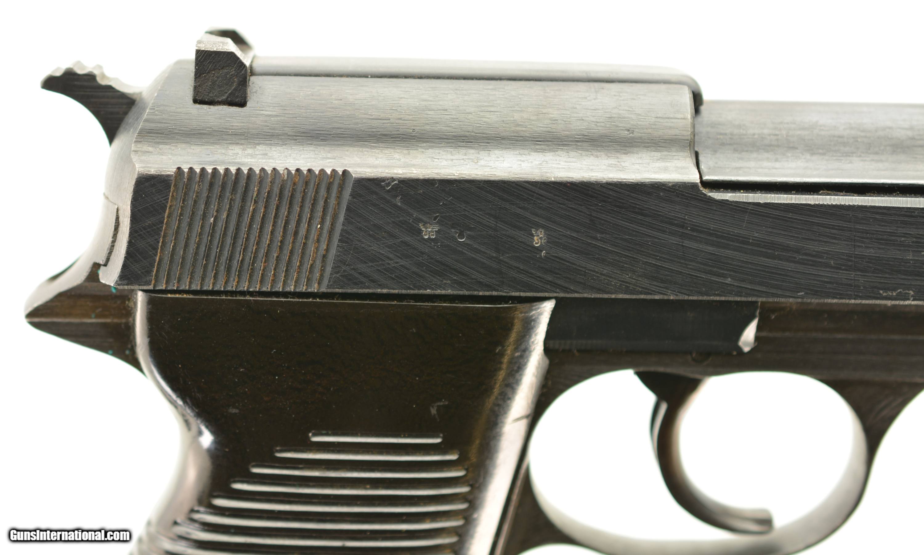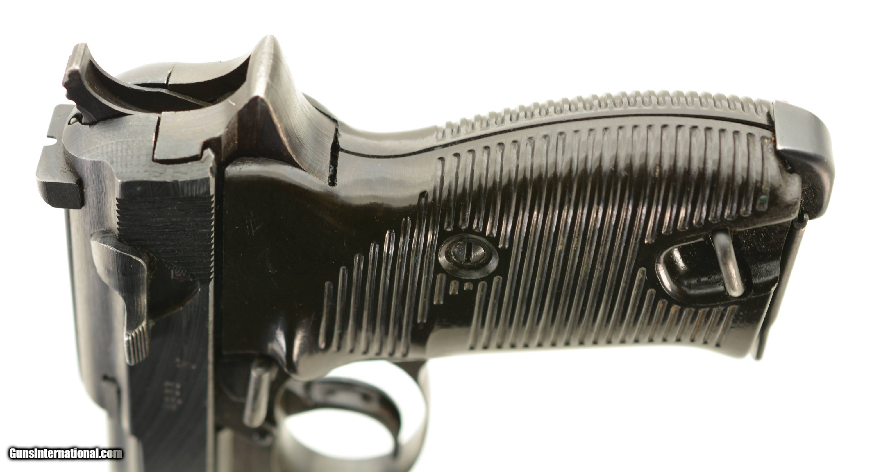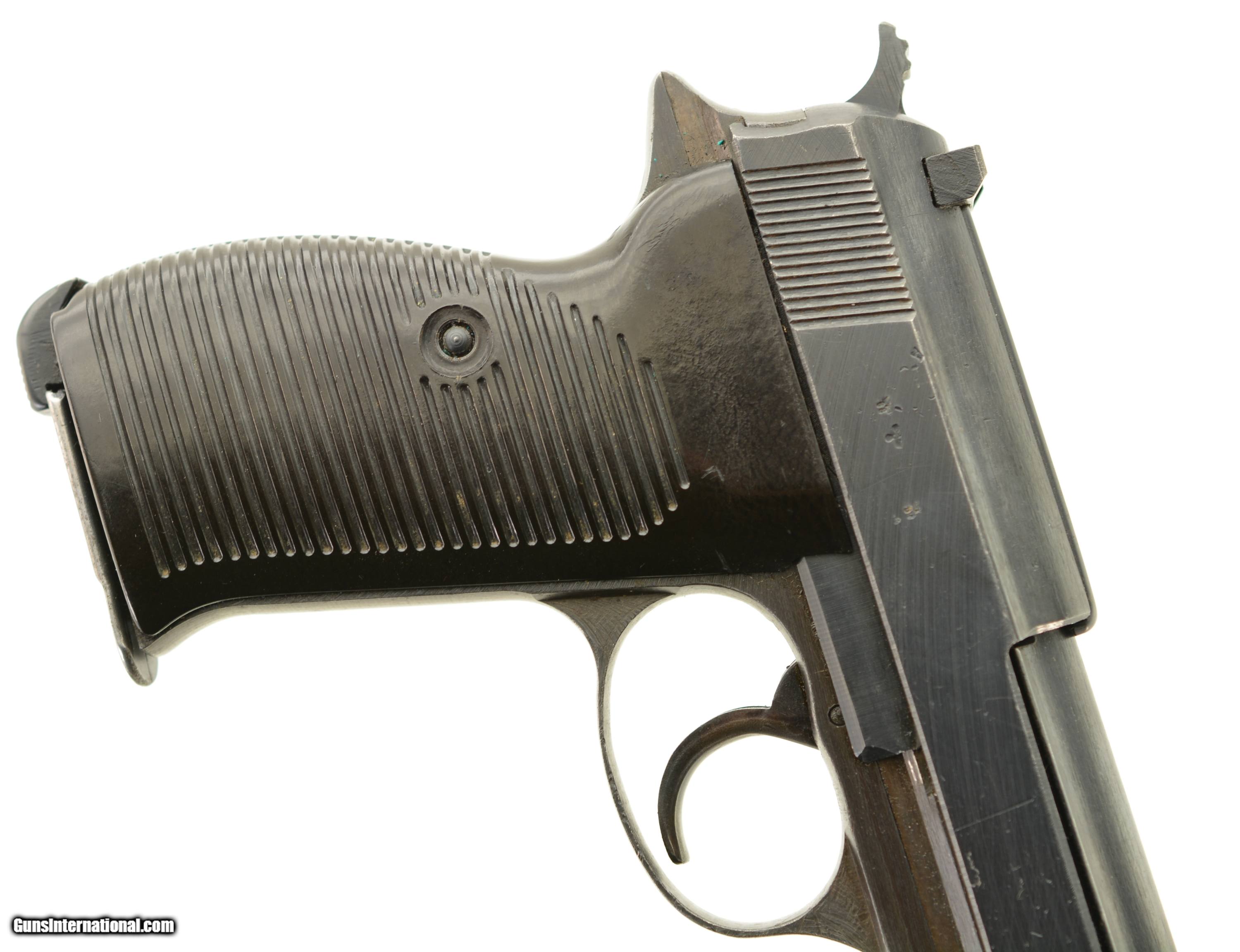 Description: Serial #4566y, 9mm Para., 4 3/4" barrel with an excellent, bright bore. This is a "cyq" coded pistol that has matching numbers on the frame, slide, barrel, and locking block, with the metal retaining about 97-98% of the original blue finish that has silvered lightly at the muzzle, as well as on the projecting edges and bearing surfaces. The Waffenamt proofs are crisp and clear and a few faint traces of the white and red paint are still present within the "F" and "S" indicators on the safety/de-cocker cut-out. The dark brown phenolic resin grips are in fine-near excellent shape with only very minor surface scratches and small blemishes on either panel. The pistol comes with two Waffenamt marked magazines, and is housed in an Austrian-made, "dvr / 42" (Johann Proelich Koffer und Lederwarenfabrik, Vienna) coded soft-side holster with a NS-Reichskriegerbund (National Socialist State Veteran League) uniform breast eagle pinned to the cover flap. This is a great looking WW2 P.38, with a fine mid-war holster as well. FFL or C&R SOLD Curio/Relic: Yes Manufacturer: German Model: P.38 Serial Number: 4566y Caliber Info: 9mm Gauge Info: 9mm |