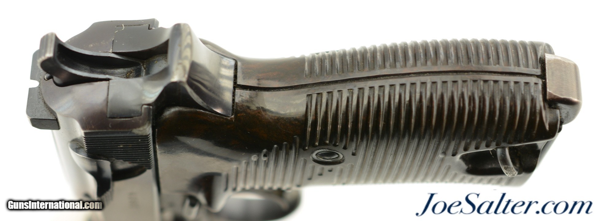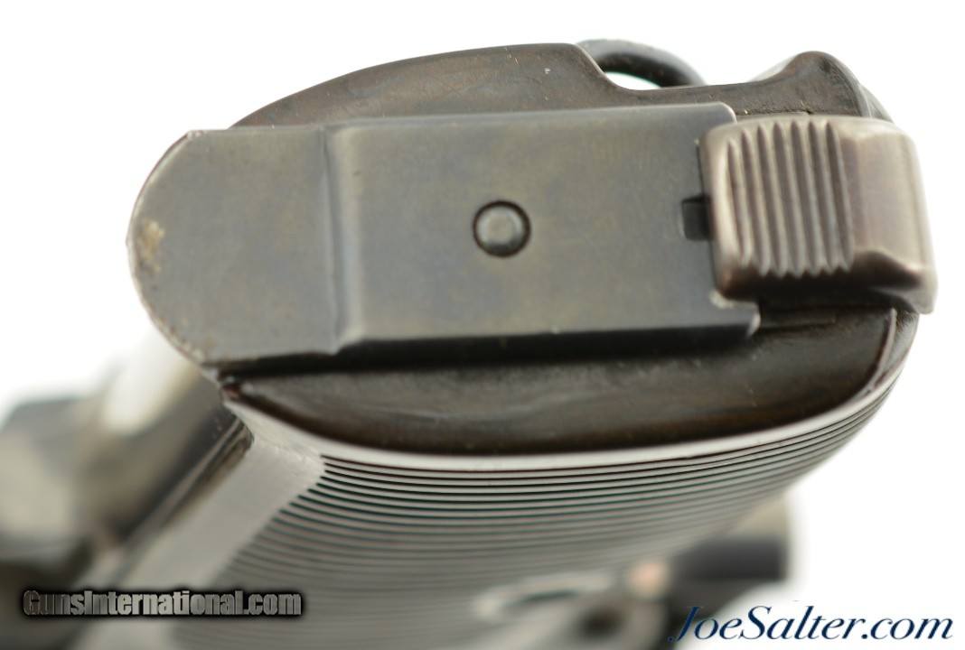 Description: Serial #3068h, 9mm Luger, 5 inch barrel with an excellent bore. This is a WWII German P.38 pistol manufactured by Walther with the "ac 41" code on the slide and the "Eagle over 359" acceptance stamps. The matching numbered pistol remains in very fine condition with wear and flaking on the muzzle and leading edges of the slide with underlying roughness the balance a showing much of the original blue with hints of later added finish and crisp markings throughout. The original grips rate about excellent. The safety will not de-cock the hammer as it is supposed to do but otherwise it functions properly. The original WWII magazine is stamped "P.38 / U' on the left bottom and "jvd" code under Eagle "WaA706" stamp and is in excellent condition. FFL or C&R Curio/Relic: Yes Price: $1,195.00 Contact Seller |
