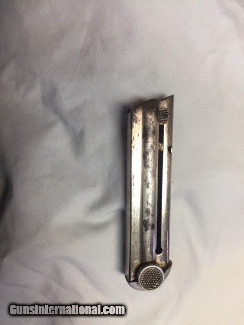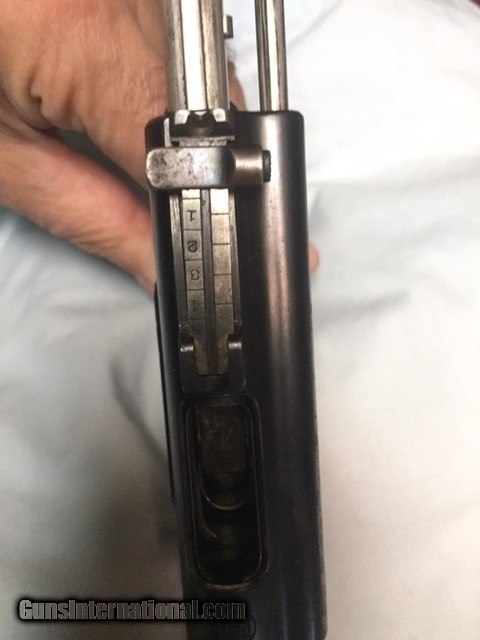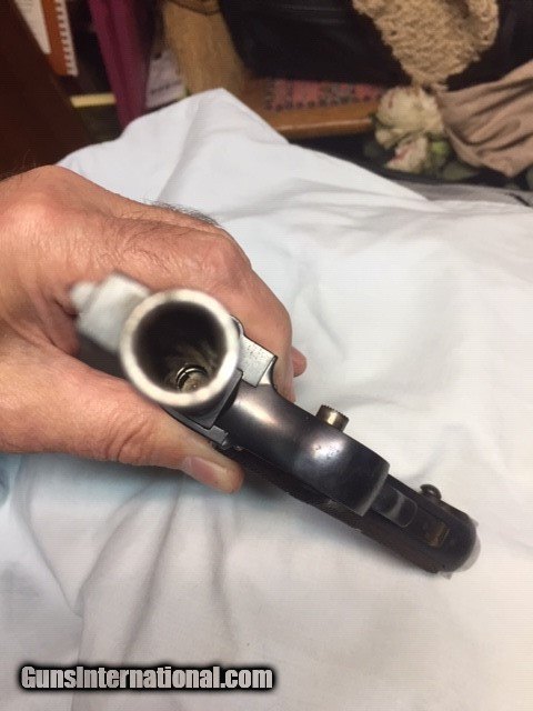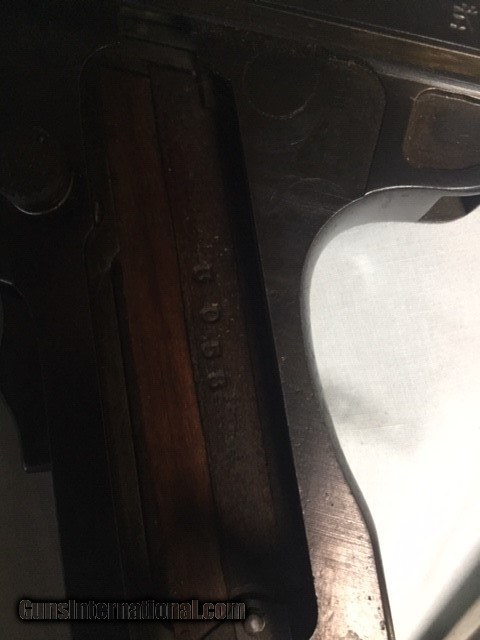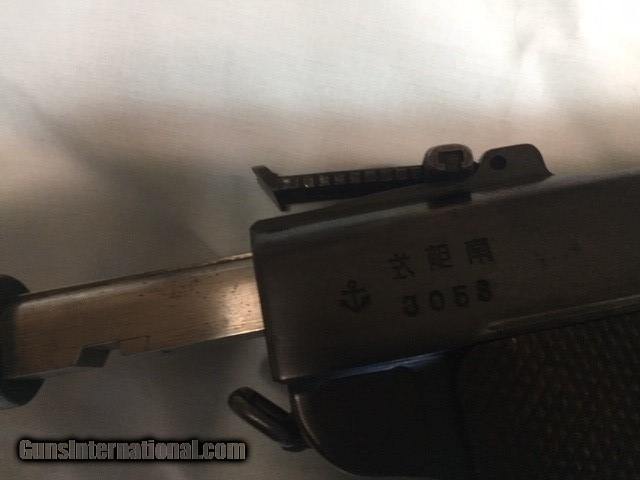 Description: JUST REDUCED!!! This Papa Nambu has the Naval Anchor property mark by the serial number. This pistol was made by Tokyo Gas And Electric. The TGE in circle logo is marked on top of the frame over the chamber. The serial number of this pistol is 3058. It is chambered for the 8 M/M Nambu cartridge. The pistol is all matched serial numbers (that I can see, gun has not been disassembled). The correct magazine is not matched to the pistol. The bore has sharp lands and is in good shooting condition. The springs are strong and the action works very good. The grip has no cracks or chips,but is missing left side. The bluing is strong on the frame. As with many of these "Papa" Naval pistols there is some pitting around the grip areas, both front and back. This pistol shows service use and wear. There is no Import stamps on the frame or barrel. There is some type of letting on right grip (officers name?). The bluing would rate a 75% on the frame. the grip area as stated shows pitting. The original sights are intact. The rear sight works without any issues. This is a very decent condition Naval marked pistol. These "Papa" Nambu"s are not easily found today in this quality of condition. This pistol should make the Military and Nambu collector happy to have in their collections. SOLD Curio/Relic: Yes Manufacturer: Nambu Model: Papa 1902 Serial Number: 3058 Caliber Info: 8mm |