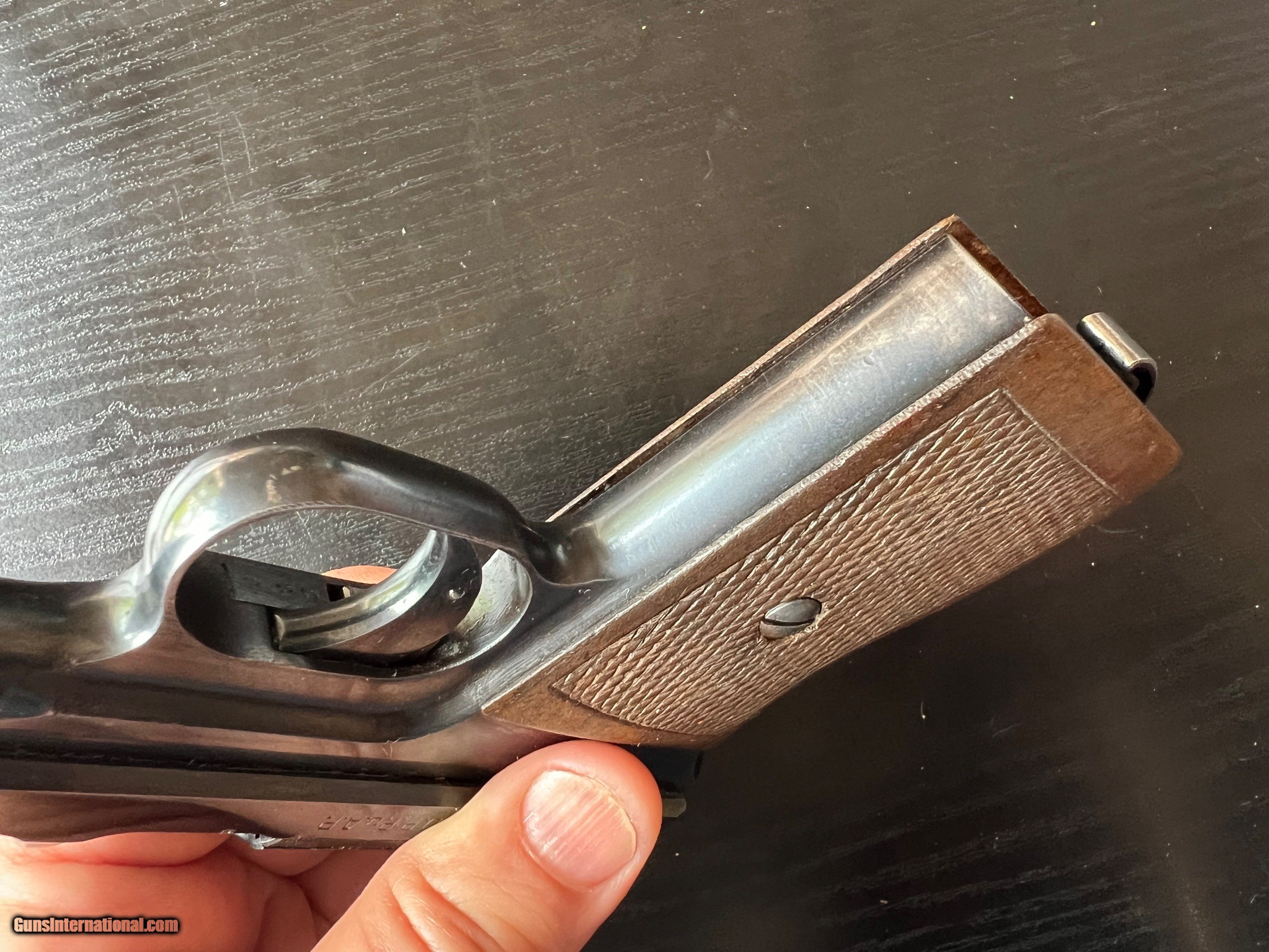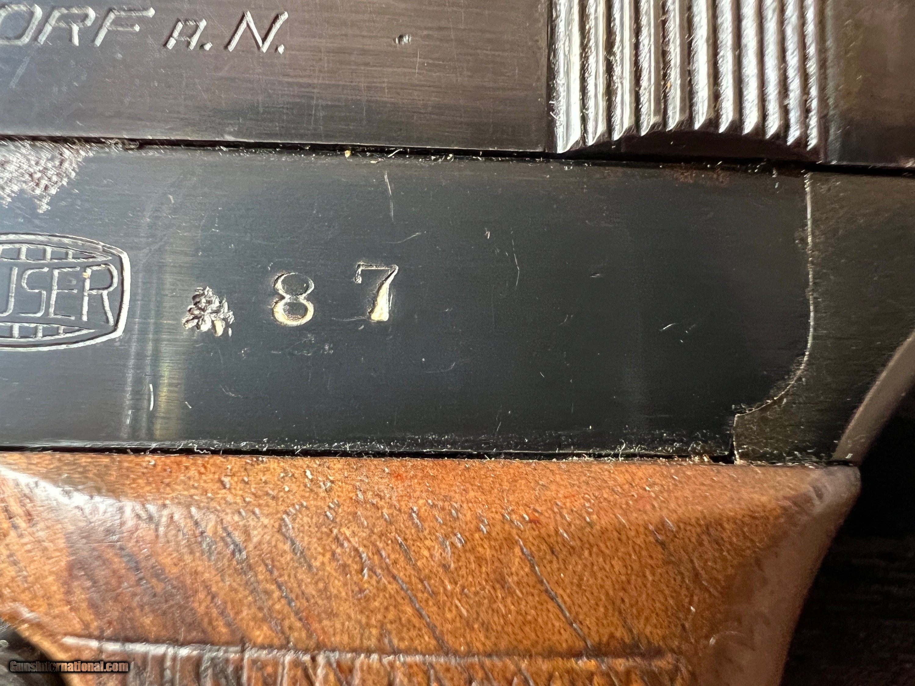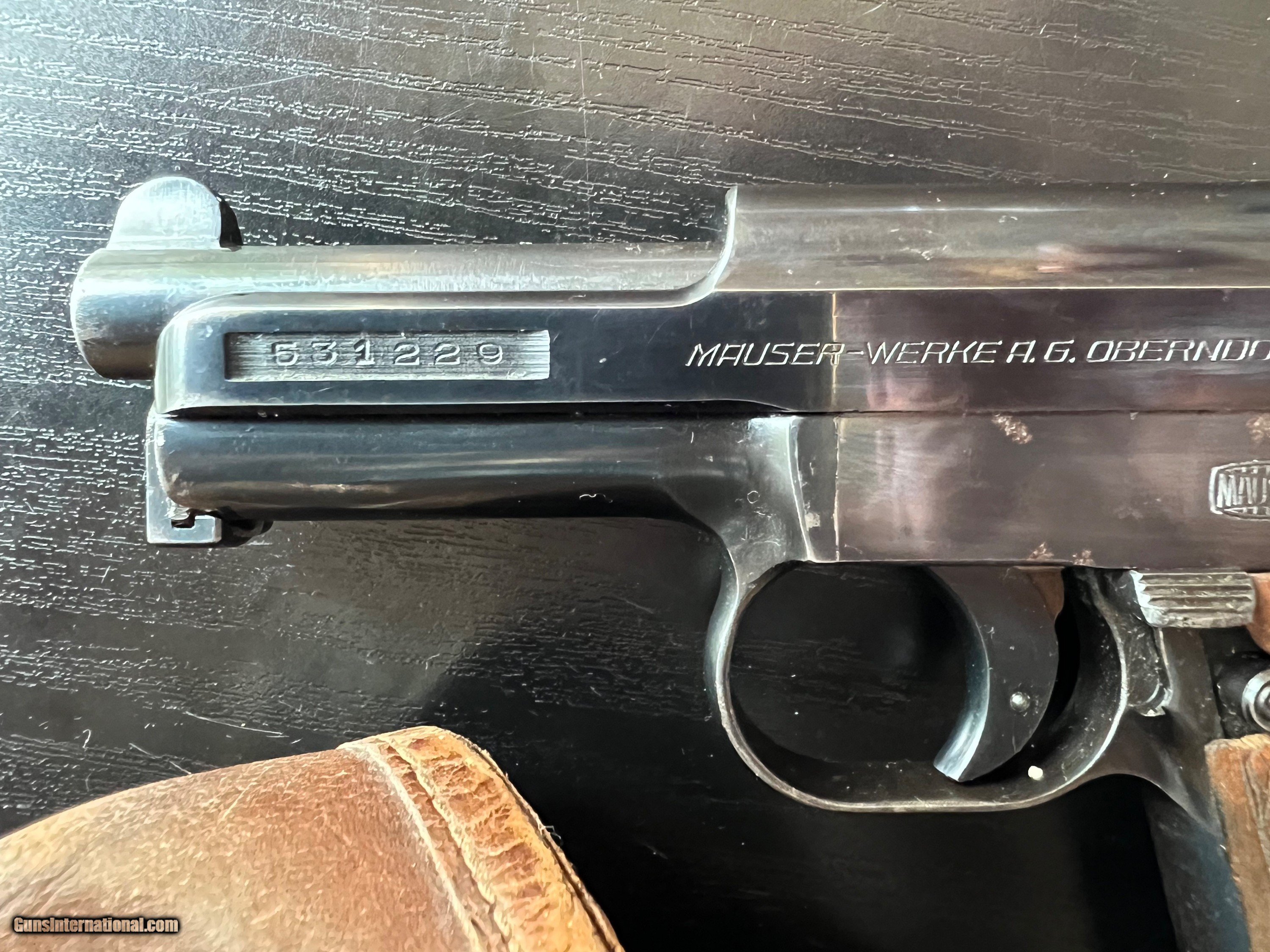 Description: This is a scarce Japanese procurement Mauser 1934 rig inn.32ACP, with its original Japanese made holster. the gun is in about 96-97% original condition with minor holster wear and a couple of spots of peppering on the left side of the slide. This is a pre-war Crown/U proofed gun. These were often purchased by the Japanese army and police officers before WWII. This one has a kanji mark and a rack number on the left side. Holster is in great condition as well and has no defects. A highly sought after Japanese purchase Mauser 1934 with Kanji marking! 3-day inspection FFL or C&R(where legal) $50 insured shipping in CONUS Layaway available. SOLD Curio/Relic: Yes |