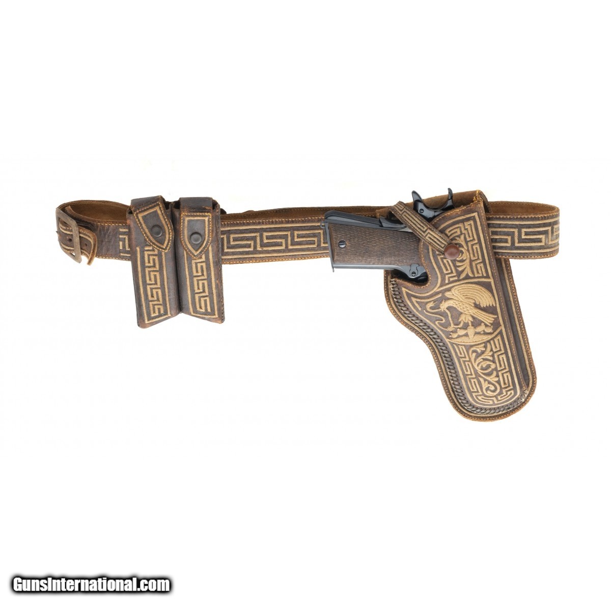 Rare Mexican military pistol. The Obregon is named after its inventor in Mexico. Manufactured by Fabrica de Armas in Mexico City in the mid to late 1930's. The bore has worn rifling and is dark in the grooves. This rare Obregon has been professionally refinished and looks great. Pistol is chambered for .45ACP (11.43mm). Comes with two additional magazines and an embroidered Mexican Piteado leather holster on belt. A very rare Mexican military pistol.