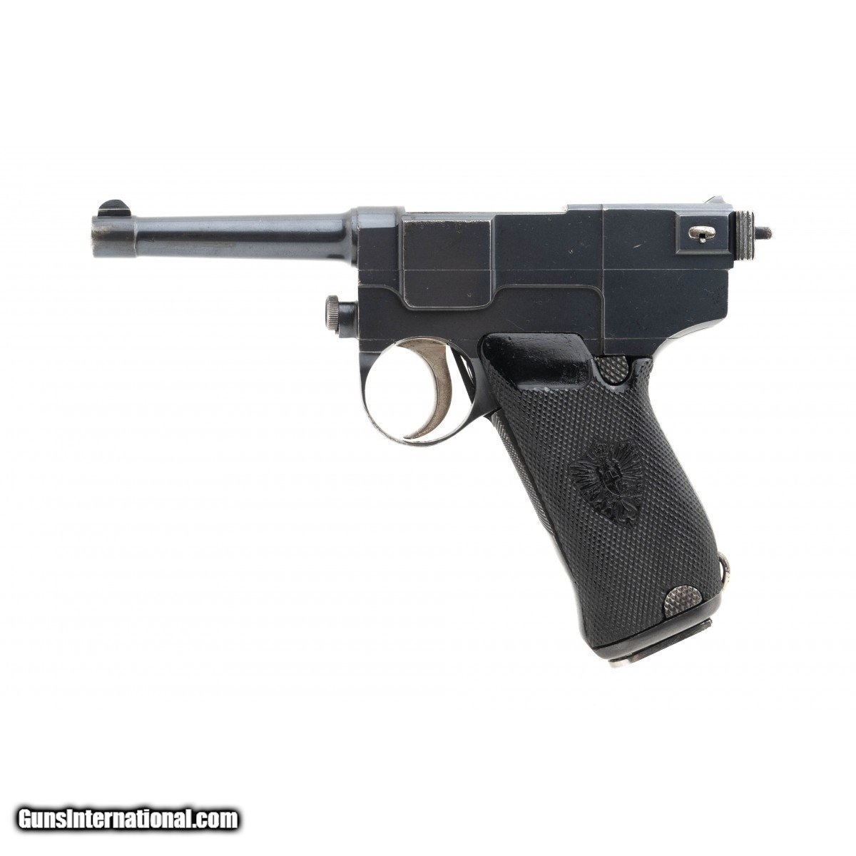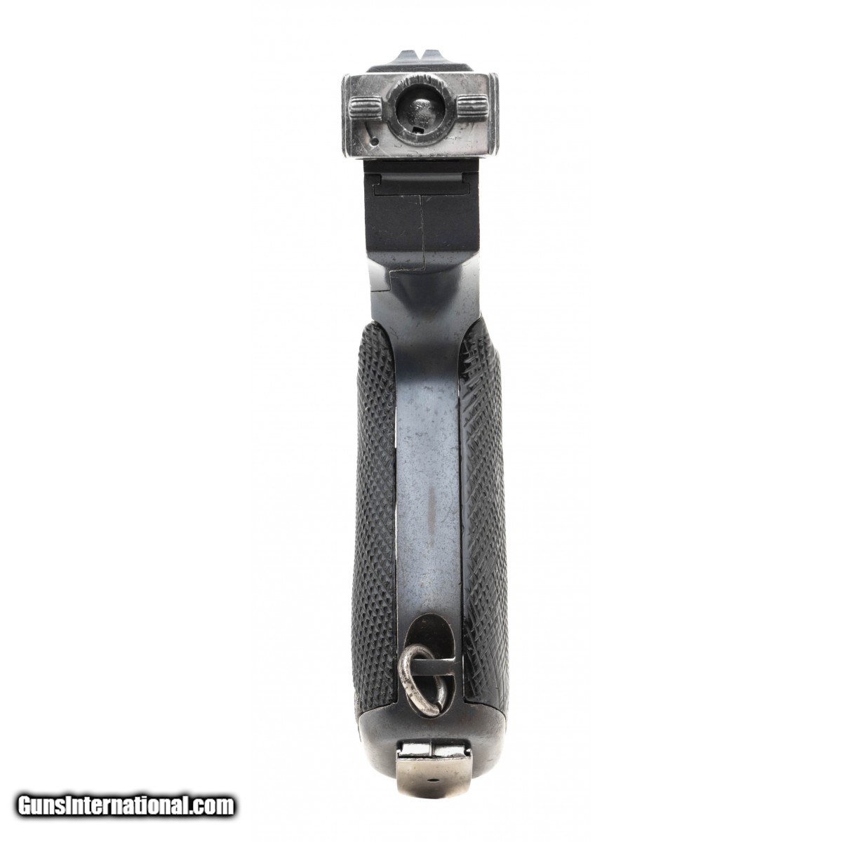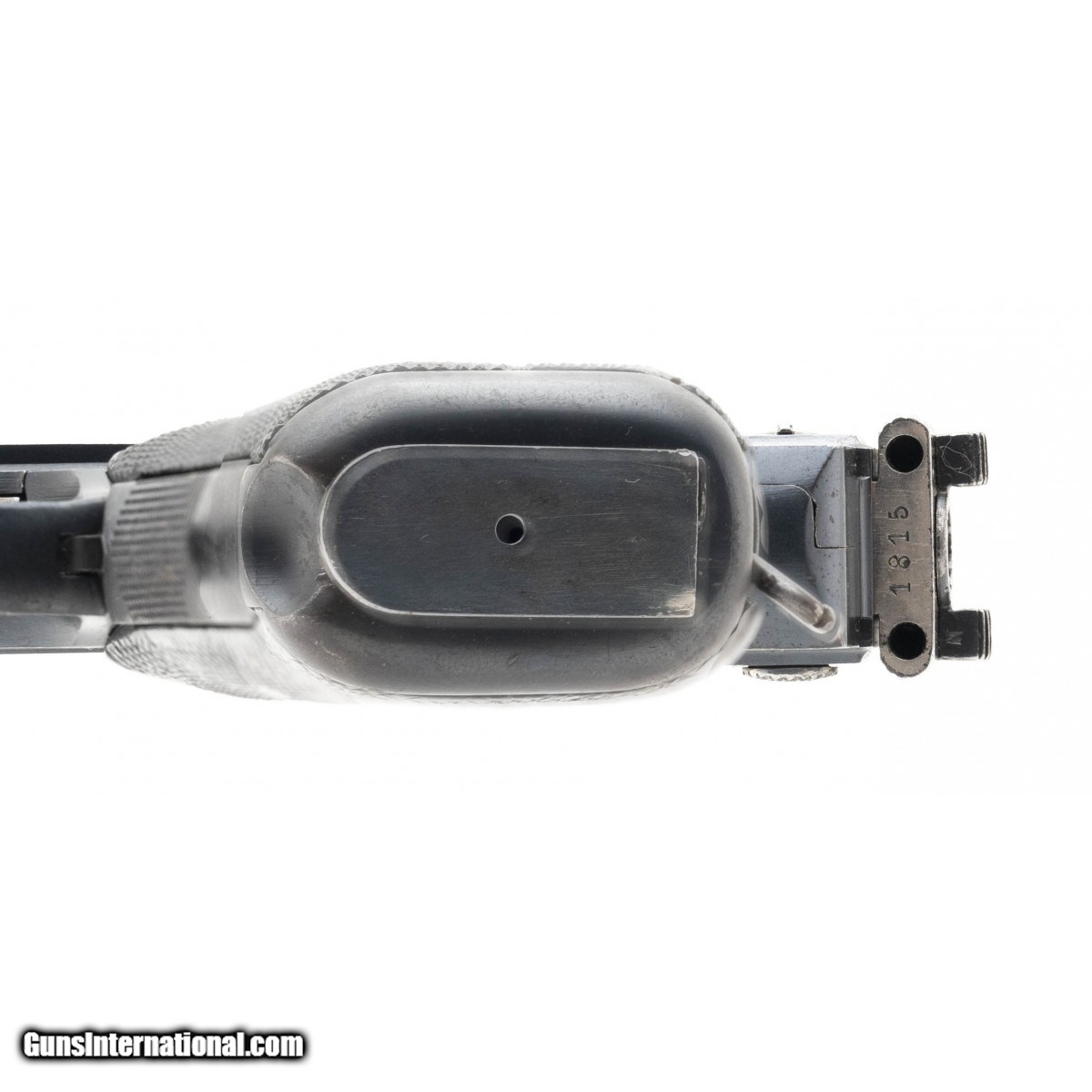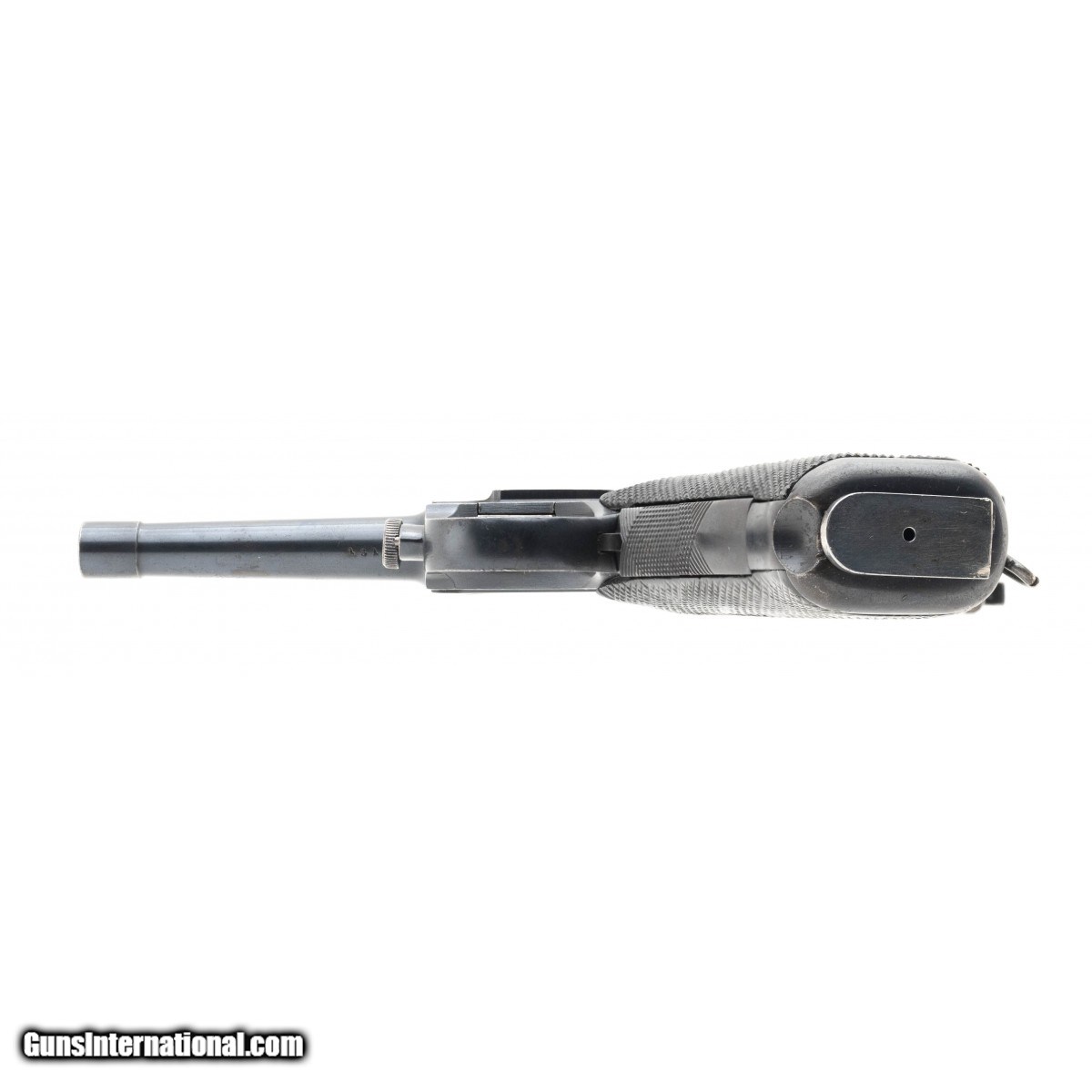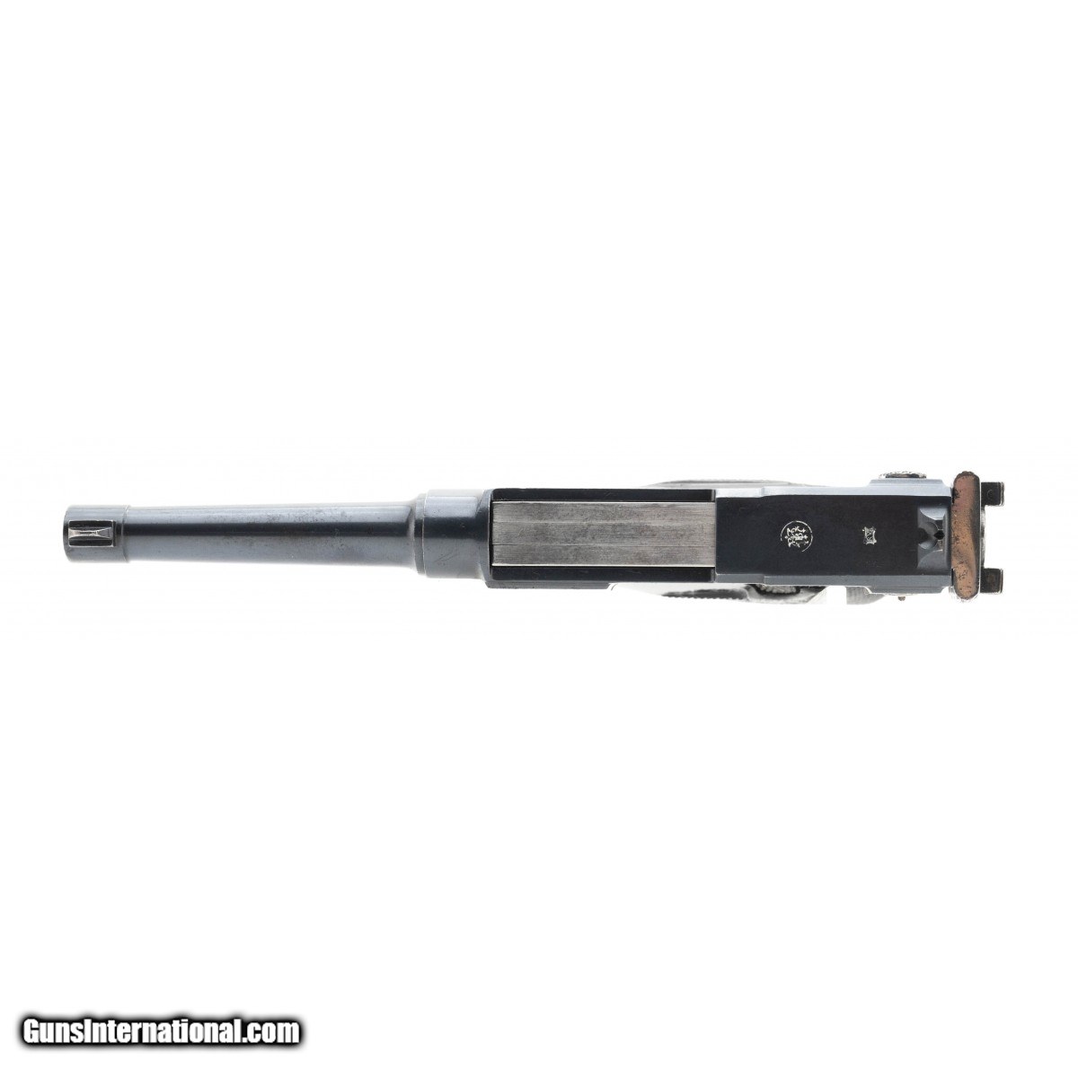 Description: " Semi-auto pistol with 4"" barrel. Bore is good with good rifling that is dark in the grooves. The grips are very good plus and have the Glisenti logo on both sides. The front grips strap serves as a grip safety with knurling for the non slip safety. The action works correctly. The pistol has approximately 98% of its original factory blue. Serial numbers are matching. This is a very fine example of the seldom seen Glisenti 1910! SOLD Curio/Relic: Yes |