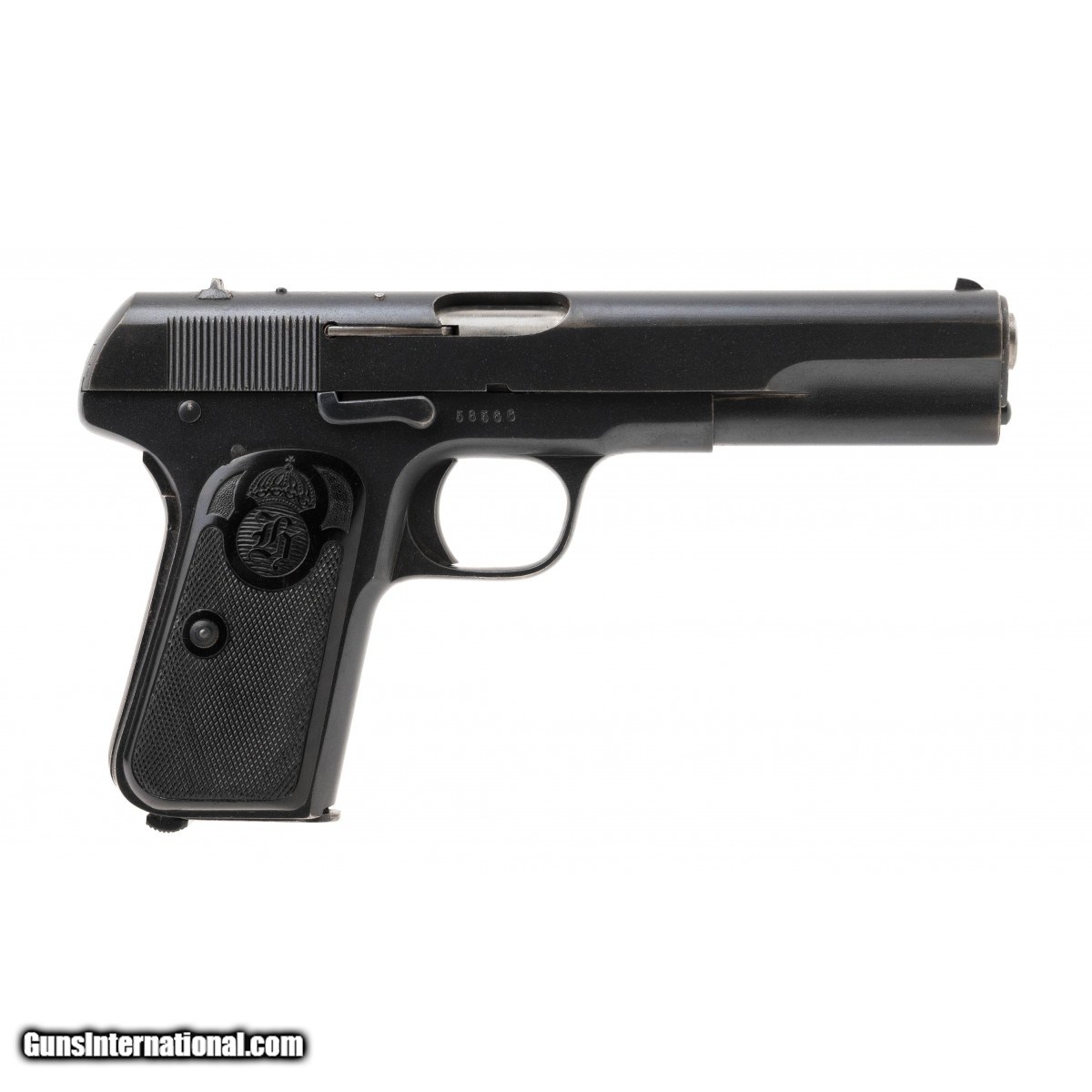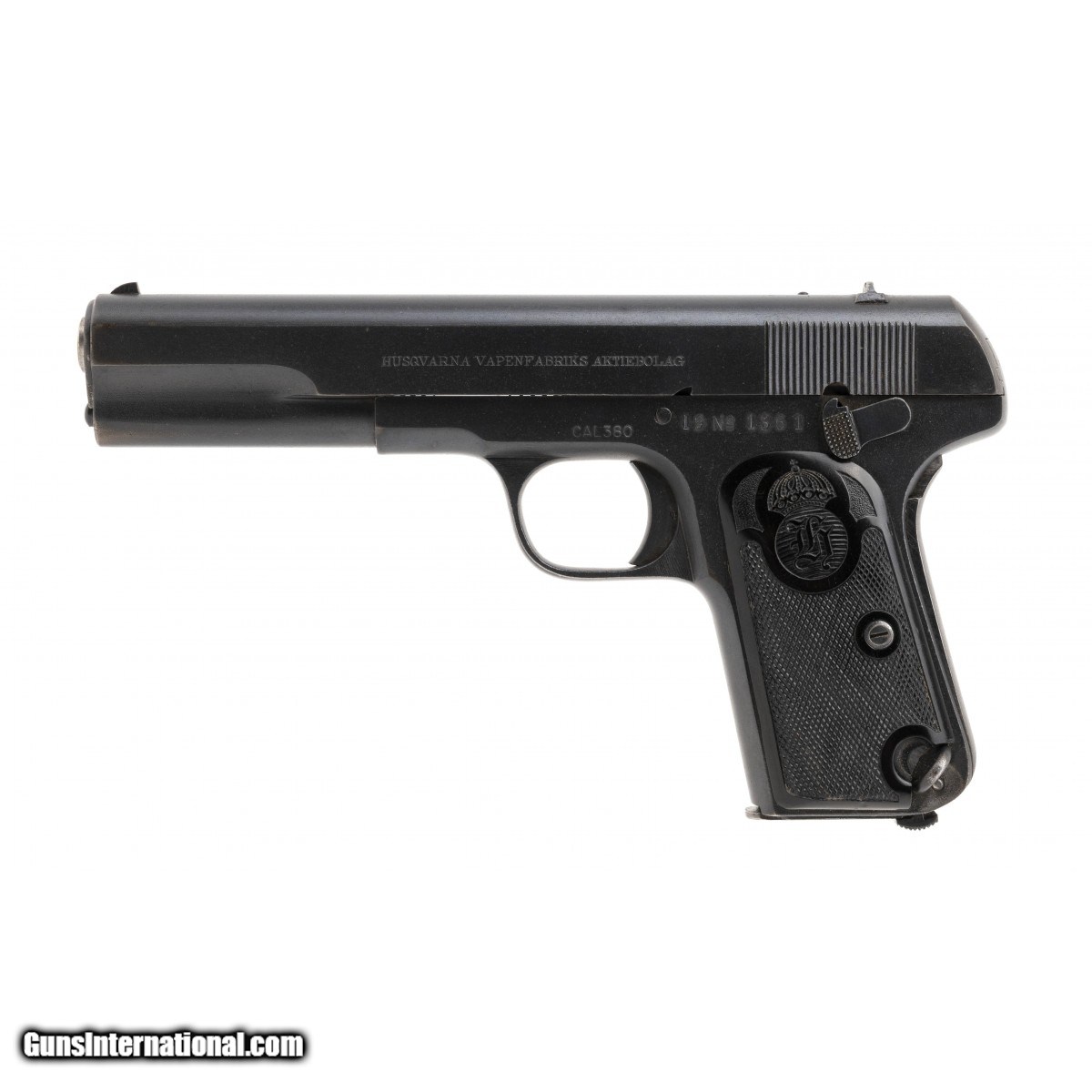 The Swedish Army Model 1907 pistol is a copy of the Browning Model 1903. It was used by the Swedish Army from 1907 to 1940. Originally chanbered for the 9mm long (9X20 Browning or 9mm Largo) many, like this one, were converted to 380 ACP when they were imported into the U.S. The 5"" barrel has an excellent bore with bright, strong rifling. The gun has approx. 96% of its military dull blue finish. The left side of the slide is maked HUSQVARNA VAPENFABRIKS AKTIEBOLAG. The left side of the frame has CSL 380 above the trigger and unit markings of 19 No 1361 to the rear. There is a crown over GB at the rear of the frame. The checkered hard rubber grips, wiht a crown over H logo at the top, are excellent with no cracks or chips. The action functions correctly. This is a great example of the Swedish Model 1907 Army pistol in a shootable caliber.