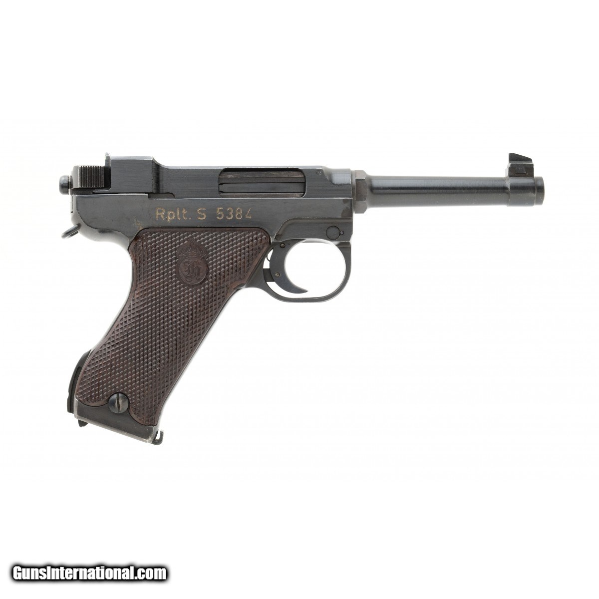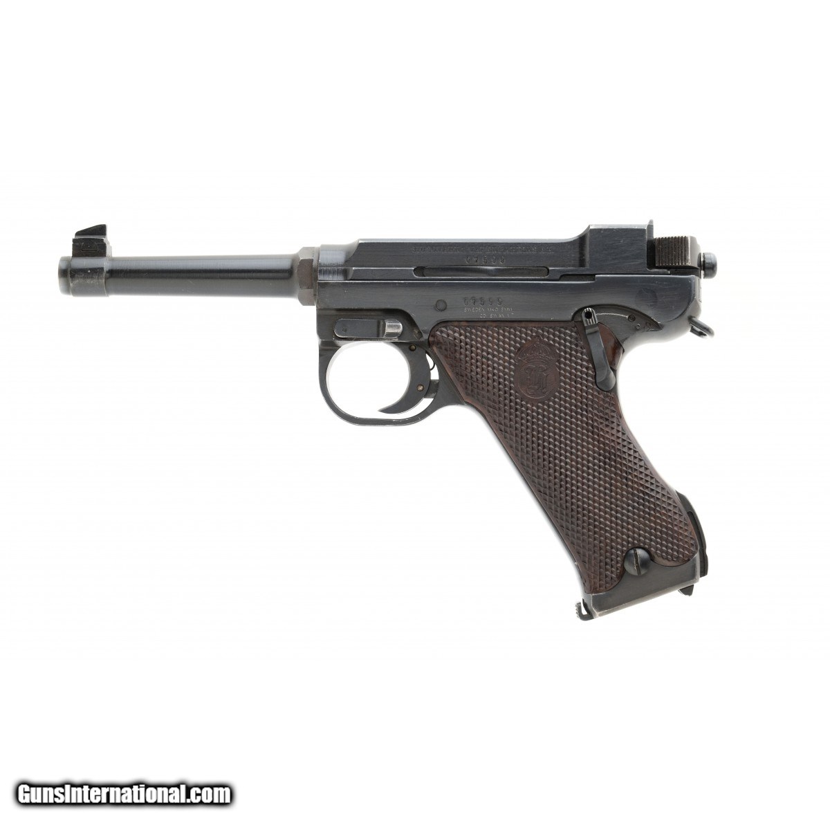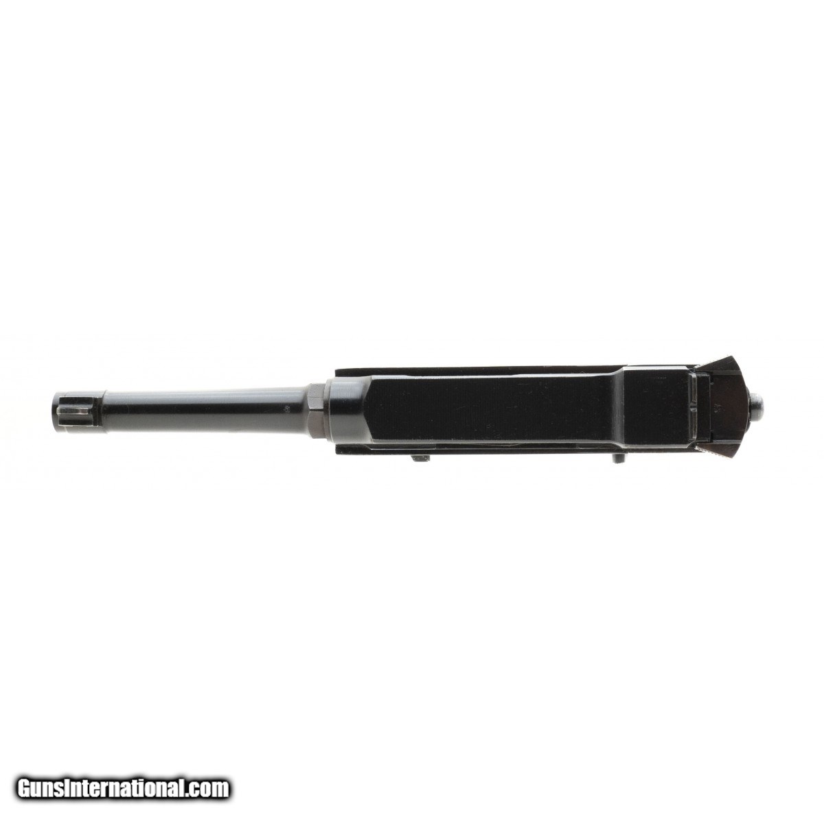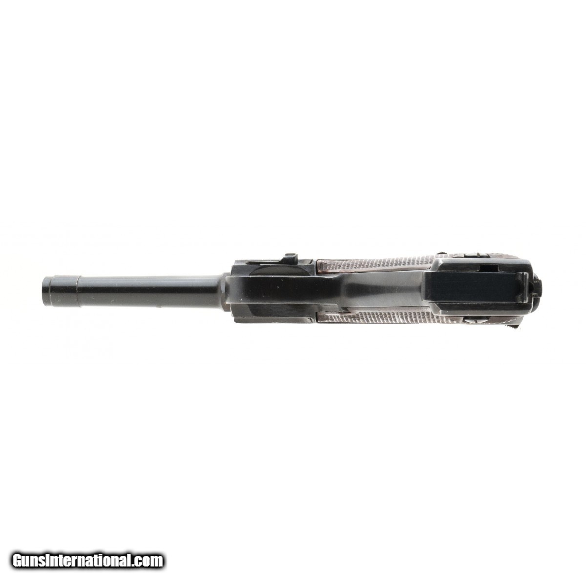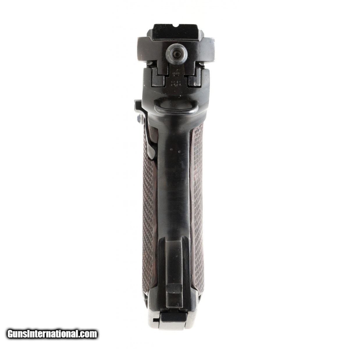 Swedish military pistol. The bore is excellent with bright, strong rifling. The gun has about 97% bright blue. The right side of the frame is unit marked Rplt. S 5384. There is a small import mark on the left side of the frame below the serial number. The excellent plastic grips have a Swedish crown on them. The action functions correctly. Model 40 production ended in 1946. This is a great example of the Lahti Model 40.