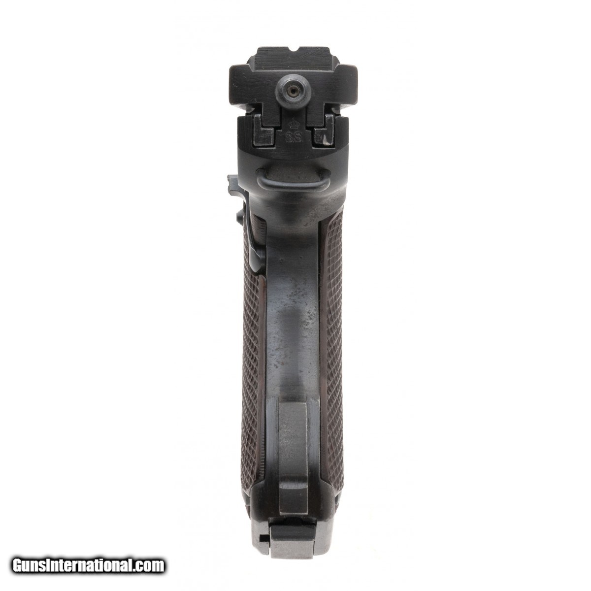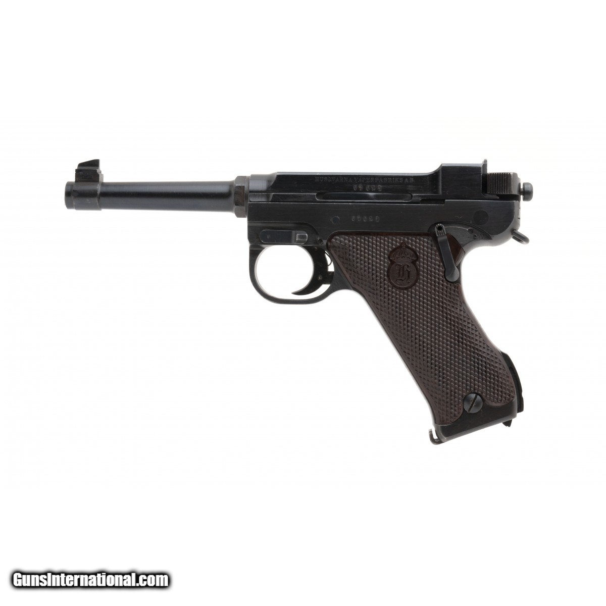 Description: " The 9mm Swedish Model 40 Lahti pistol was designed by Almo Johannes Lahti of Finland. With some improvements by Husqvarna, it was adopted as the standard Swediah military sidearm in 1942. The left side of the slide is marked HUSQVARNA VAPENFABRIKS A.B. and each grip has the Swediah crown. The front of the frame is import-marked RIDGEFIELD N.J. The gun has approx. 97% blue. The 5.5"" barrel has an excellent bore with bright, strong rifling. The plastic grips are excellent. The 8-shot magazine is fine. The action functions properly. This great example of the Swedish Lahti pistol is ready for your Swedish or European military pistol collection. SOLD |