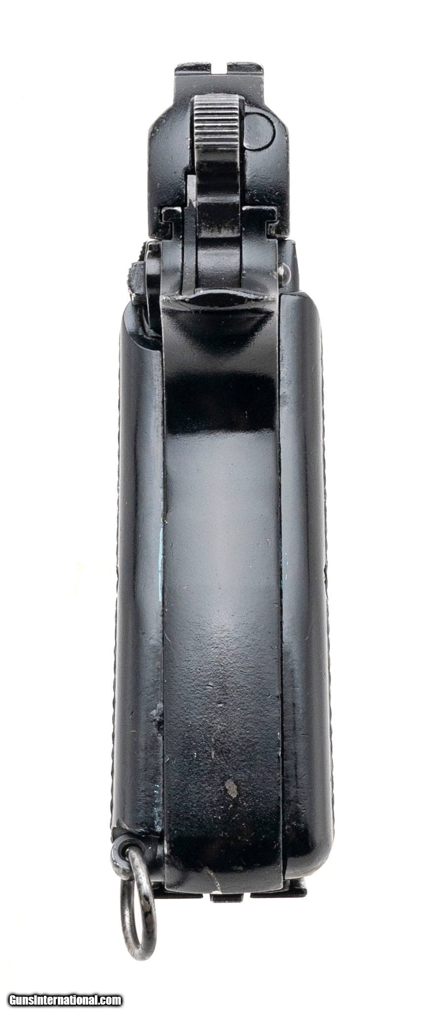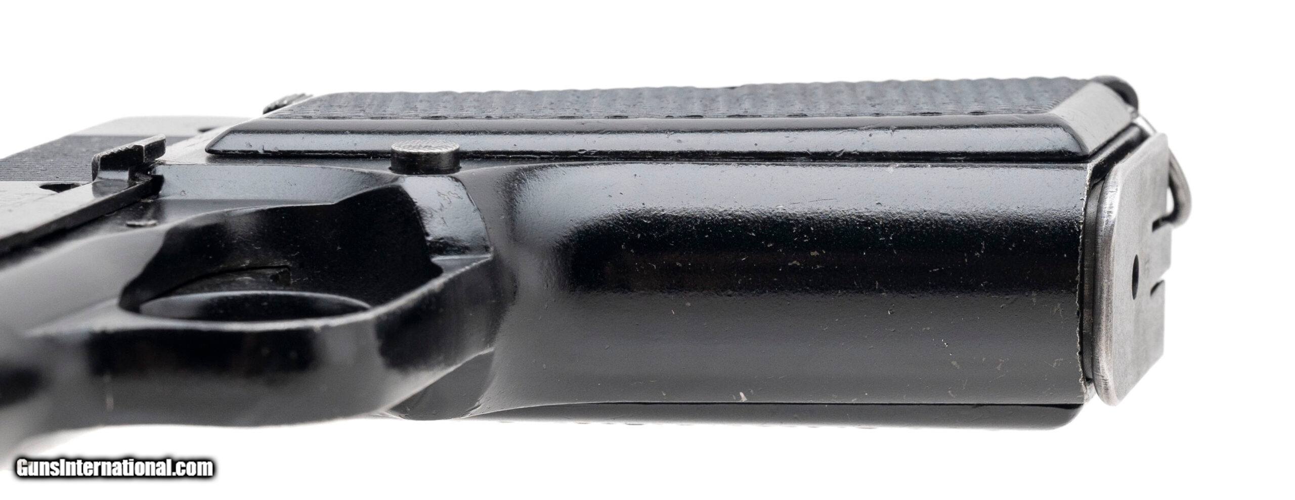Description: "Serial No. 7T2689, circa 1944, 9mm, 4 5/8" round barrel. Bore is good with some light frosting visible in the grooves, rifling remains strong. Serial numbers are matching on barrel, slide and receiver. 97% finish remains with scattered edge wear noted. Grips are in excellent condition; magazine is correctly marked with “JI" stamp. Action is smooth and functions correctly. Price: $1,495.00 Contact Seller |