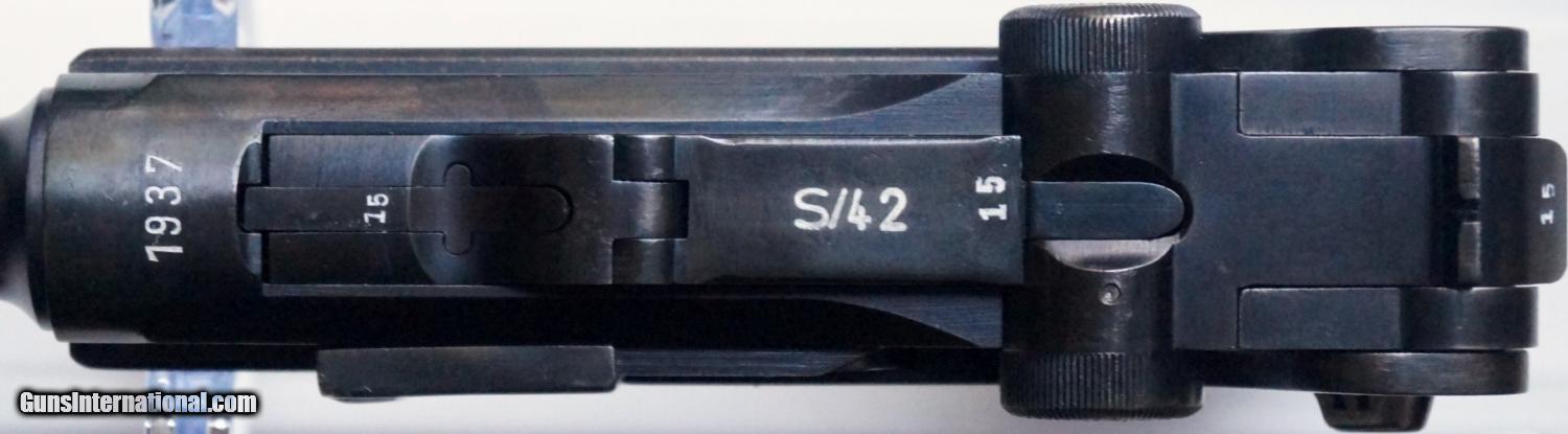 Description: THIS IS A 1937 S/42 NAZI GERMAN LUGER RIG, 9MM. THE LUGER IS IN VERY GOOD CONDITION, ALL ORIGINAL, NUMBER MATCHING INSIDE AND OUT( GRIPS AND BOTH MAGAZINES ARE NUMBERED TO THE GUN), VERY GOOD BORE AND GRIPS, MECHANICALLY CORRECT AND TIGHT, THE RIG CONSISTS OF THE LUGER, 2 ORIGINAL NAZI MARKED MAGAZINES, 1 ORIGINAL NAZI MARKED HOLSTER AND 1 ORIGINGL NAZI MARKED LOADING TOO. A VERY NICE WWII NAZI GERMAN LUGER RIG. SOLD Curio/Relic: Yes |