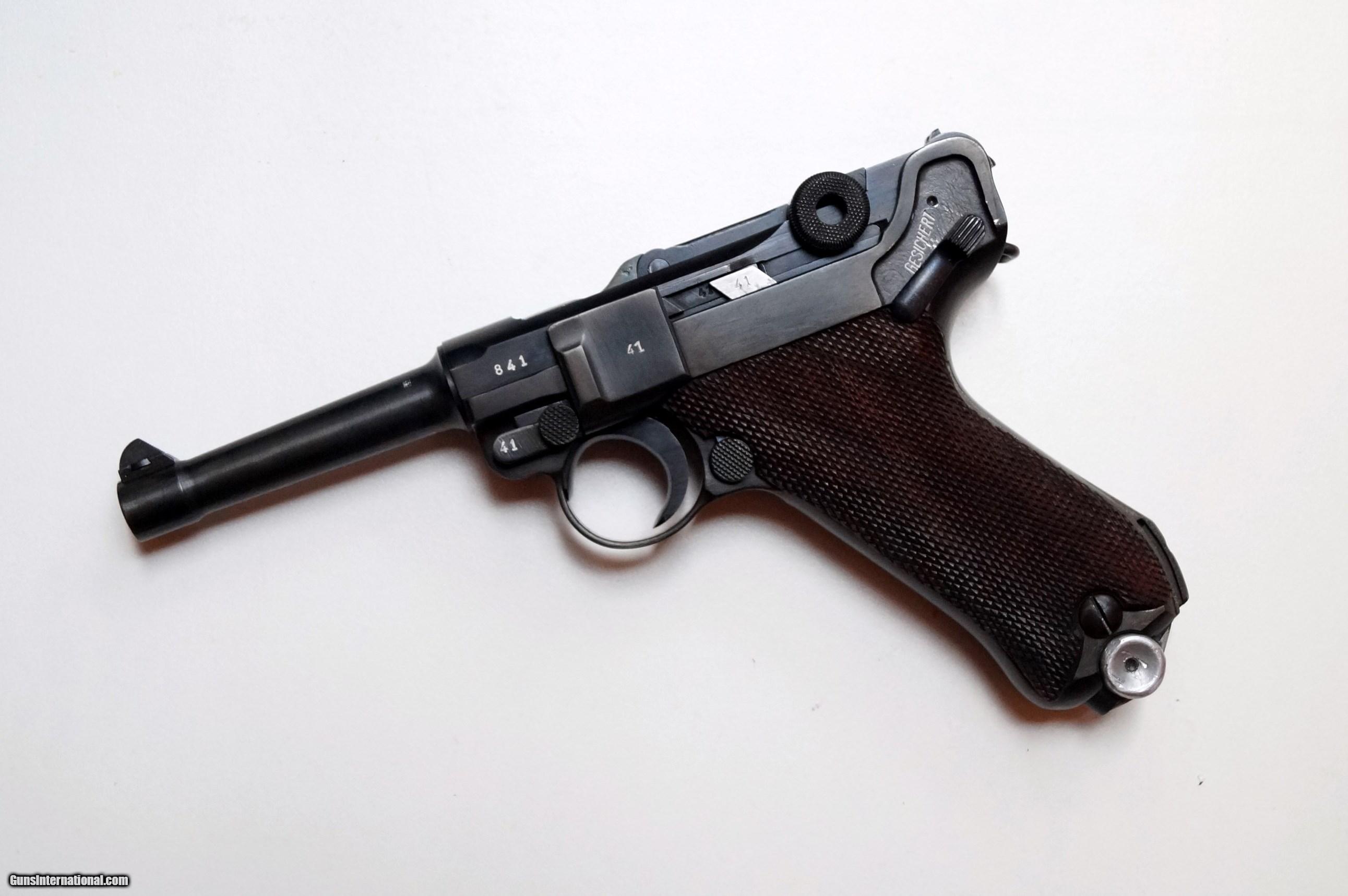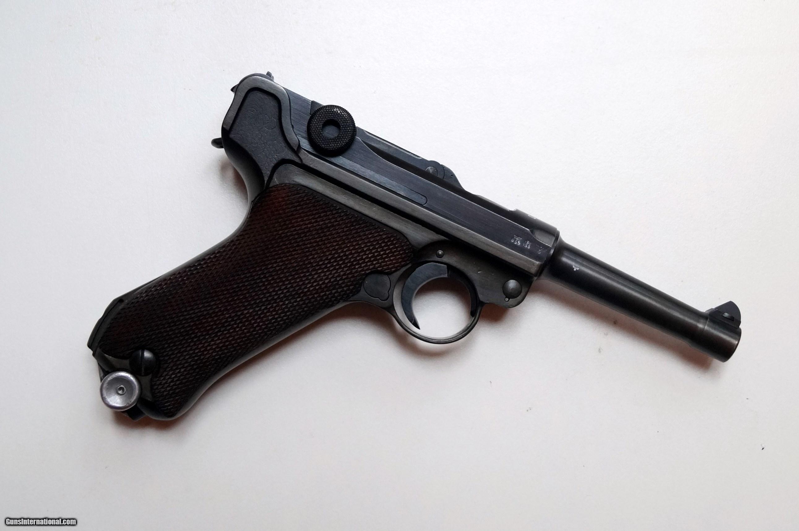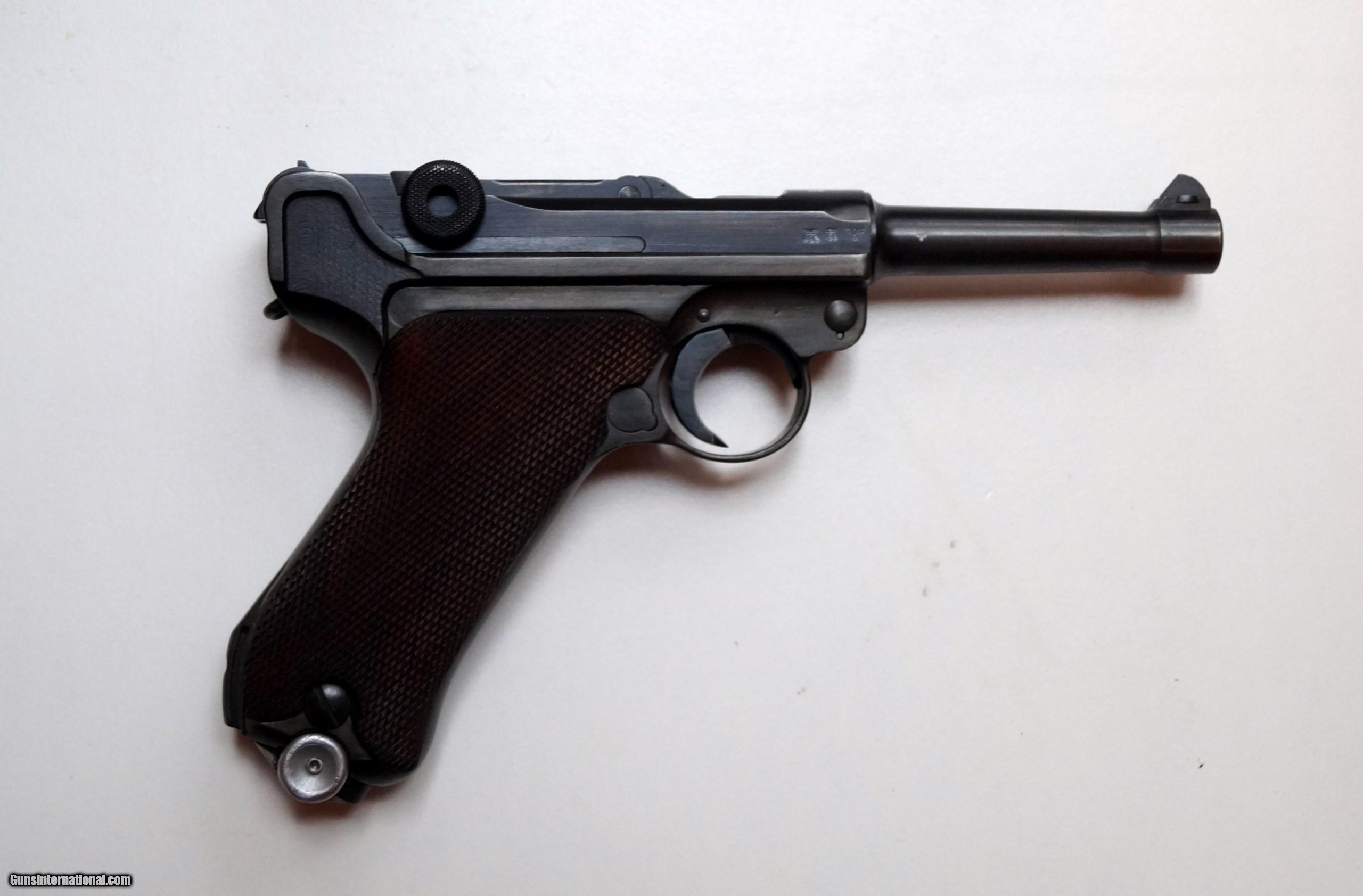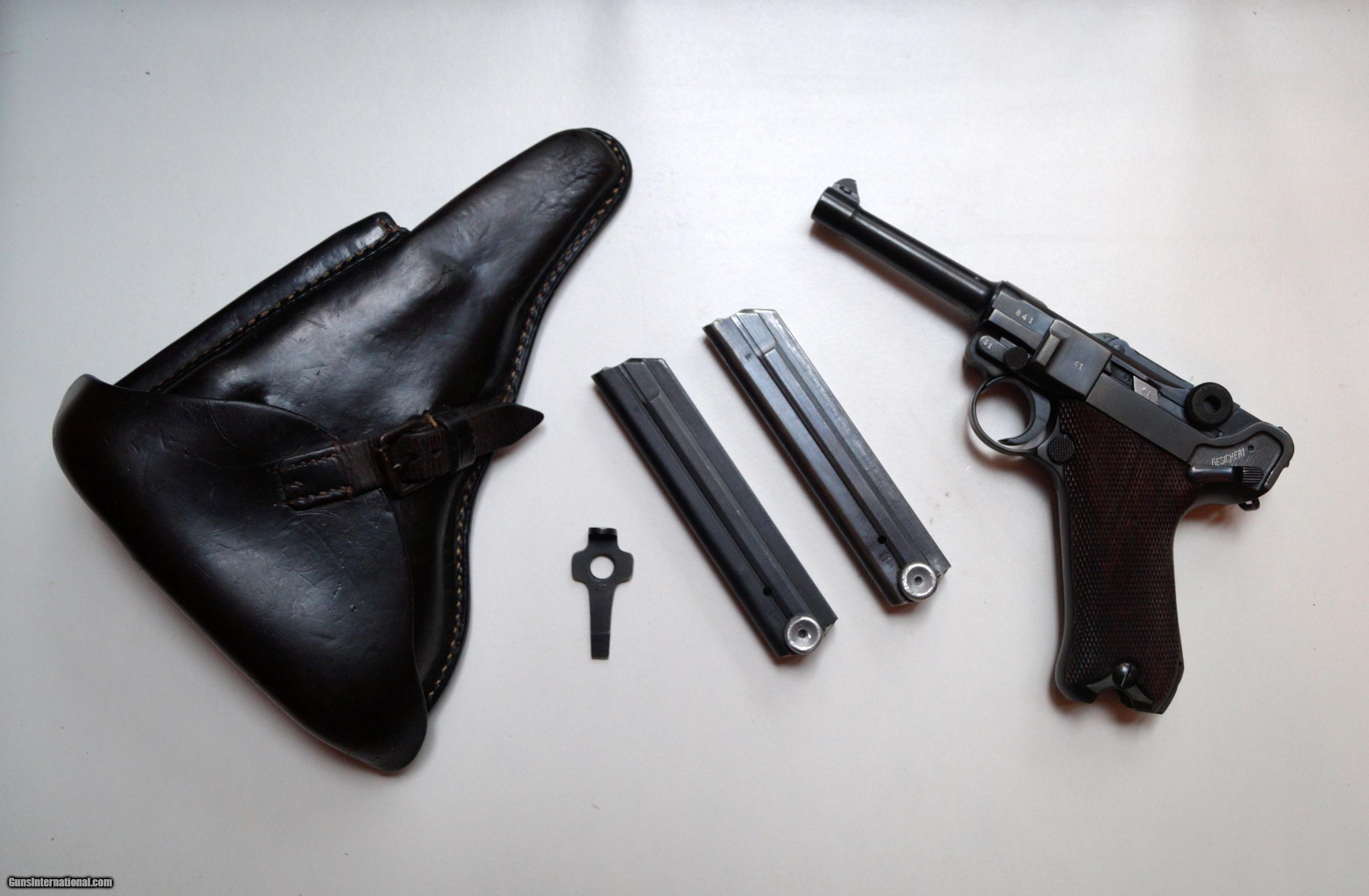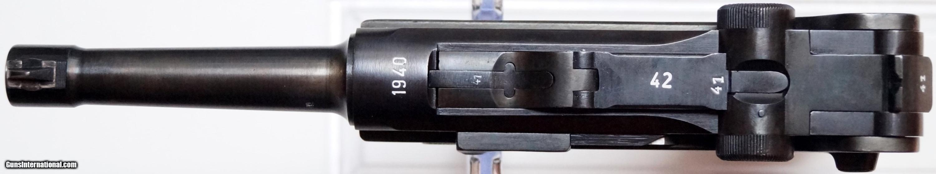 Description: THIS IS A 1940 CODE 42 (MAUSER) NAZI GERMAN LUGER RIG, 9MM. THE LUGER IS IN VERY GOOD CONDITION, ALL ORIGINAL, NUMBER MATCHING, VERY GOOD BORE AND GRIPS (ARE NUMBERED TO THE GUN), MECHANICALLY CORRECT AND TIGHT. THE RIG CONSISTS OF THE LUGER, 2 ORIGINAL NAZI MARKED NUMBERED TO THE GUN MAGAZINES, 1 ORIGINAL NAZI MARKED HOLSTER AND 1 NAZI MARKED LOADING TOOL. A VERY NICE WWII NAZI GERMAN LUGER RIG. SOLD Curio/Relic: Yes |