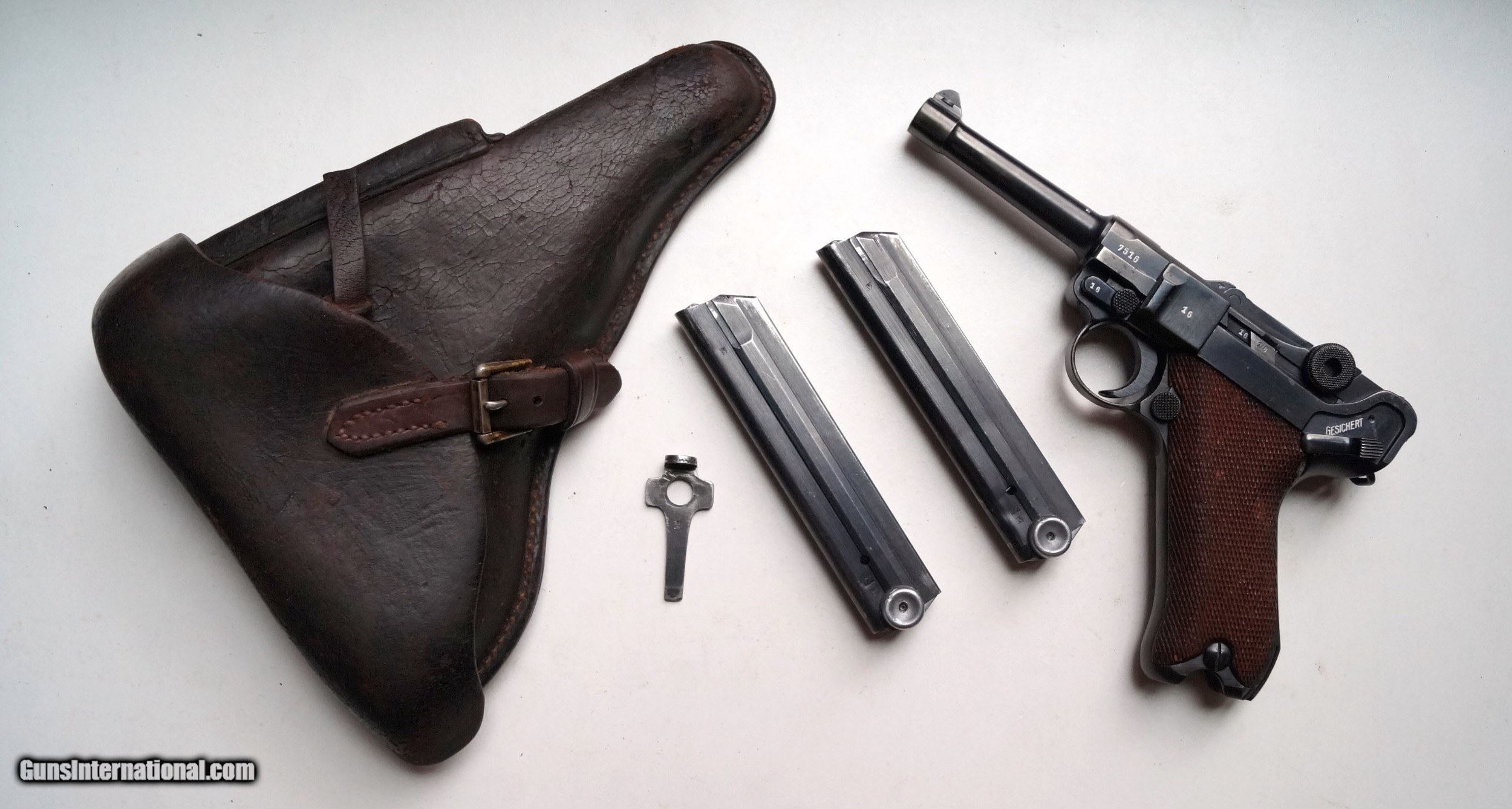 Description: THIS IS A 1940 CODE 42 (MAUSER) NAZI GERMAN LUGER RIG, 9MM. THE LUGER IS IN VERY GOOD CONDITION, NUMBER MATCHING (THIS INCLUDES BOTH MAGAZINES AND BOTH GRIPS), VERY GOOD BORE AND GRIPS, MECHANICALLY CORRECT AND TIGHT. THE RIG CONSISTS OF THE LUGER, 2 NAZI MARKED NUMBERED TO THE GUN MAGAZINES, 1 ORIGINAL NAZI MARKED 1940 DATED HOLSTER AND 1 ORIGINAL NAZI MARKED LOADING TOOL. A VERY NICE WWII NAZI GERMAN LUGER RIG. SOLD Curio/Relic: Yes |