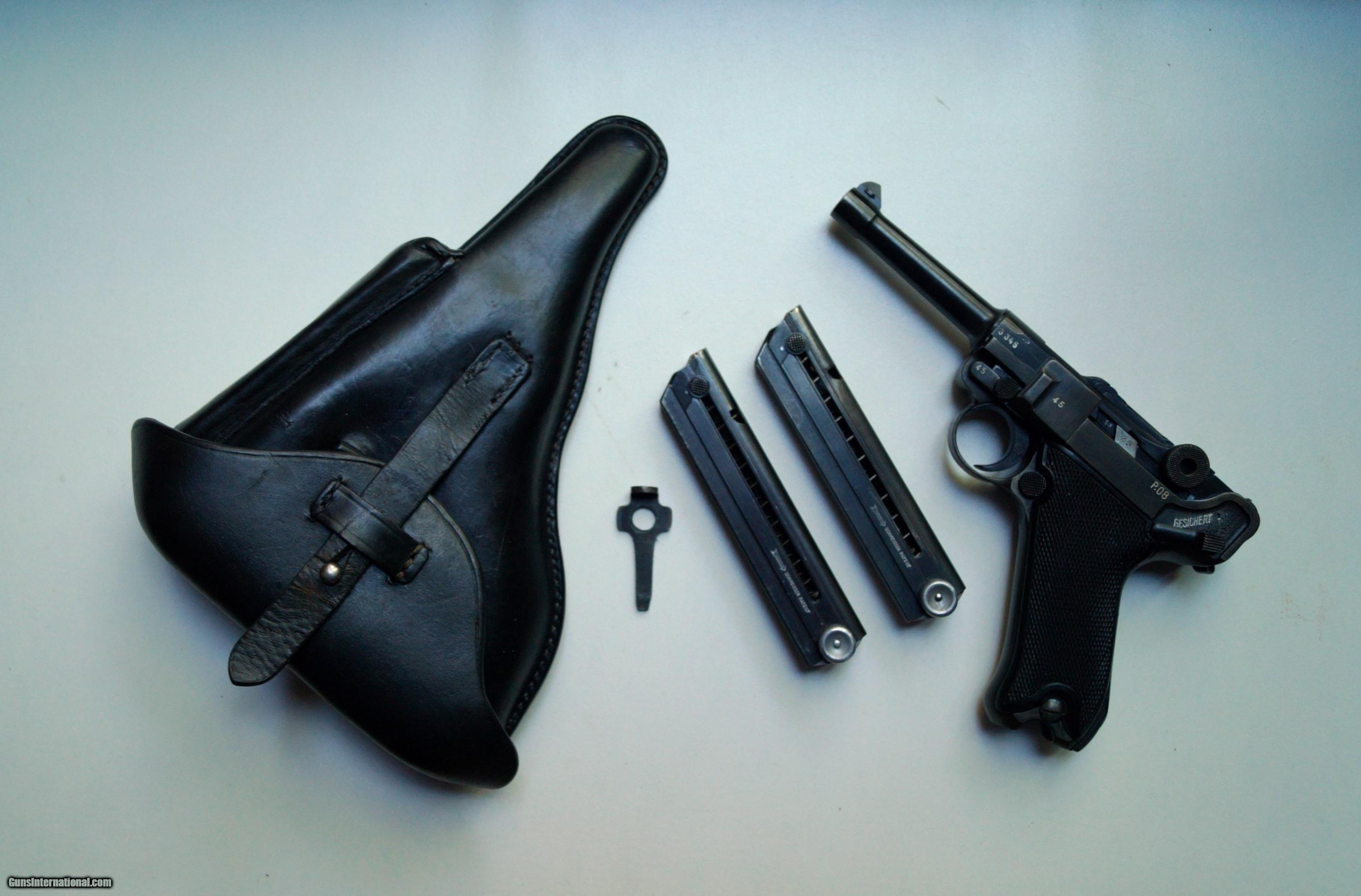 Description: THIS IS A 1942 MAUSER BANNER NAZI POLICE RIG, 9MM. THE LUGER IS IN VERY GOOD CONDITION. ALL ORIGINAL, NUMBER MATCHING INSIDE AND OUT ( BOTH MAGAZINES ARE NUMBERED TO THE GUN, VERY GOOD BORE AND GRIPS, MECHANICALLY CORRECT AND TIGHT. THE RIG CONSISTS OF THE LUGER, 2 ORIGINAL NAZI HANEL SCHMEISSER MAGAZINES, 1 ORIGINAL OTTO SINDEL POLICE HOLSTER AND 1 ORIGINAL NAZI POLICE MARKED LOADING TOOL. THEY DON'T COME BETTER THAN THIS. SOLD Curio/Relic: Yes |