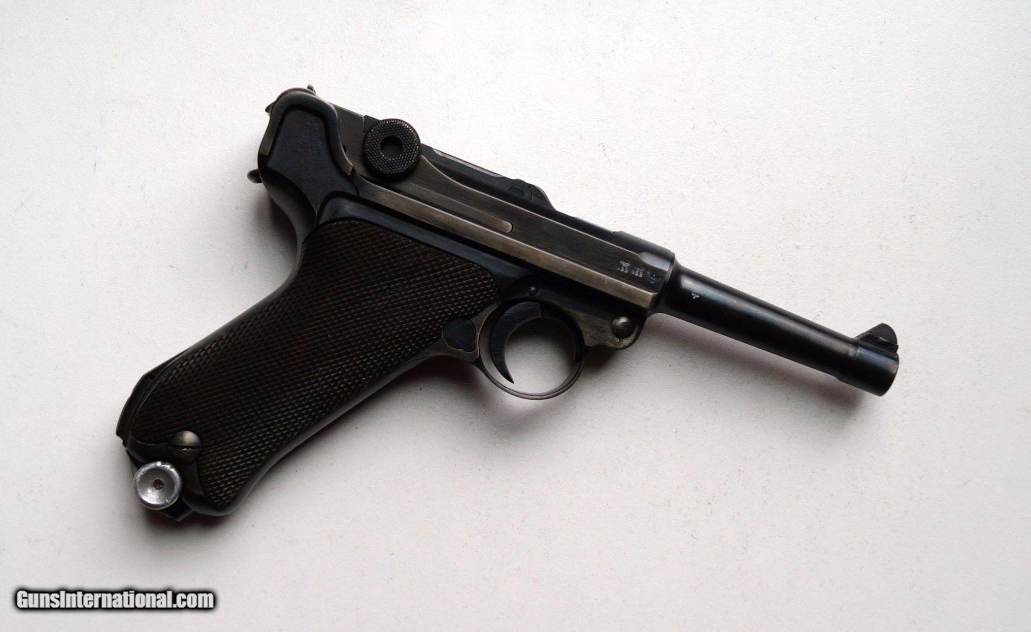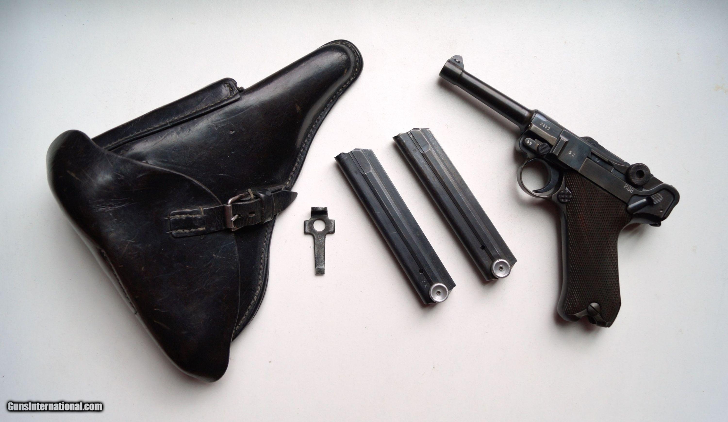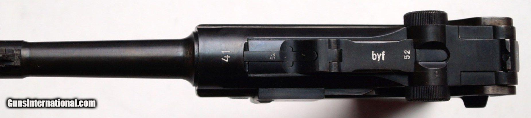 Description: THIS IS A 41 BYF (MAUSER) BLACK WIDOW NAZI GERMAN LUGER RIG, 9MM. THE LUGER IS IN VERY GOOD CONDITON, NUMBER MATCHING (THIS INCLUDES BOTH ORIGINAL MAGAZINES), VERY GOOD BORE AND GRIPS, MECHANICALLY CORRECT AND TIGHT. THE RIG CONSISTS OF THE LUGER, 2 ORIGINAL NAZI FXO MAGAZINES, 1 ORIGINAL 1941 DATED HOLSTER AND 1 ORIGINAL NAZI MARKED LOADING TOOL. A VERY NICE WWII NAZI BLACK WIDOW GERMAN LUGER RIG. NOTE: THE 2 NUMBERED TO THE GUN MAGAZINES ARE A RARITY. THEY CAN ONLY BE FOUND ON VERY EARLY 1941 GERMAN LUGERS. SOLD Curio/Relic: Yes |