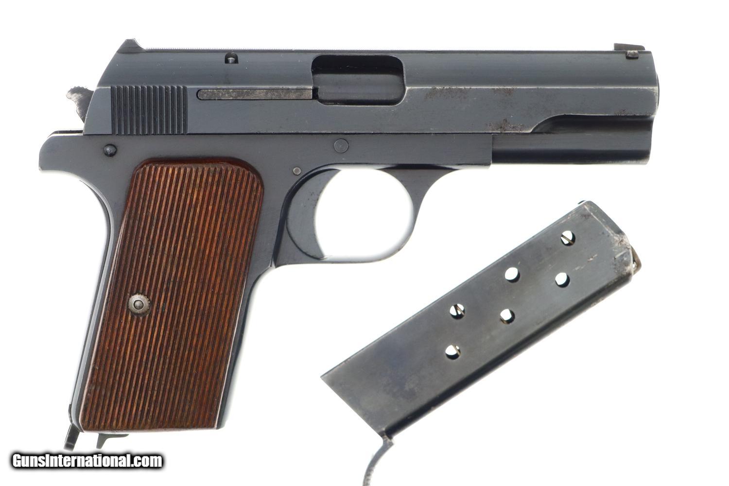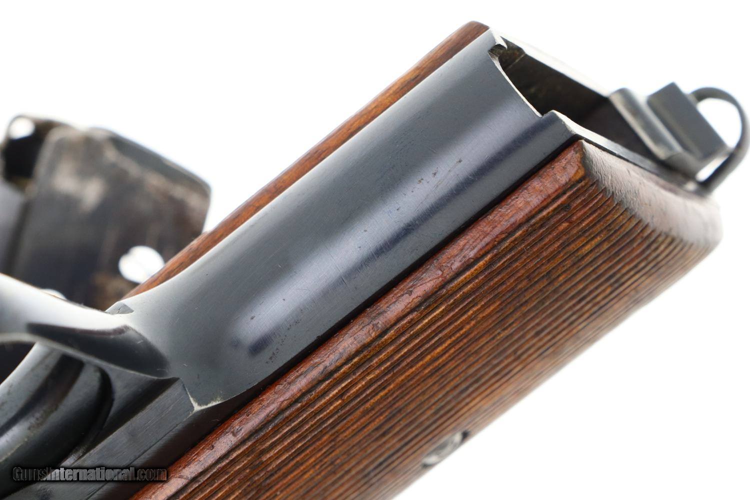 Description: Synopsis: Attractive and all Matching Femaru Model 37, German WWII Army, 49568, FB01195 Description: Standard configuration Femaru Model 37 pistol as issued to the German Army in 1941. Left side of slide marked with the pistol reference and caliber followed by the “jhv 41". Full serial number on left side of frame, left side of slide, left side of barrel, and inner surface of magazine finger extension. Usual scattering of Nazi era acceptance proofs; E/WaA58 on the trigger guard web. Major and minor components with a polished salt blue. Wood grips with fine vertical serrations. Matching magazine with pistol reference on floorplate. Condition: VG+ original salt blue with sharp edge wear and small areas of oxidative spotting as carefully photographed. Mirror bore. Perfect manual mechanics. A very nice, no excuse, and all matching Femaru Model 37 as issued to the German Army in 1941. ~~Insured shipping fee of $55; most packages shipped using FedEx 2nd Day.~~ SOLD Curio/Relic: Yes Manufacturer: Fermaru Serial Number: 49568 Caliber Info: 7.65mm |