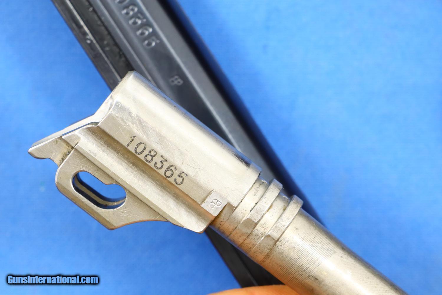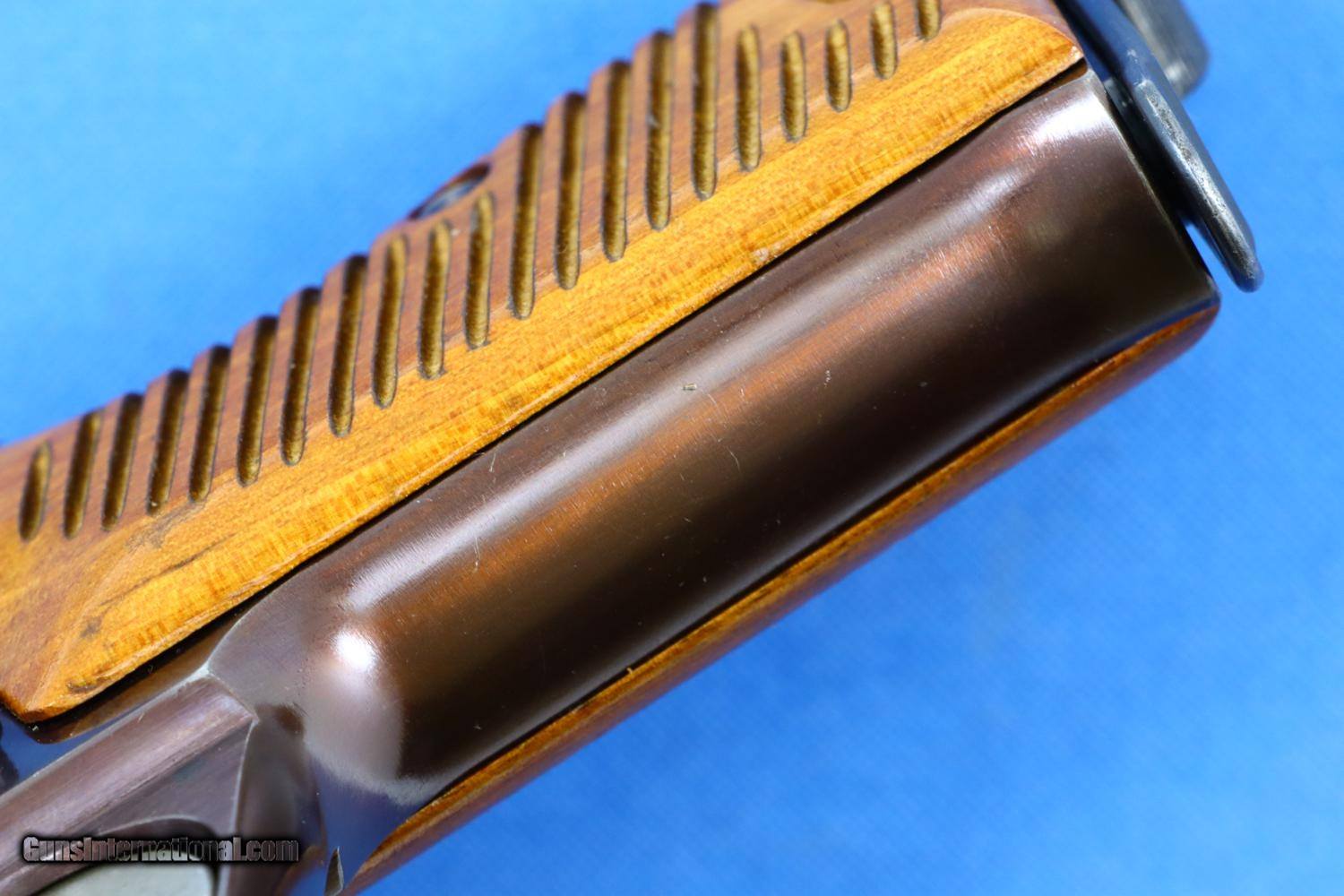 Excellent 98+% original salt blue, with plum frame, holster wear as expected from a pistol that has seen minimal field use. No suggestion of touch-up. Comparable condition grips and magazine. Mirror bright bore. Perfect manual mechanics. An extremely attractive pistol with plum frame that would be extremely difficult to upgrade, with commercial box a neat added accessory!