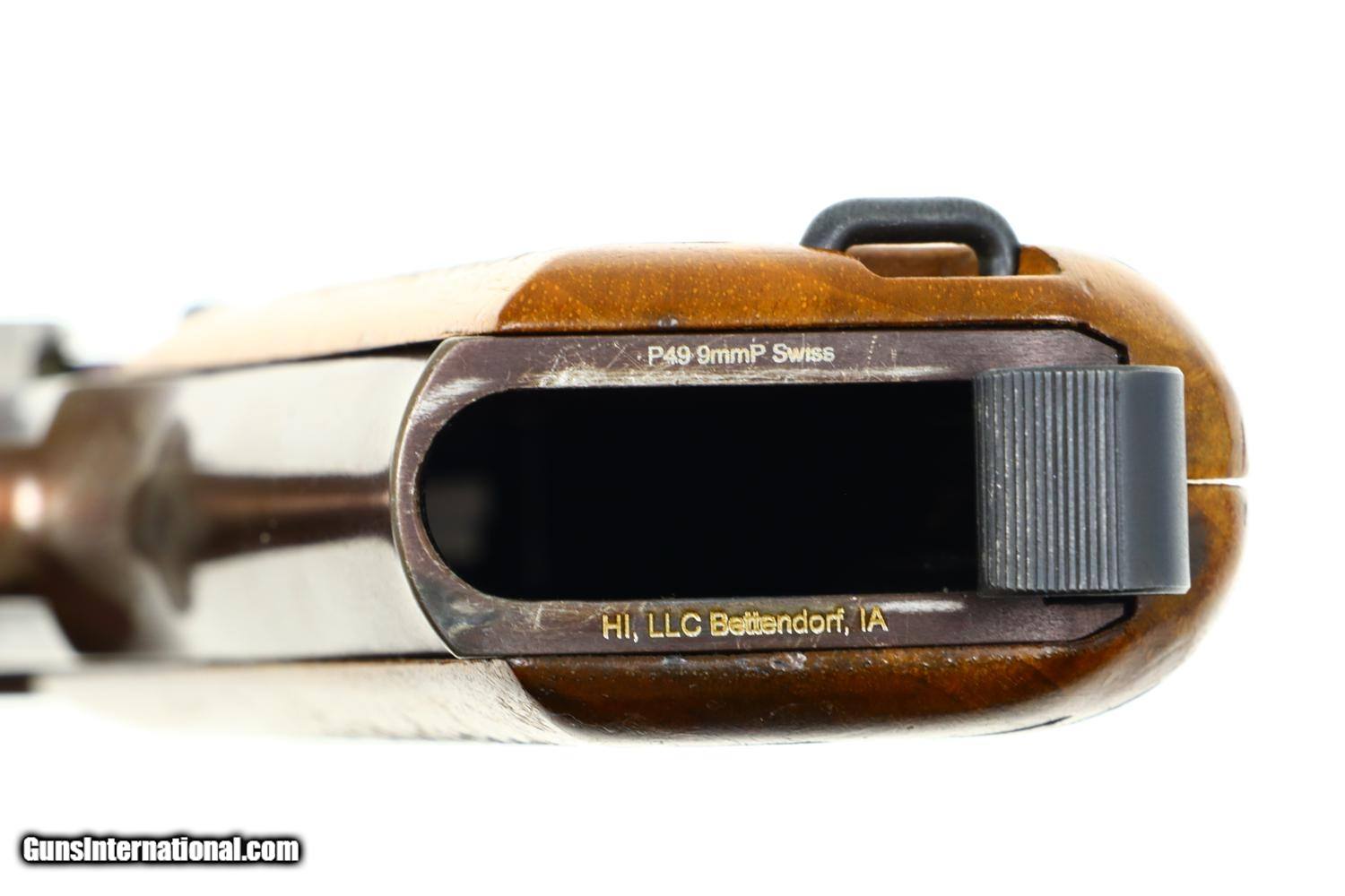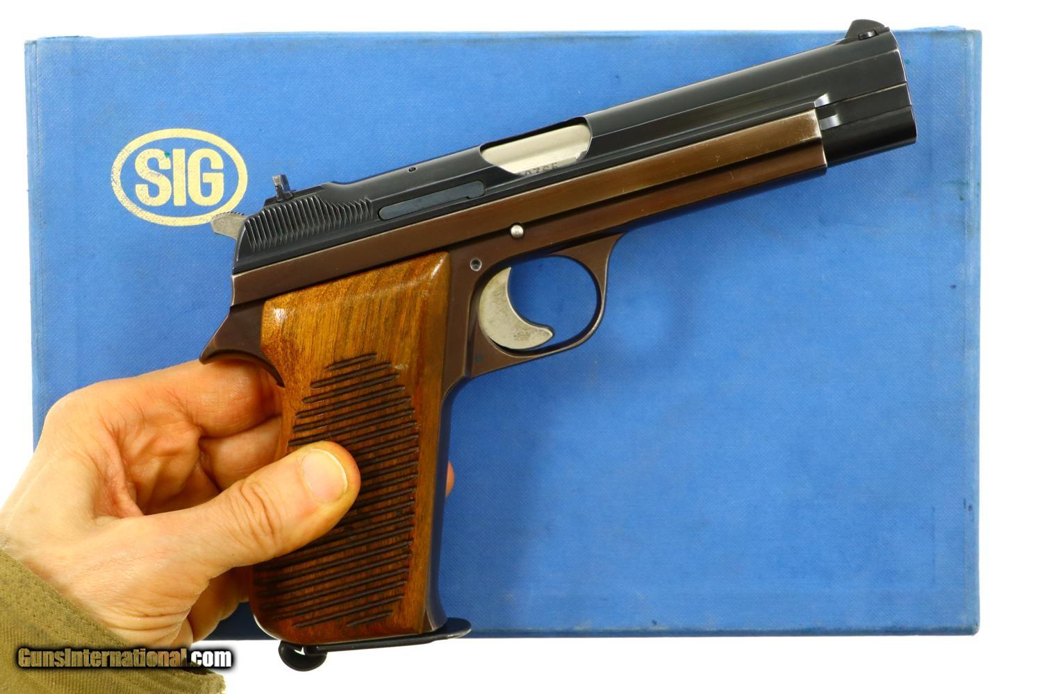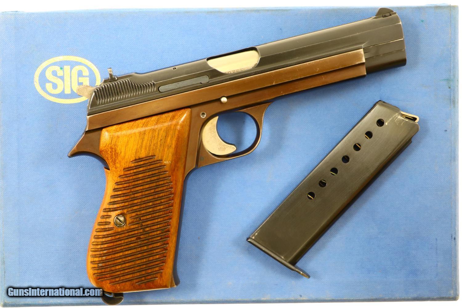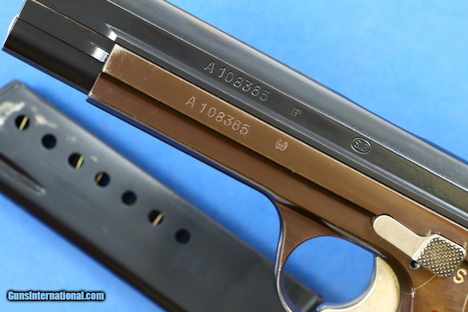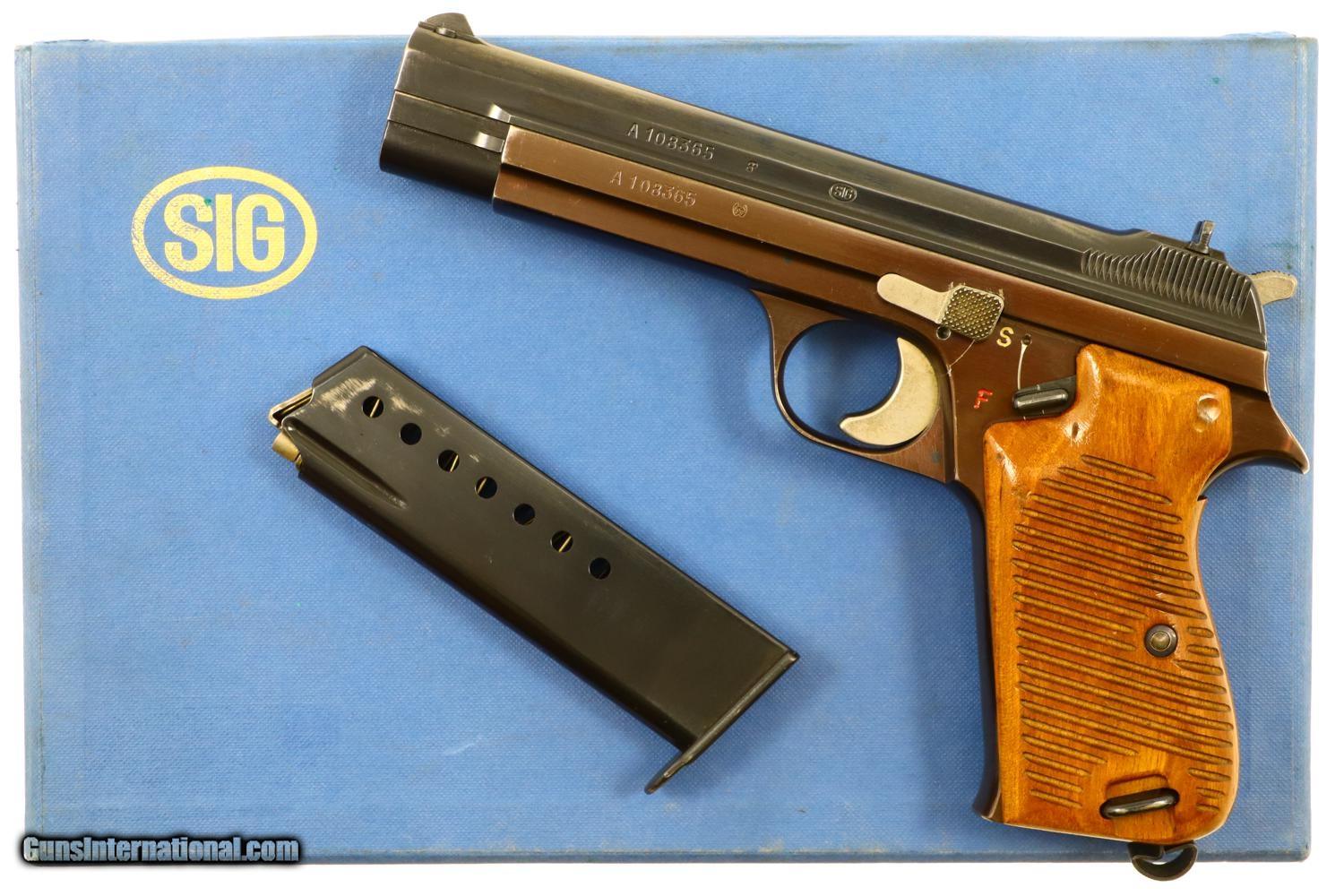 Standard configuration SIG P49 military single action pistol, in 9mmP, with 4.75” barrel and drift adjustable front and rear sight. The left side of the slide and plum frame are proofed and marked with the full serial number that is repeated on the right side of the barrel hood. Safety detents are marked with an “S” in white and “F” in red. “P” release on front of trigger guard. Disassembly shows a matching, updated hammer group with half cock. Fitted with serrated walnut grips secured with fire blued screw. Fixed lanyard ring. Correct high polish magazine. Complete with original blue SIG box as would normally accompany an era correct commercial pistol.