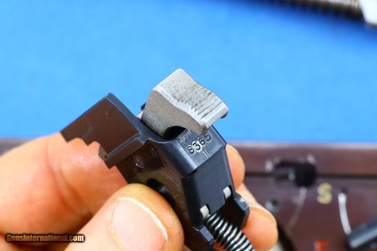 Description: Description: Standard configuration SIG P49 military single action pistol, in 9mmP, with 4.75” barrel and drift adjustable front and rear sight. The left side of the slide and plum frame are proofed and marked with the full serial number that is repeated on the right side of the barrel hood. Safety detents are marked with an “S” in white and “F” in red. “P” release on front of trigger guard. Disassembly shows a matching, updated hammer group with half cock. Fitted with serrated walnut grips secured with fire blued screw. Fixed lanyard ring. Correct high polish magazine. Complete with original blue SIG box as would normally accompany an era correct commercial pistol. Synopsis: Gorgeous, original, and all matching first variation Swiss Military P49 in blue SIG box. Condition: Excellent 98+% original salt blue, with plum frame, holster wear as expected from a pistol that has seen minimal field use. No suggestion of touch-up. Comparable condition grips and magazine. Mirror bright bore. Perfect manual mechanics. An extremely attractive pistol with plum frame that would be extremely difficult to upgrade, with commercial box a neat added accessory! SOLD Manufacturer: SIG Serial Number: A108365P Caliber Info: 9mmP |