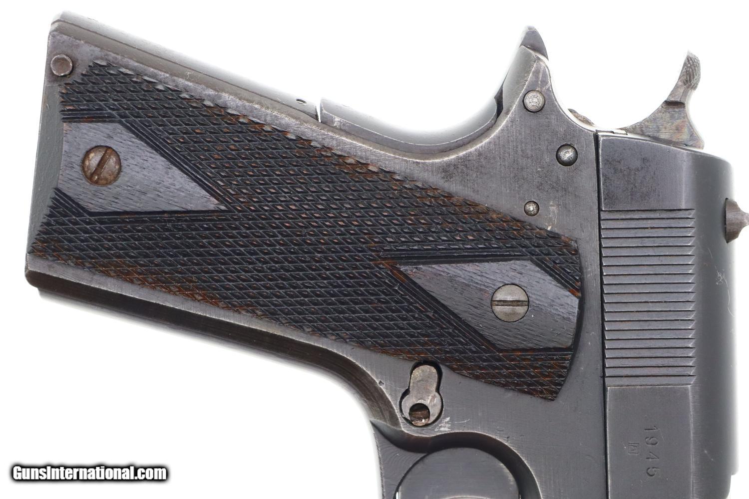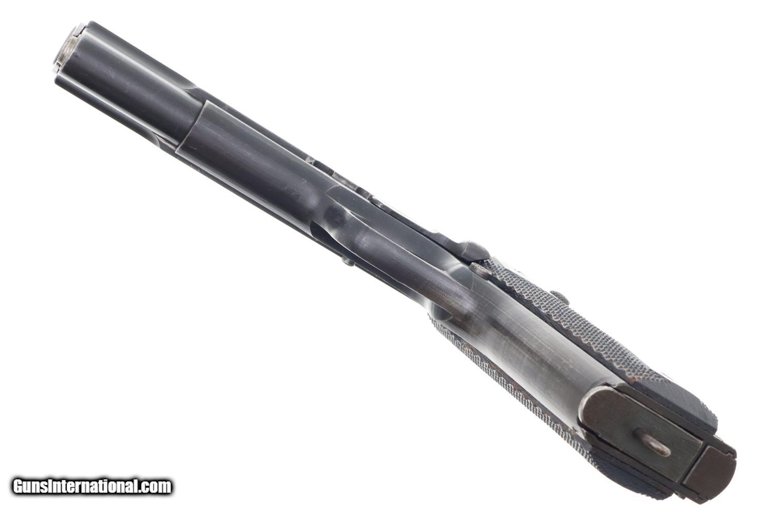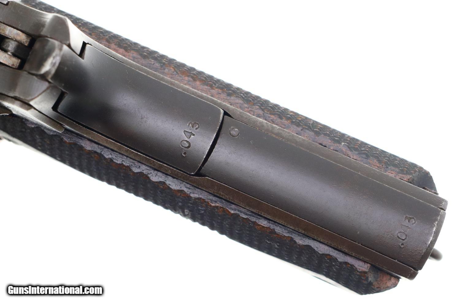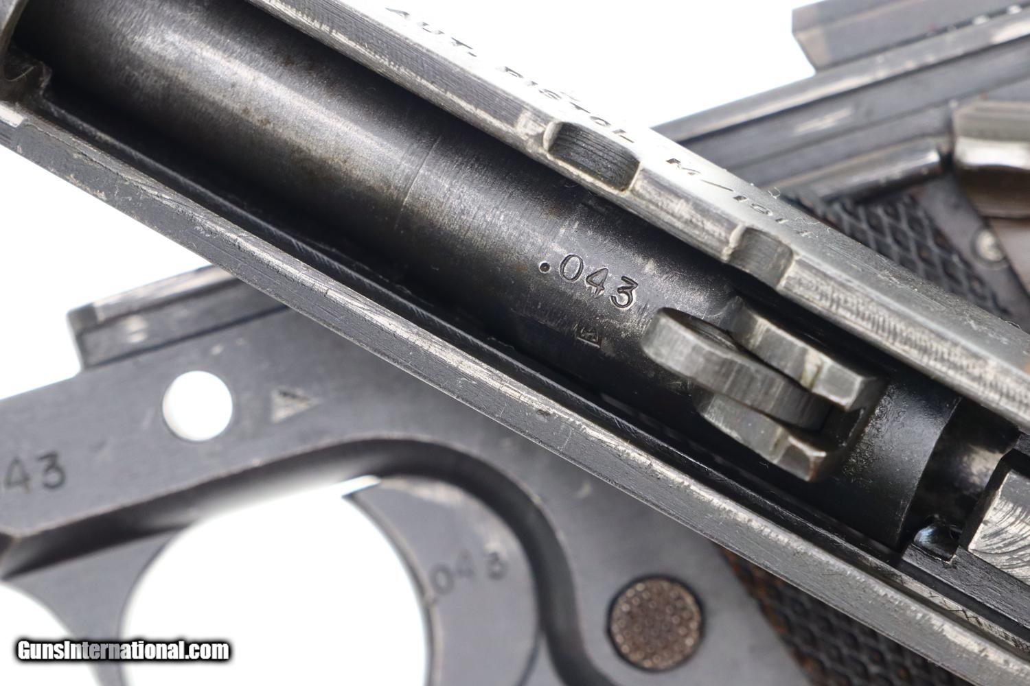 Description: Synopsis: Beautiful, all matching Norwegian 1914, Kongsberg Arsenal, 1945 Date, .45 ACP Description: Very high condition, standard configuration Norwegian model 1914, caliber .45ACP, this example dated 1945, immediately postwar. ALL MATCHING with correct, original grips, and magazine. Left side of slide with usual Norwegian reference with respect to caliber, model, and serial number. The right side of slide is dated 1945. Serial number is repeated on all major components as correct for this late assembly pistol including the frame, slide release, trigger, safety, grip safety, main spring housing and barrel. As true for the late assembly guns, the hammer, firing pin retainer, magazine release, bushing, recoil spring cap and ejector were not numbered. Grips and magazine were never numbered. All parts with original matte finish. Case hardened hammer. Fire blued extractor. Correct magazine with lanyard loop. No import marks. Condition: Near EXC original finish with sharp edge wear and light handling marks as one would expect from a carefully used pistol made right after WWII. Comparable condition grips and magazine. Bright bore with easily discernible rifling. Perfect manual mechanics. A very high condition Norwegian 1914, all matching, made in 1945! ~~Insured shipping fee of $75; most packages shipped using FedEx 2nd Day.~~ SOLD Curio/Relic: Yes Manufacturer: Kongsberg Arsenal Serial Number: 32043 Caliber Info: .45 ACP |