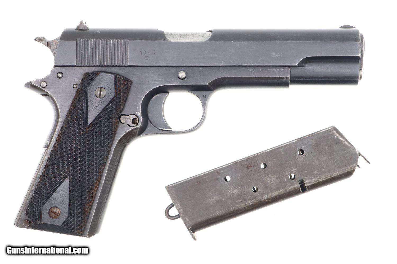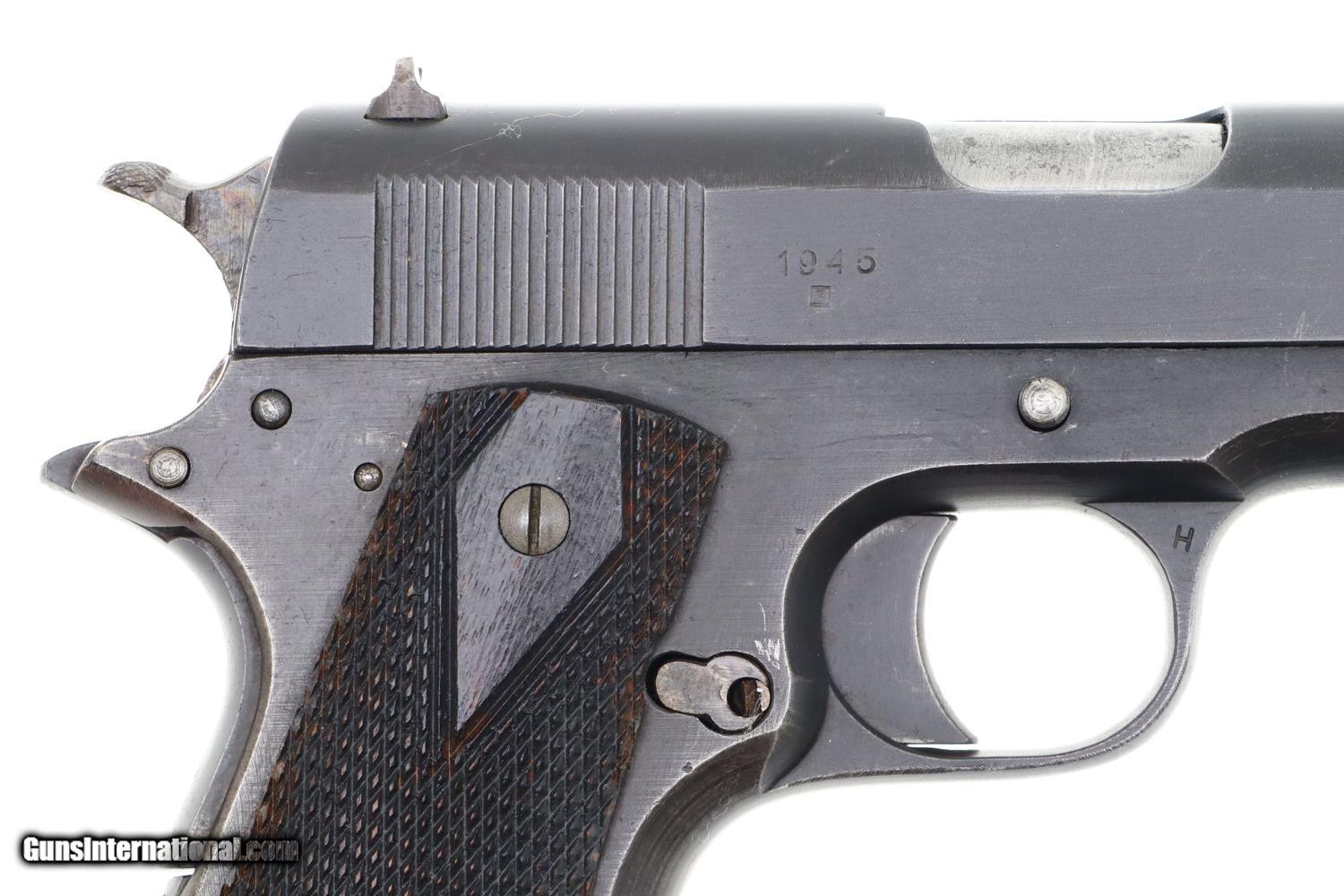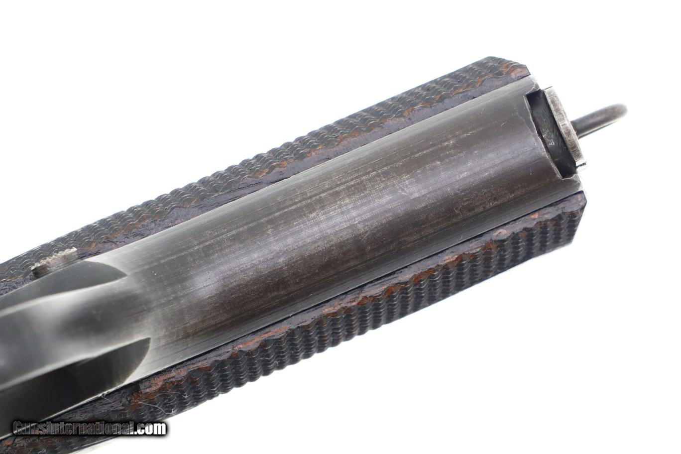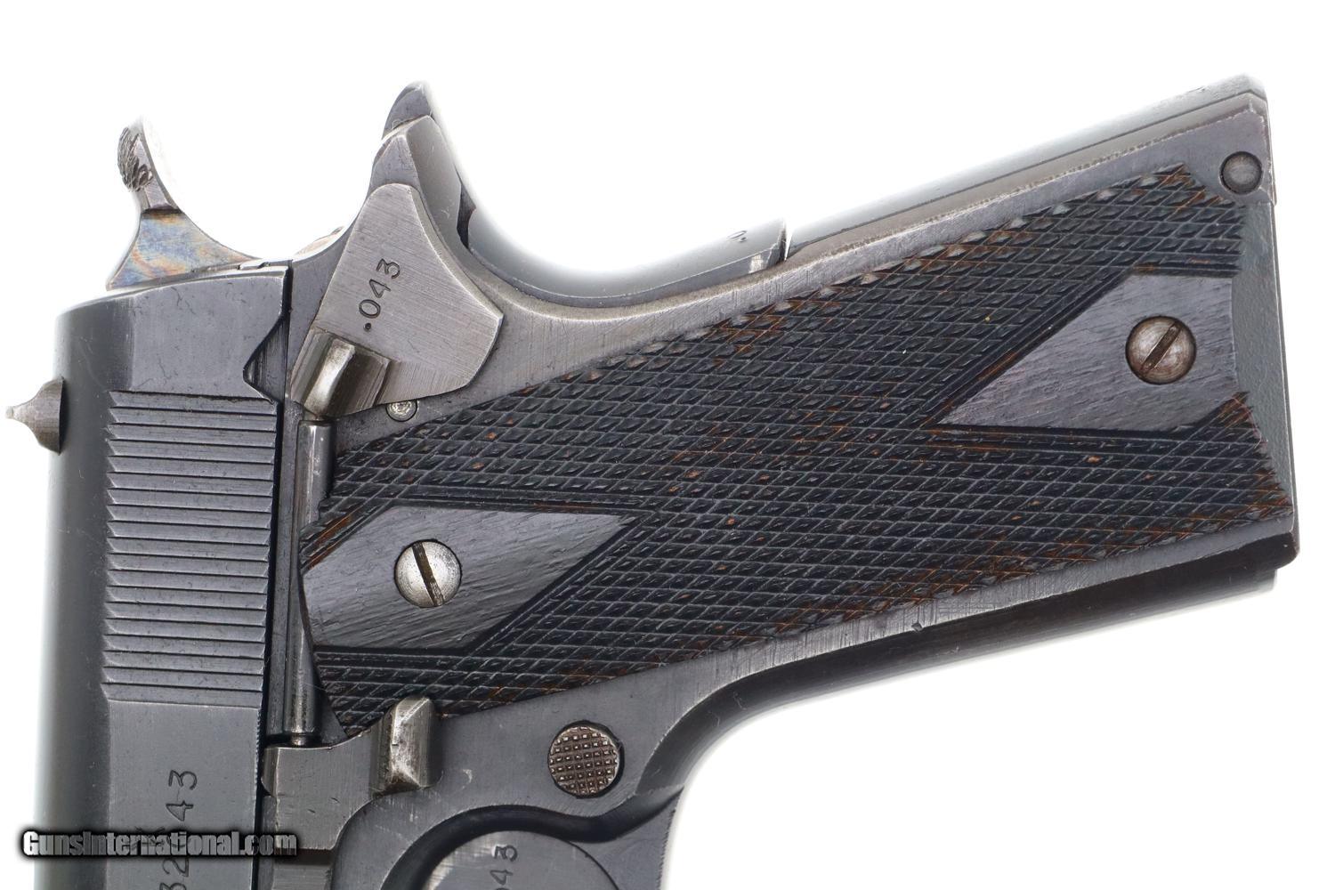 Description: Synopsis: Beautiful, all matching Norwegian 1914, Kongsberg Arsenal, 1945 Date, .45 ACP Description: Very high condition, standard configuration Norwegian model 1914, caliber .45ACP, this example dated 1945, immediately postwar. ALL MATCHING with correct, original grips, and magazine. Left side of slide with usual Norwegian reference with respect to caliber, model, and serial number. The right side of slide is dated 1945. Serial number is repeated on all major components as correct for this late assembly pistol including the frame, slide release, trigger, safety, grip safety, main spring housing and barrel. As true for the late assembly guns, the hammer, firing pin retainer, magazine release, bushing, recoil spring cap and ejector were not numbered. Grips and magazine were never numbered. All parts with original matte finish. Case hardened hammer. Fire blued extractor. Correct magazine with lanyard loop. No import marks. Condition: Near EXC original finish with sharp edge wear and light handling marks as one would expect from a carefully used pistol made right after WWII. Comparable condition grips and magazine. Bright bore with easily discernible rifling. Perfect manual mechanics. A very high condition Norwegian 1914, all matching, made in 1945! ~~Insured shipping fee of $75; most packages shipped using FedEx 2nd Day.~~ SOLD Curio/Relic: Yes Manufacturer: Kongsberg Arsenal Serial Number: 32043 Caliber Info: .45 ACP |