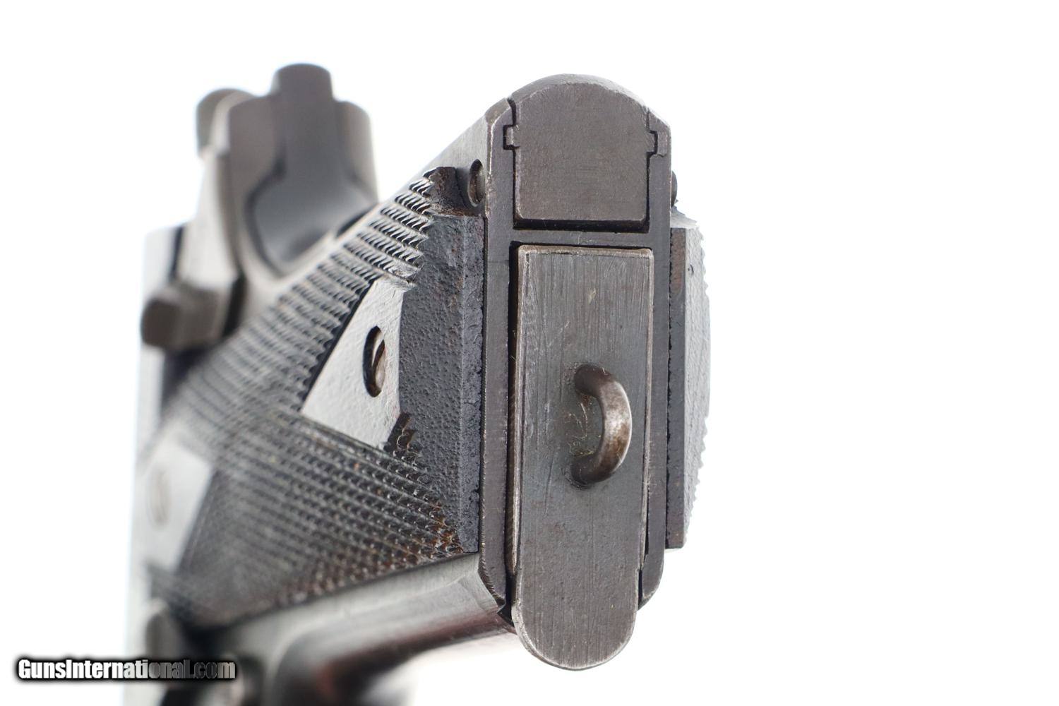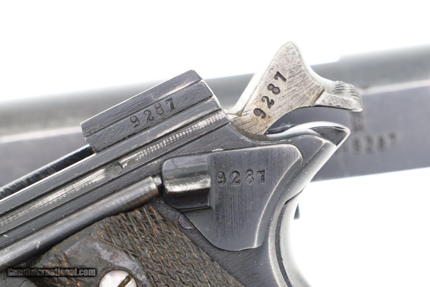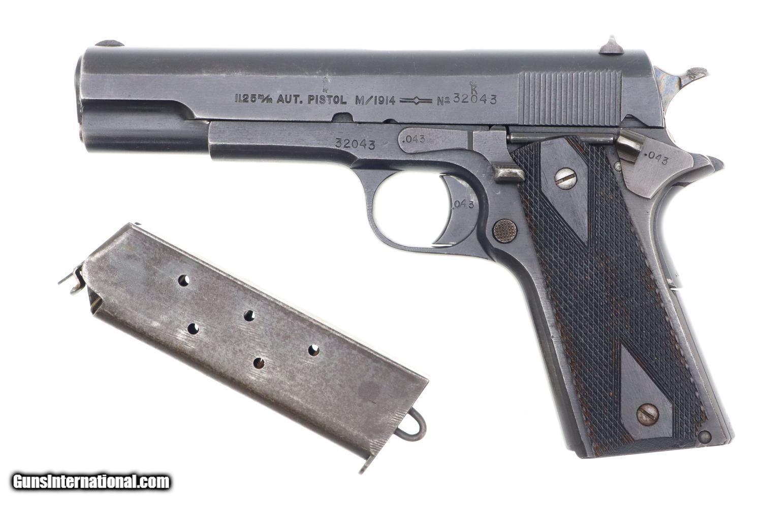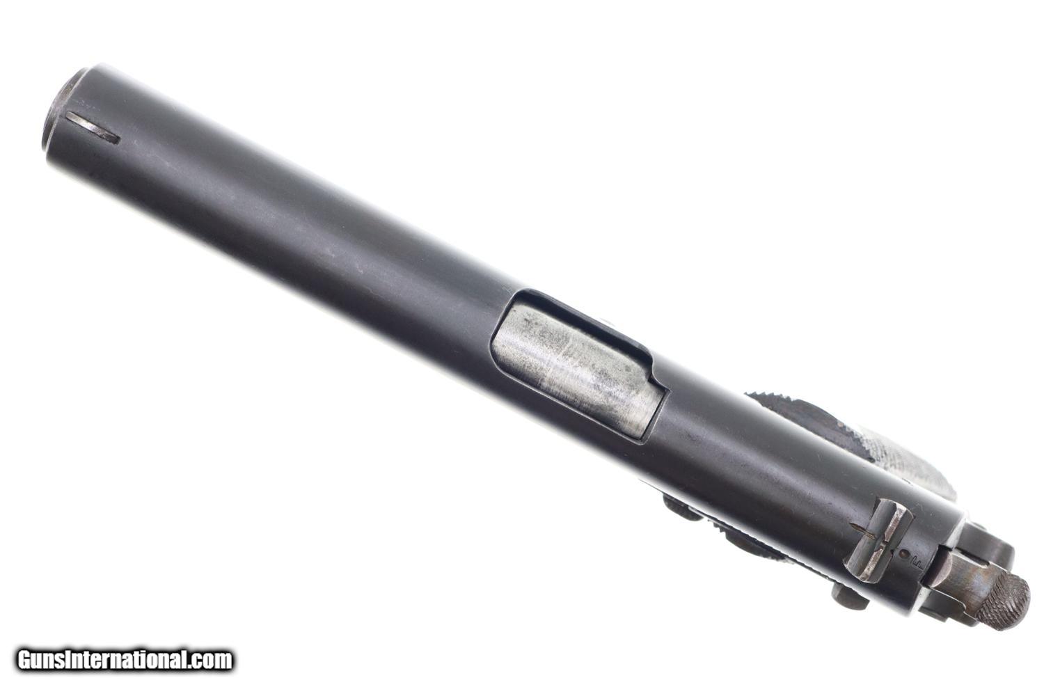 Description: Synopsis: Beautiful, all matching Norwegian 1914, Kongsberg Arsenal, 1945 Date, .45 ACP Description: Very high condition, standard configuration Norwegian model 1914, caliber .45ACP, this example dated 1945, immediately postwar. ALL MATCHING with correct, original grips, and magazine. Left side of slide with usual Norwegian reference with respect to caliber, model, and serial number. The right side of slide is dated 1945. Serial number is repeated on all major components as correct for this late assembly pistol including the frame, slide release, trigger, safety, grip safety, main spring housing and barrel. As true for the late assembly guns, the hammer, firing pin retainer, magazine release, bushing, recoil spring cap and ejector were not numbered. Grips and magazine were never numbered. All parts with original matte finish. Case hardened hammer. Fire blued extractor. Correct magazine with lanyard loop. No import marks. Condition: Near EXC original finish with sharp edge wear and light handling marks as one would expect from a carefully used pistol made right after WWII. Comparable condition grips and magazine. Bright bore with easily discernible rifling. Perfect manual mechanics. A very high condition Norwegian 1914, all matching, made in 1945! ~~Insured shipping fee of $75; most packages shipped using FedEx 2nd Day.~~ SOLD Curio/Relic: Yes Manufacturer: Kongsberg Arsenal Serial Number: 32043 Caliber Info: .45 ACP |