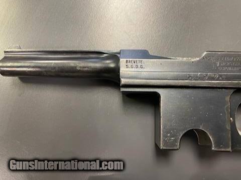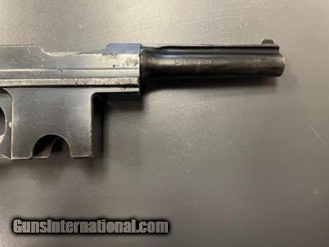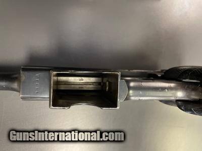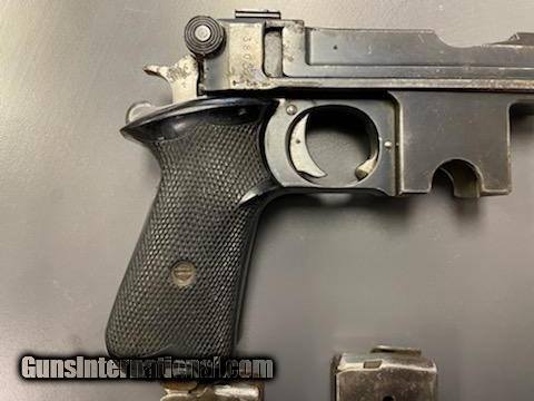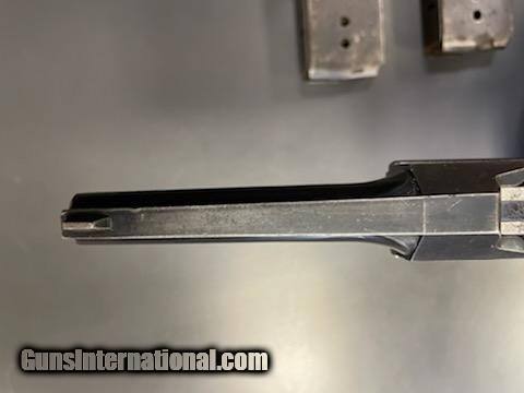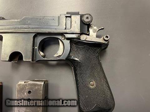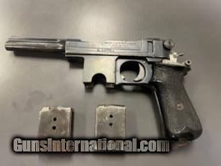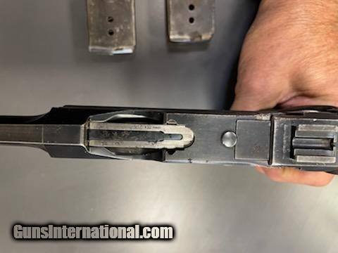 Description: Introduced in 1910 and produced through the end of World War I. Blade front and notch rear sights, with "BREVETE./ S.G.D.G." and "ANCIENS ETABLISSEMENTS PIEPER. / HERSTAL-LIEGE. / BERGMANN'S PATENT." on the left side of the barrel extension and Belgian Liege proofs on the bolt, right side of the barrel and extension. Serrated hammer and safety switch, concentric rings on the bolt, checkered grips with a lanyard staple on the butt. Rating Definition: Very fine, with 65% of the faded original blue finish, showing areas of mixed brown and gray patina with spotting on the grip straps, sides of the frame and along the high edges, scratches on top of the extension and scattered handling marks. The bright components show a mixed gray patina. Grips are good, with scratches and pressure dents. Mechanically excellent. Two mags one matching numbered SOLD Curio/Relic: Yes Handgun Caliber: 9mm Largo (9mm Bergmann-Bayard, 9x23mm Largo) Manufacturer: Bergmann Model: 1910/21 Condition: good Metal Condition: good |
