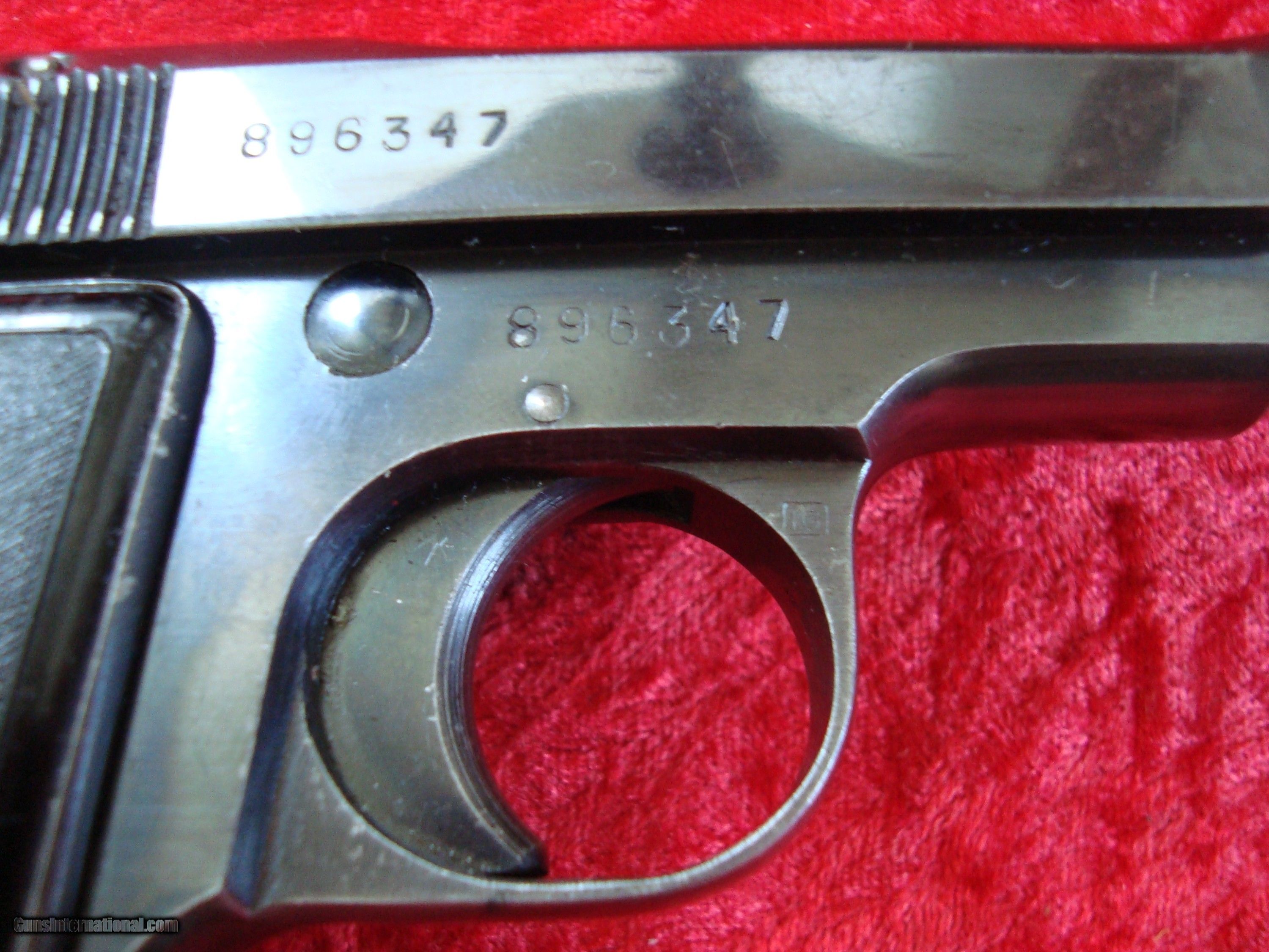 Description: WW 2 Army issued Beretta Model 1934 in cal 9mm Corto (380), with the originial holster and extra magazine, MFG. in 1941, nice high polish finish. Thank you for looking at my other listings. SOLD Curio/Relic: Yes Handgun Caliber: .380 ACP (9x17mm Browning Short) Manufacturer: Beretta Model: 1934 Serial Number: 896347 Barrel Length: 3.5 Bore: Excellent Condition: Excellent Metal Condition: 95+% Action: semi-auto |