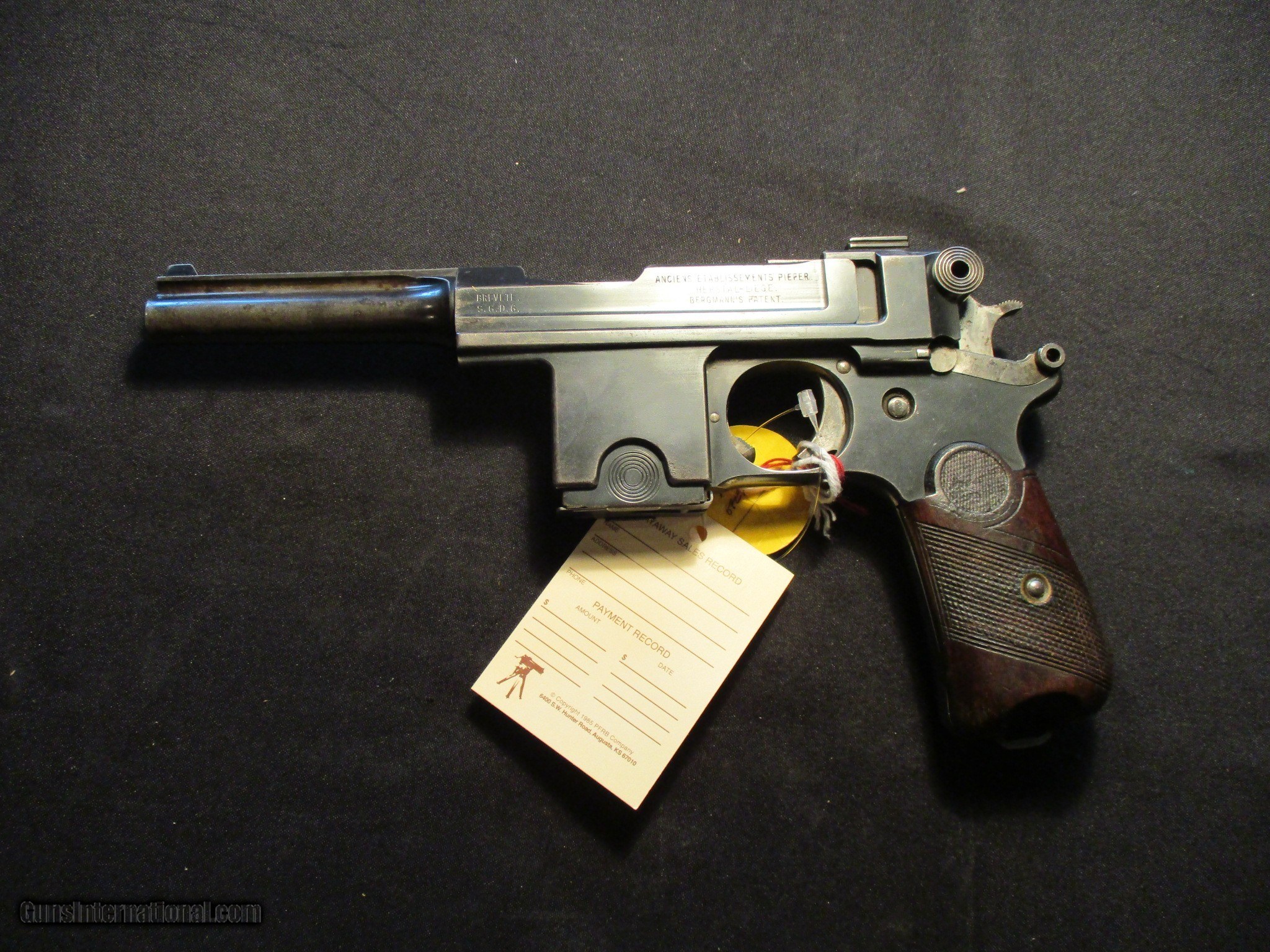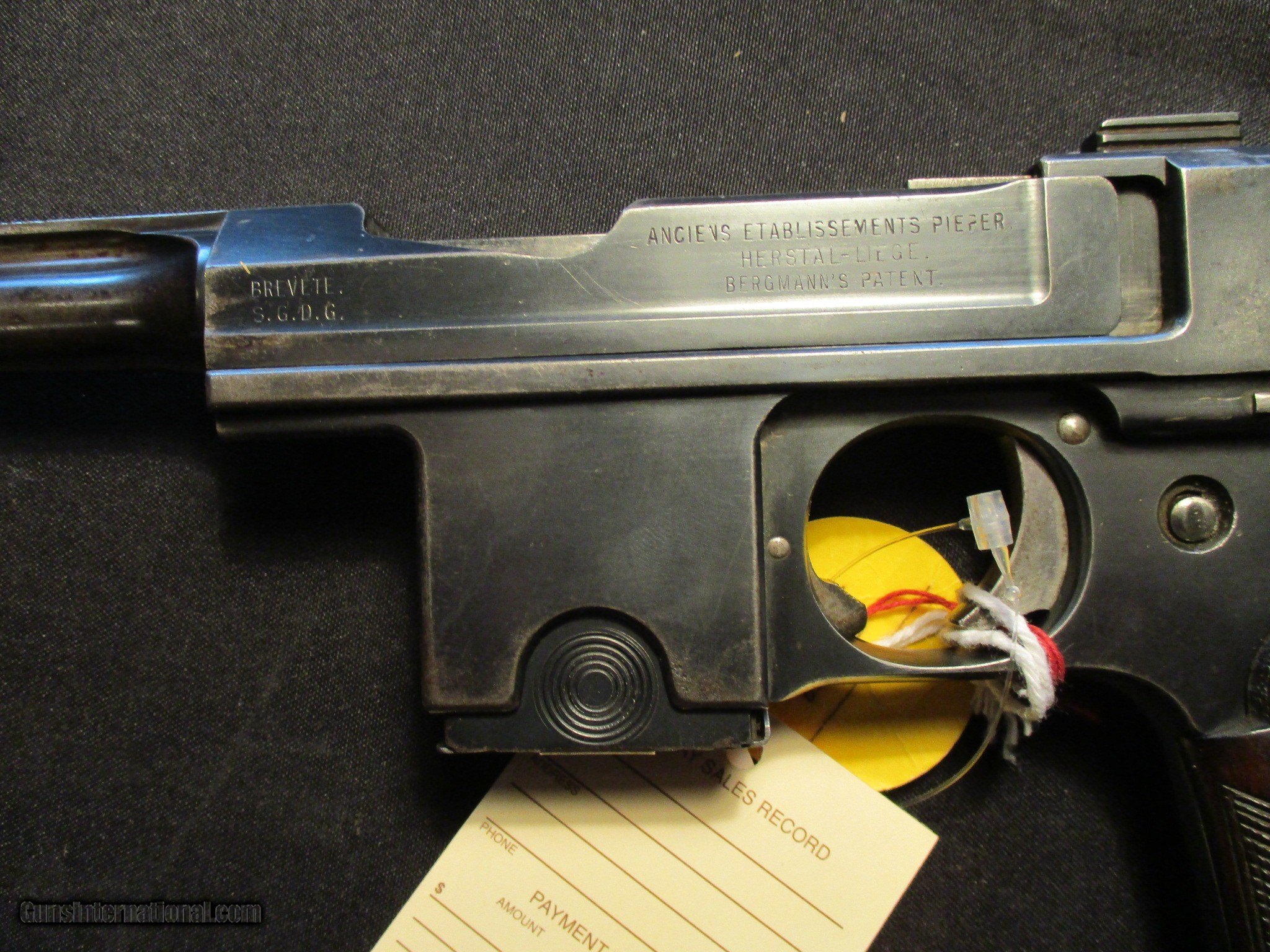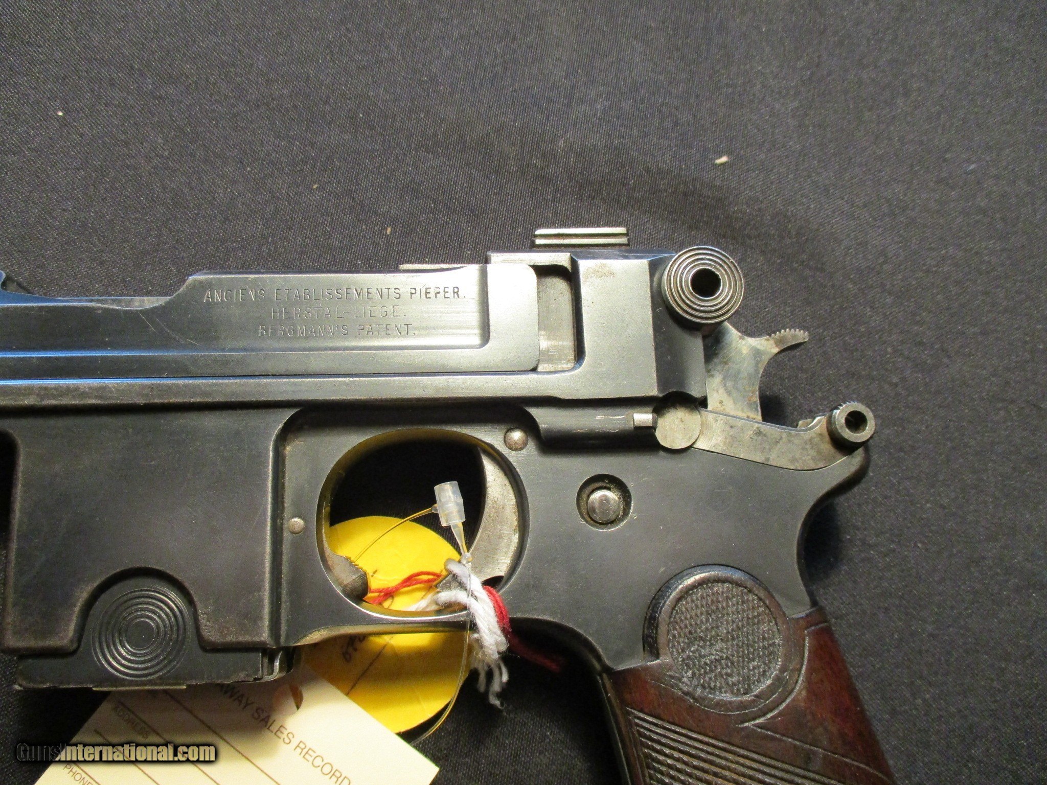 Description: Bergmann Bayard Model 1908, 9mm with a 4" barrel. Factory finish on both grips and metal, Nice clean hard to find gun! Sn is 160xx. Receiver is marked Brevette S.G.D.G. also stamped Anciens Etablissements Pieper Herstal-Liege Bergmanns Patent. Email me if you would like these pics sent to you, they will come through bigger and better than on the listing page here. Email me with any questions. I am a store front dealer, and I will close s if the gun sells locally. Once it has aI will pull it from my shelves. Please check your local laws to confirm it is legal to own in your state! Buyer pays $25 shipping and insurance to your FFL in the lower 48. AK, HI or PR is extra. I will ship to California, NO PROBLEM! All my guns come with a non firing, 3 day unconditional return privilege, from the day UPS delivers to your dealer. Buyer pays shipping both ways if the gun comes back. I can add a new hard case by PLANO for secure shipping for $25 if the buyer wishes (highly recommended, cheap insurance, really helps keep the UPS monster from eating my guns!). No sales tax on guns ship out of Kansas, guns sold in Kansas are subject to Kansas sales tax. I am a licensed FFL, and will include a copy of my FFL with the gun for your dealers records. I will ship to a C&R if the gun is eligible. I will ship to California, but you need to confirm the gun is legal where you are, California or other. I am always looking for good clean, old original Winchesters to buy, consign, or trade, especially pre '64's model 70's and model 54's. WE ALSO TRADE FOR CLASSIC CARS AND TRUCKS! Email me with any questions, and good luck! SOLD |