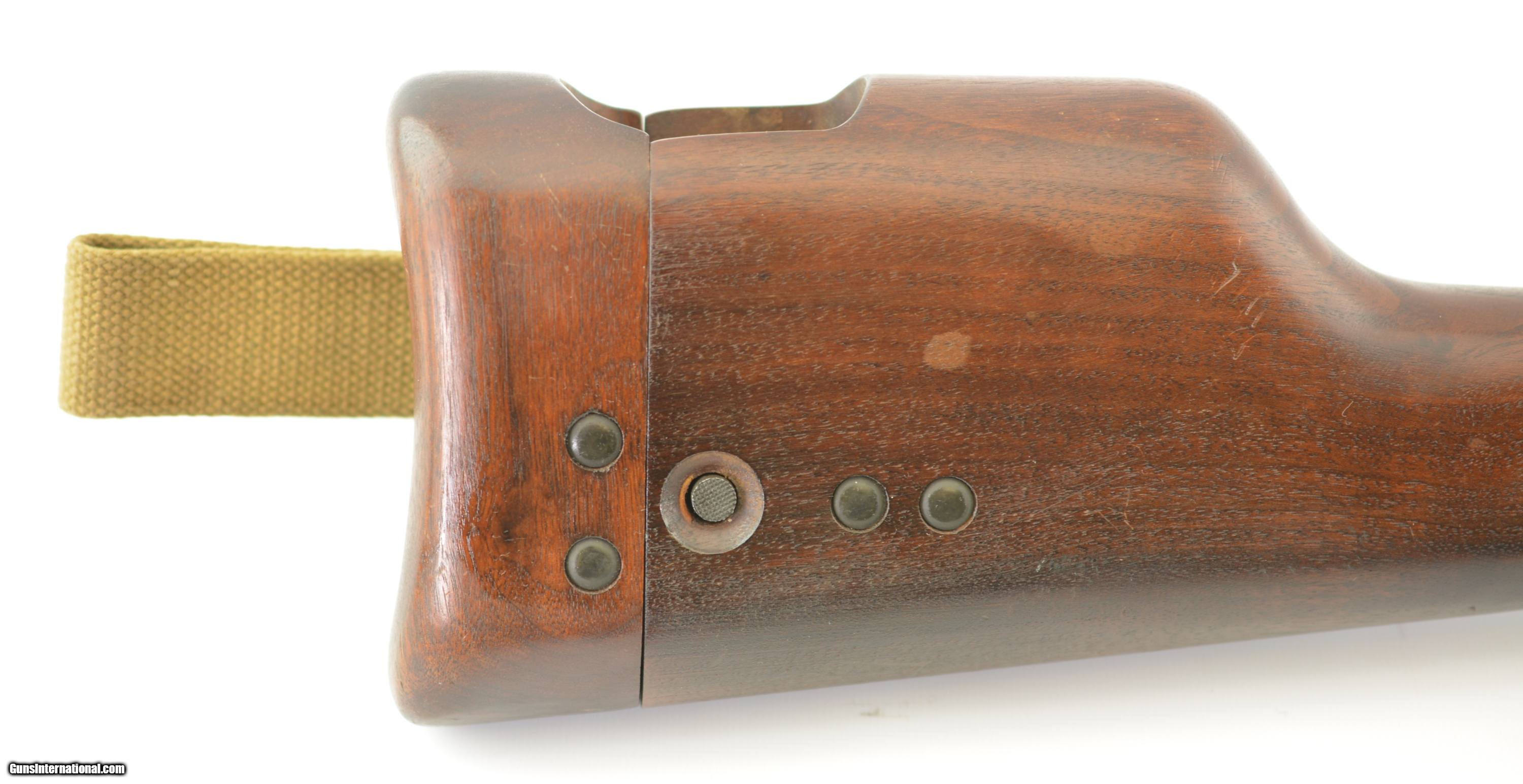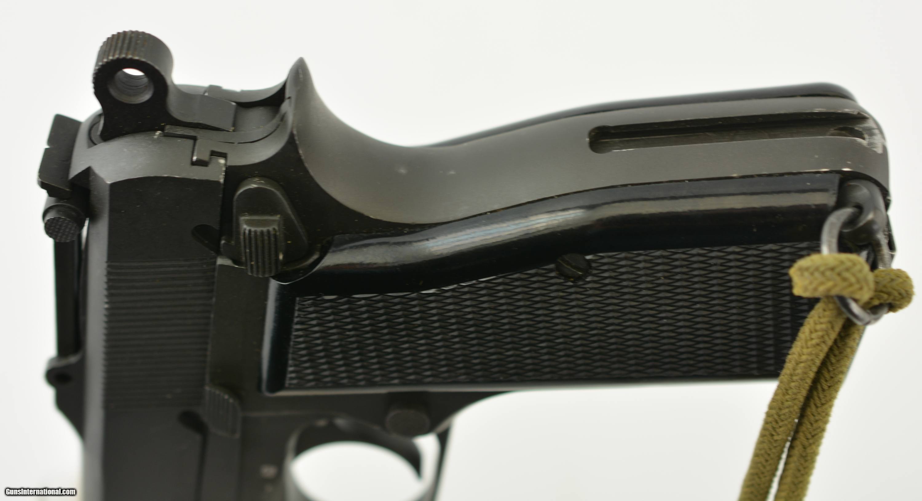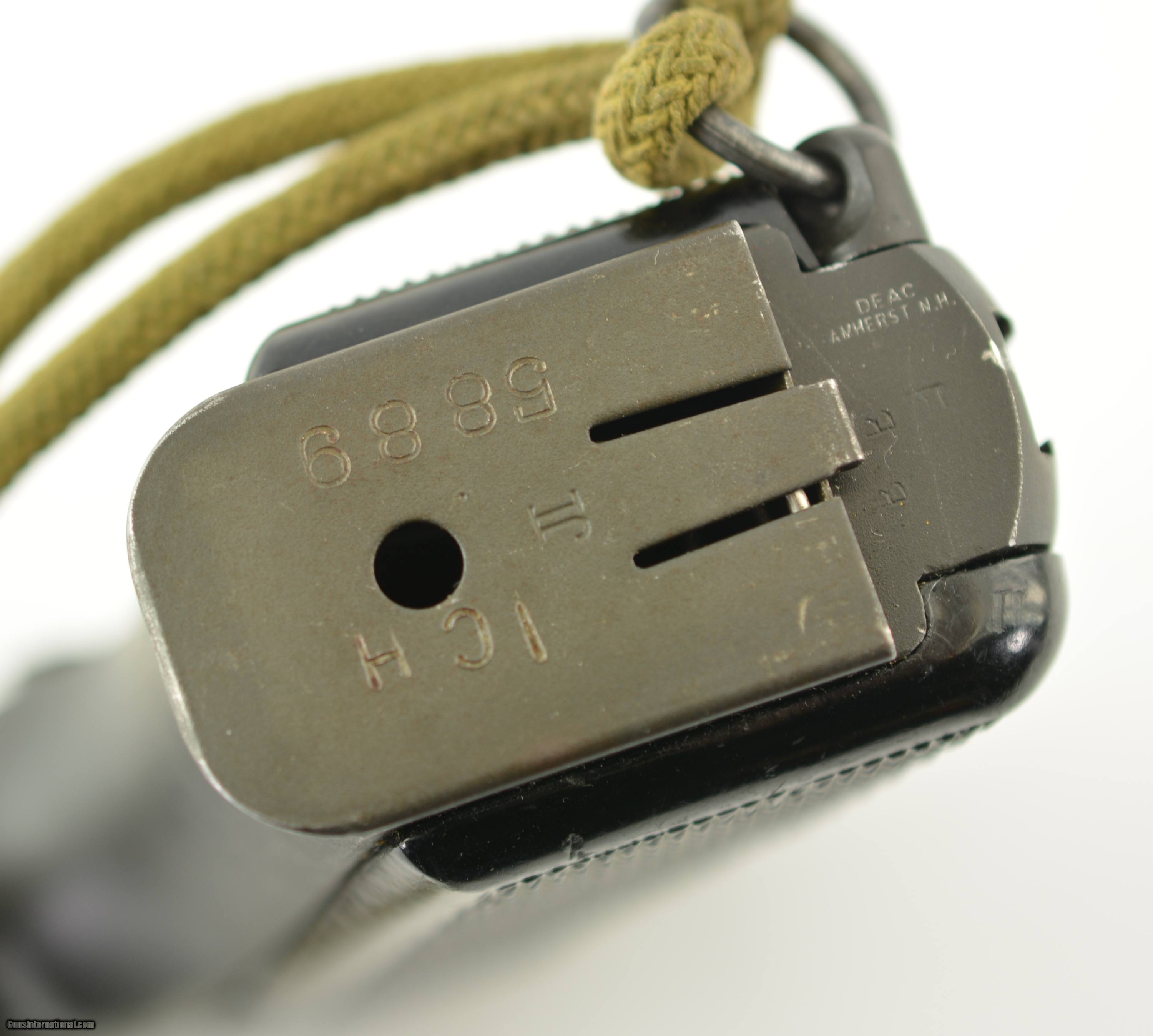Description: Serial #1CH5889, 9mm Para., 4 11/16 inch barrel with an excellent, bright bore. This is a handsome, “C (Broad Arrow)" marked pistol that has matching numbers on the frame, slide, and barrel. The metal retains 95-97% of the original dark gray phosphate finish that has silvered lightly at the muzzle as well as along some of the raised edges and projections. There is some further mild fading along the gripstraps and an unobtrusive import stamp on the butt at the edge of the magazine well. The checkered black resin grips are in fine shape having only minor flattening of the points and just a few very small handling marks and blemishes along the edges of both panels. The pistol comes with a numbered original “JI" marked Inglis magazine, original lanyard cord, and is housed in an original walnut combination holster/stock. The stock is crisply stamped on the wrist: “S.A.LTD. / 1945" (Small Arms Ltd). The wood is in excellent condition and has just a few very minor handling marks and small blemishes scattered about the original military oil finish while the metal retains nearly all of the original matte finish with some silvering and wear visible on the attachment iron. The lid shuts smartly and latches firmly and an original “C (Broad Arrow)" marked canvas hanger with “ZL&T Ltd" maker's mark (Zephyr Loom & Textile Ltd of Toronto) is attached. Also included is an original canvas “C (Broad Arrow)" Canadian holster, also by Zephyr, that has dark green verdigris on the closure grommet, but is otherwise in almost unissued condition. This is an excellent example of a World War II Inglis pistol, with an original holster and stock rig, and would make a splendid addition to any collection. FFL or C&R SOLD Curio/Relic: Yes Manufacturer: Inglis Model: High Power Serial Number: 1CH5889 Caliber Info: 9mm Gauge Info: 9mm |