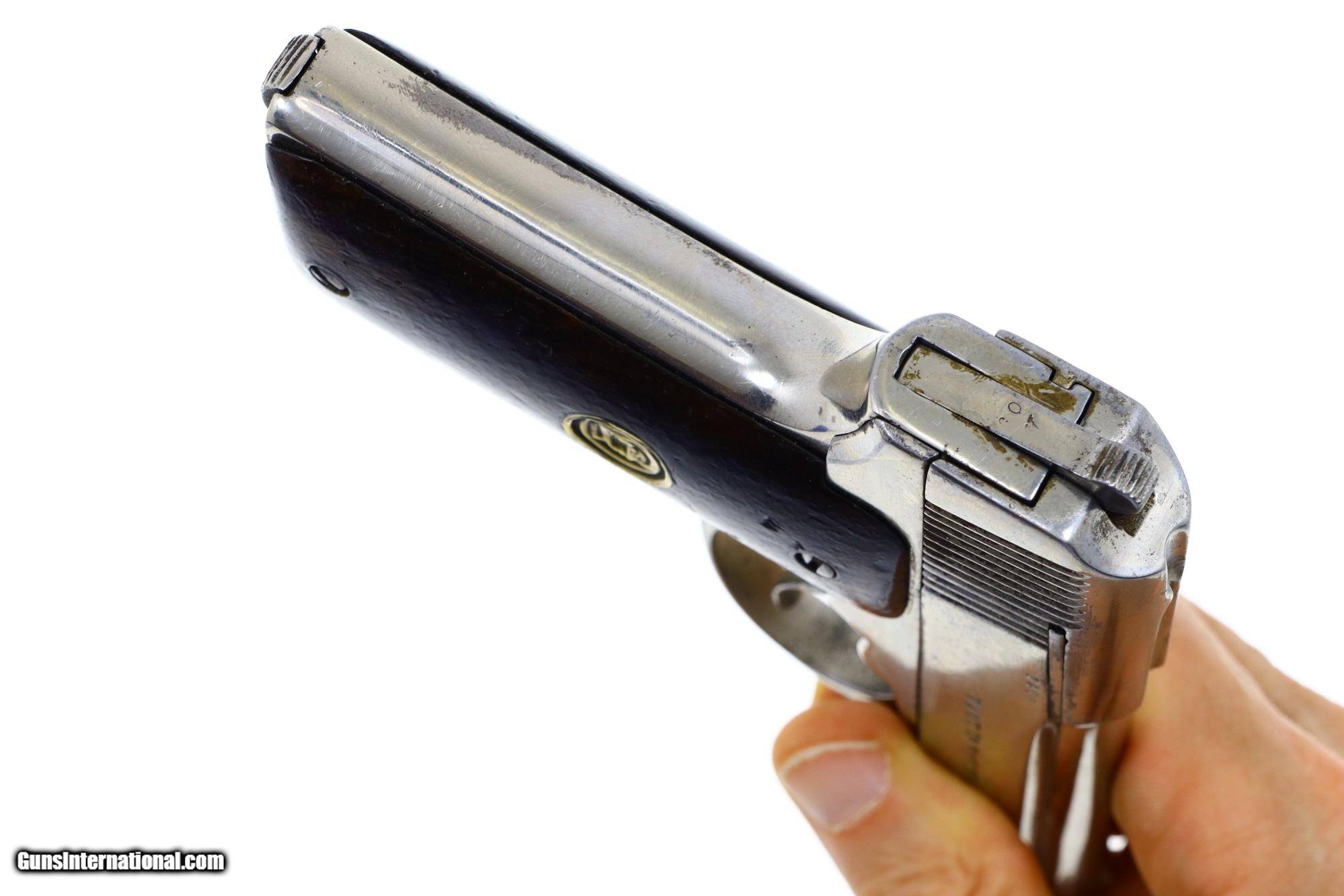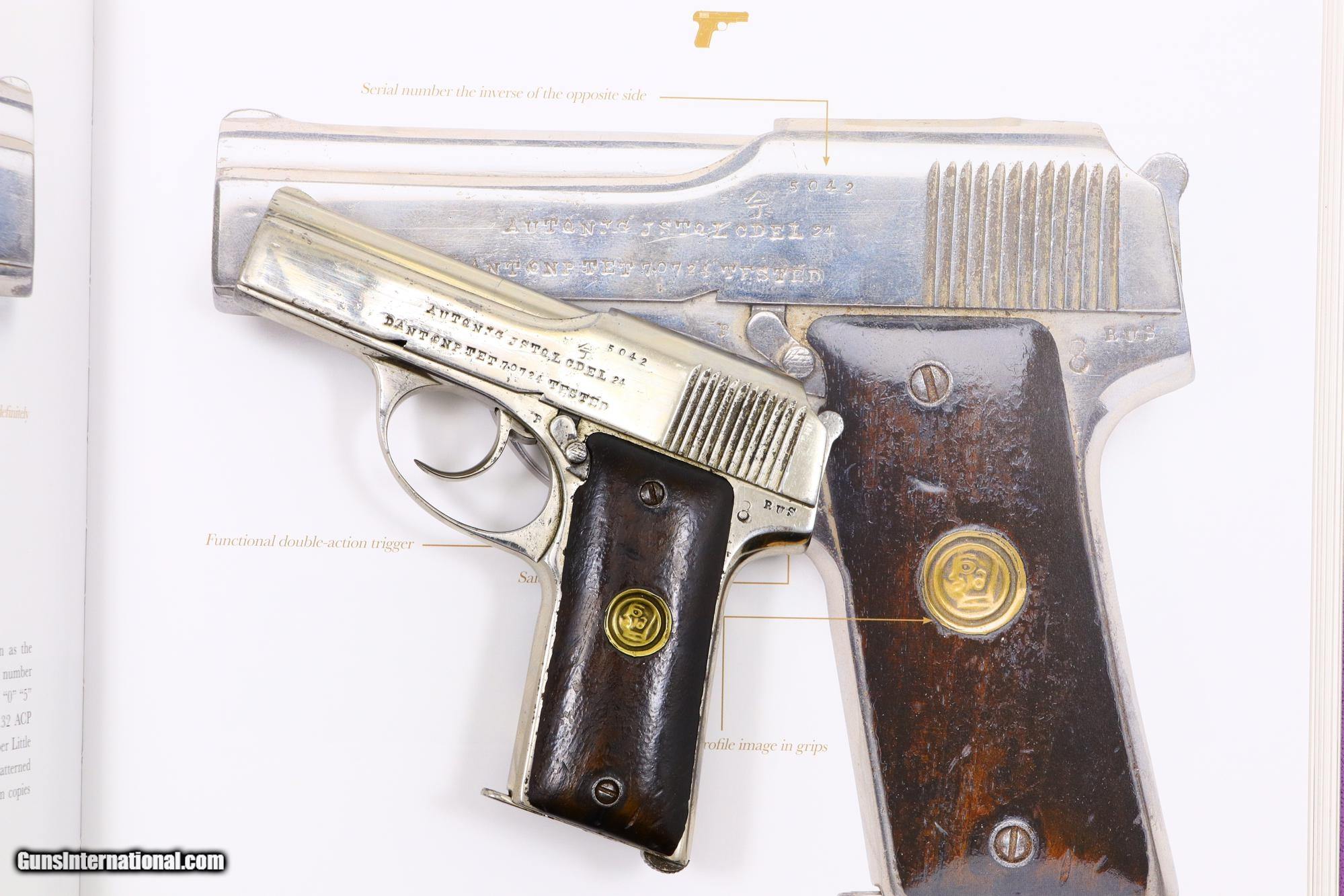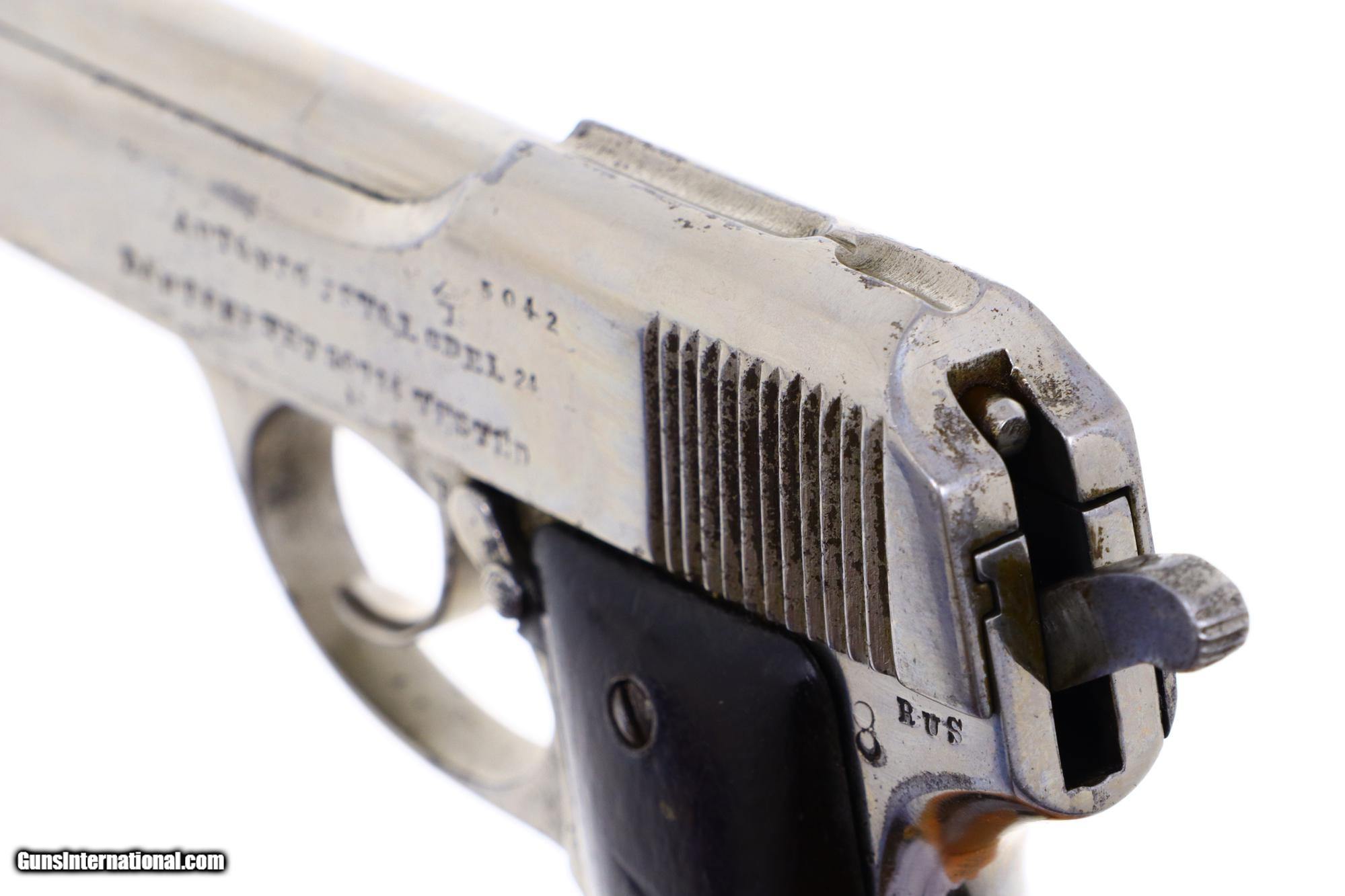 Description: Some of the pistols that the Chinese copied during the Warlord Era were extraordinary, both as mechanical hybrids and in terms of their markings. This pistol is a fairly close copy of the Austrian Tom, this one a SA/DA blowback in 7.65mm (.32 ACP) but with crazy references to many countries that armed the Chinese during their conflict. Of course, most references are misspelled. There is “Danton” (reference to Spanish Gabilondo trademark on the left side of slide) and several references to Russia (left tang and right side of the slide) though of course the references are misspelled with English rather then Cyrillic lettering. You have to love the “WADE IM RUSSIA” marking. Wood panels with large brass escutcheons. Bottom magazine release, the unmarked magazine having 8 transverse indicator holes and an enclosed floorplate. This EXACT pistol pictured in “Pistols of the Warlords” text by Ian McCollum on pages 470-471. Synopsis: Incredible Chinese Arsenal, Austrian Tom, Spanish Danton, Russian, Documented, .32ACP, RUS, PCA-165 Condition: Retains most of it’s later nickled finish with dried grease in many of the protected areas. Dull bore with easily discernible rifling. Perfect manual mechanics. An extremely unusual copy with hilarious but era-understandable markings, pictured in a widely distributed book. NOT TO BE FIRED!! NOT TO BE FIRED!! NOT TO BE FIRED!! ~~Insured shipping fee of $65; most packages shipped using FedEx 2nd Day.~~ SOLD Manufacturer: Chinese Arsenal Serial Number: RUS Caliber Info: 0.32 |