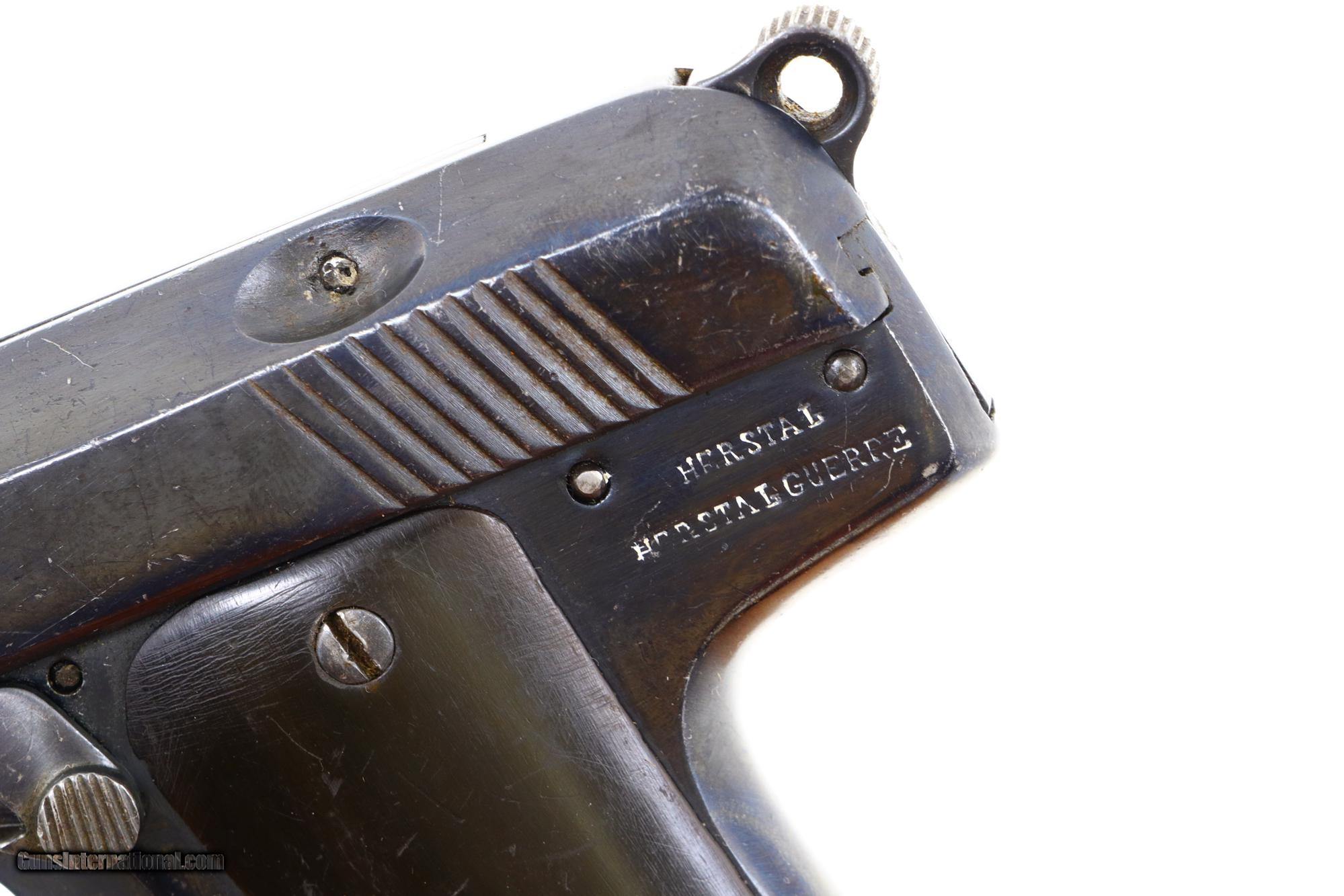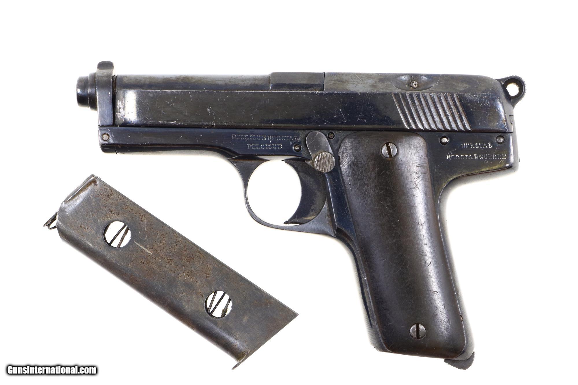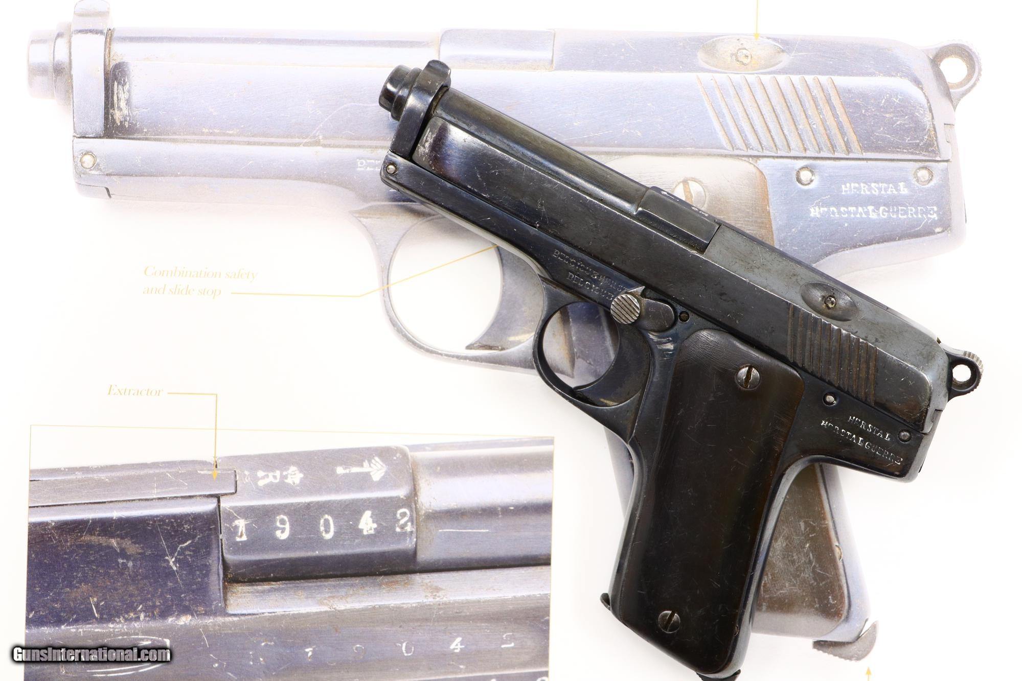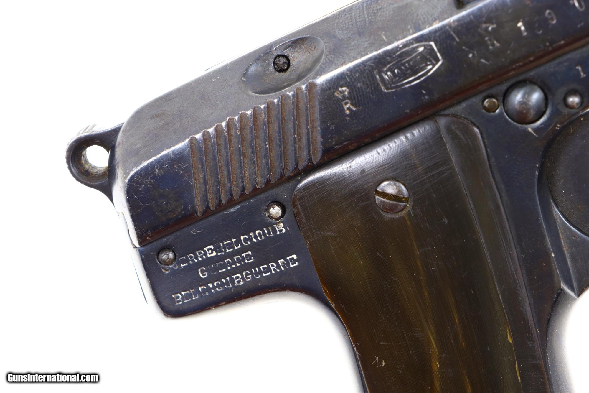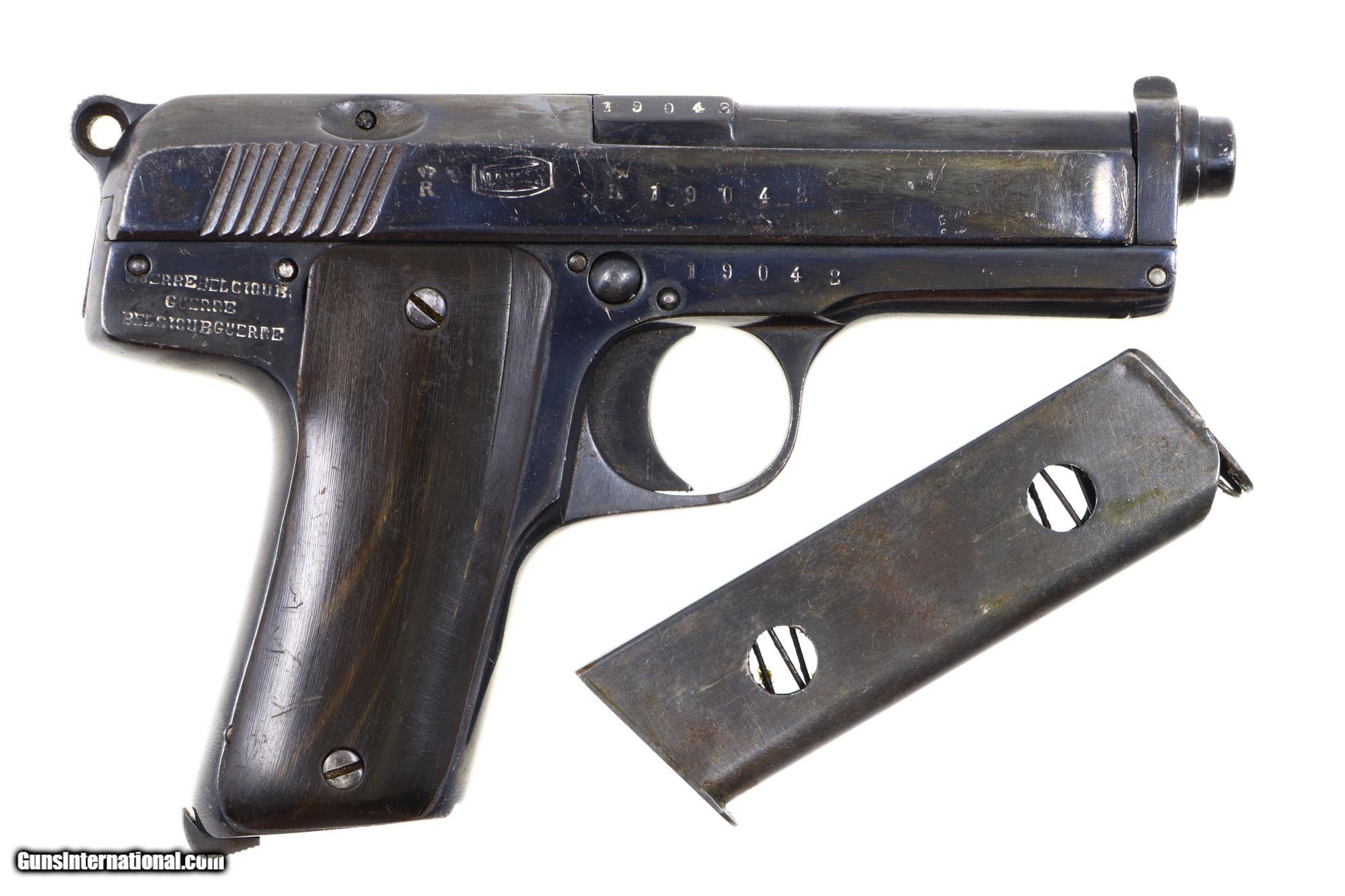 Single action blowback pistol with external hammer having fixed front sight, loaded indicator, and no rear sight. The right side of the slide and both sides of the frame have a scattering of falsified FN and Mauser markings along with "Crown/R" proofs. Full serial number is on the right side of the chamber flat, right side of the slide, and frame. The left side of the frame that has been fitted with a mid-frame Eibar-type safety. Period replacement horn grips. Unmarked magazine with two large transverse indicator holes and a fixed floorplate. As per the examples pictured in the "Pistols of the Warlords 1911-1949" by Ian McCollum pages 160, and 164-165.