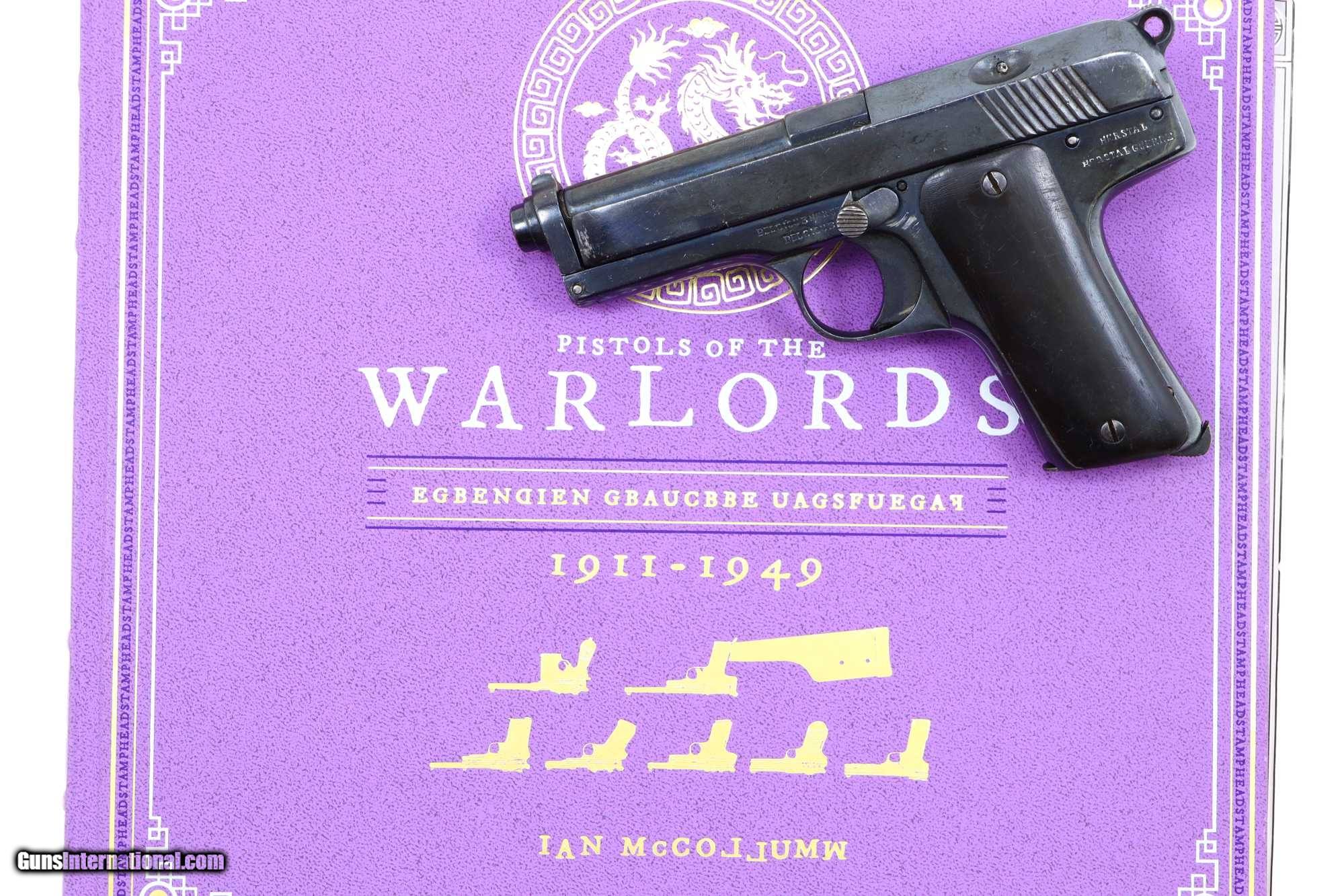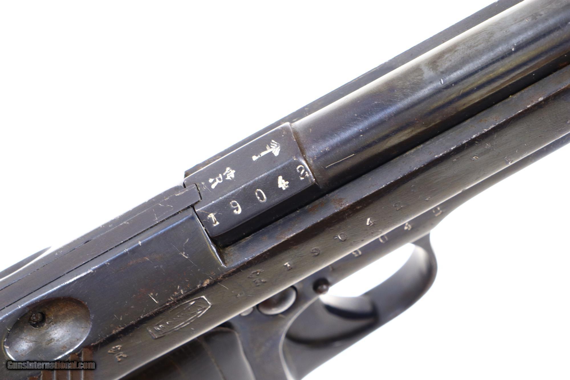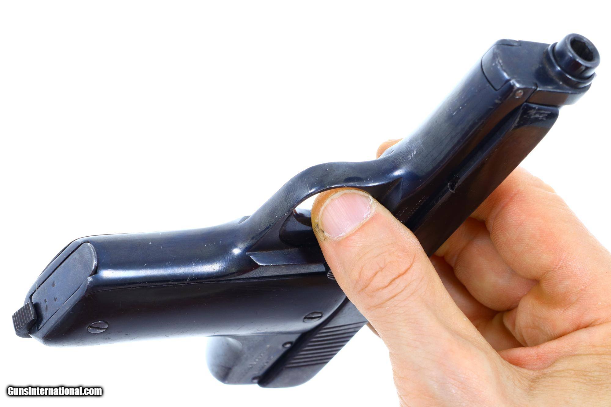 Description: Description: Single action blowback pistol with external hammer having fixed front sight, loaded indicator, and no rear sight. The right side of the slide and both sides of the frame have a scattering of falsified FN and Mauser markings along with "Crown/R" proofs. Full serial number is on the right side of the chamber flat, right side of the slide, and frame. The left side of the frame that has been fitted with a mid-frame Eibar-type safety. Period replacement horn grips. Unmarked magazine with two large transverse indicator holes and a fixed floorplate. As per the examples pictured in the "Pistols of the Warlords 1911-1949" by Ian McCollum pages 160, and 164-165. Synopsis: Unusual Chinese Warlord era pistol with dimpled, open-top slide, having a scattering of falsified FN and Mauser markings. Condition: High polish salt blued rework. Safety rotates properly but does not prevent hammer fall when the slide is in battery. Correctly engages hold open notch on full retraction. Dull bore with sharp rifling. NOT TO BE FIRED! NOT TO BE FIRED! NOT TO BE FIRED! SOLD Manufacturer: Chinese Arsenal Serial Number: 19042 Caliber Info: 7.65mm |