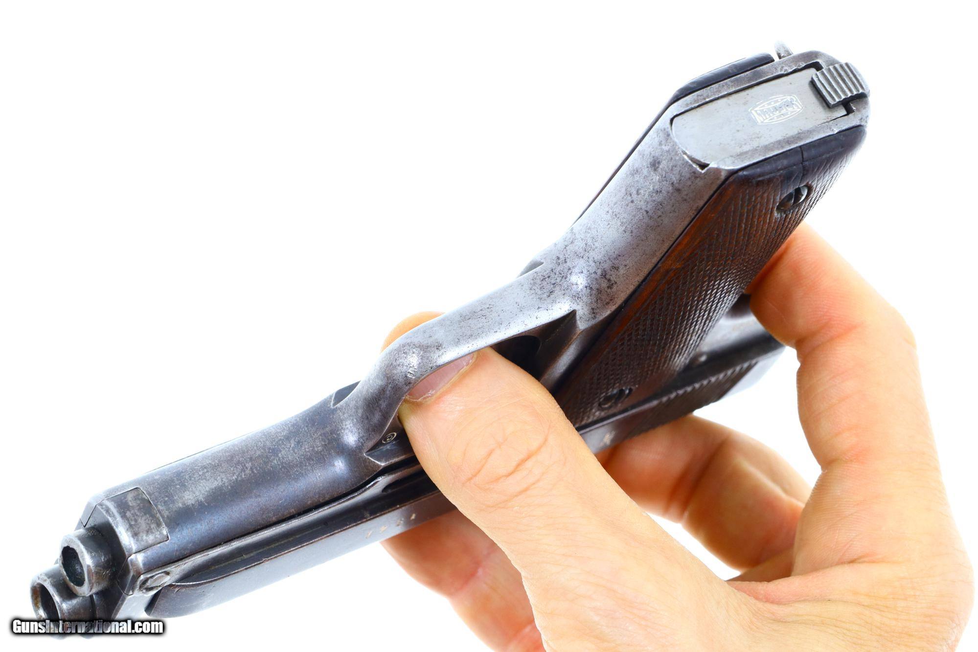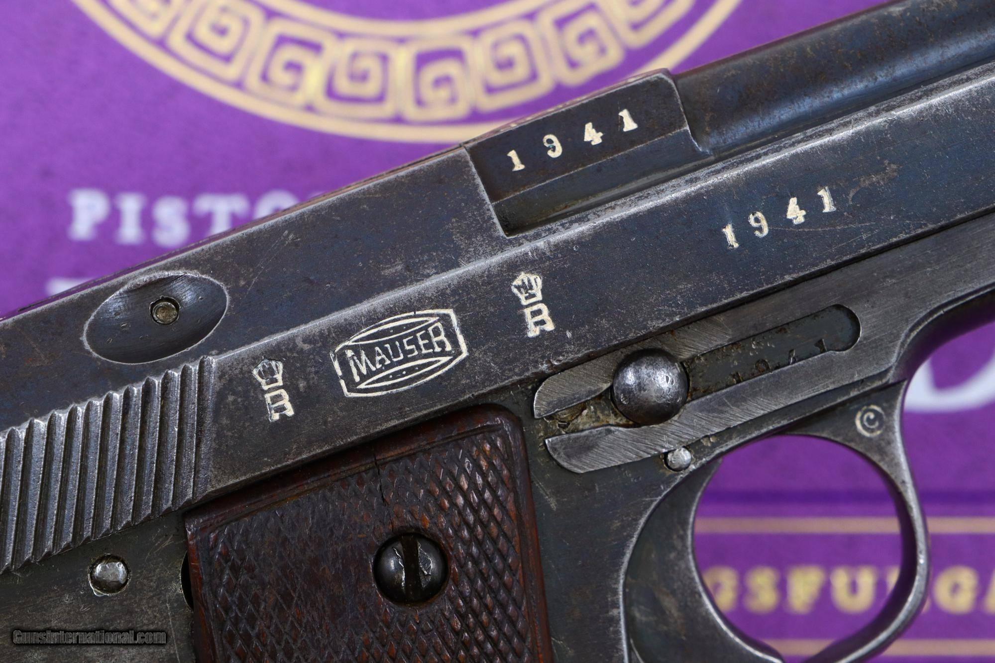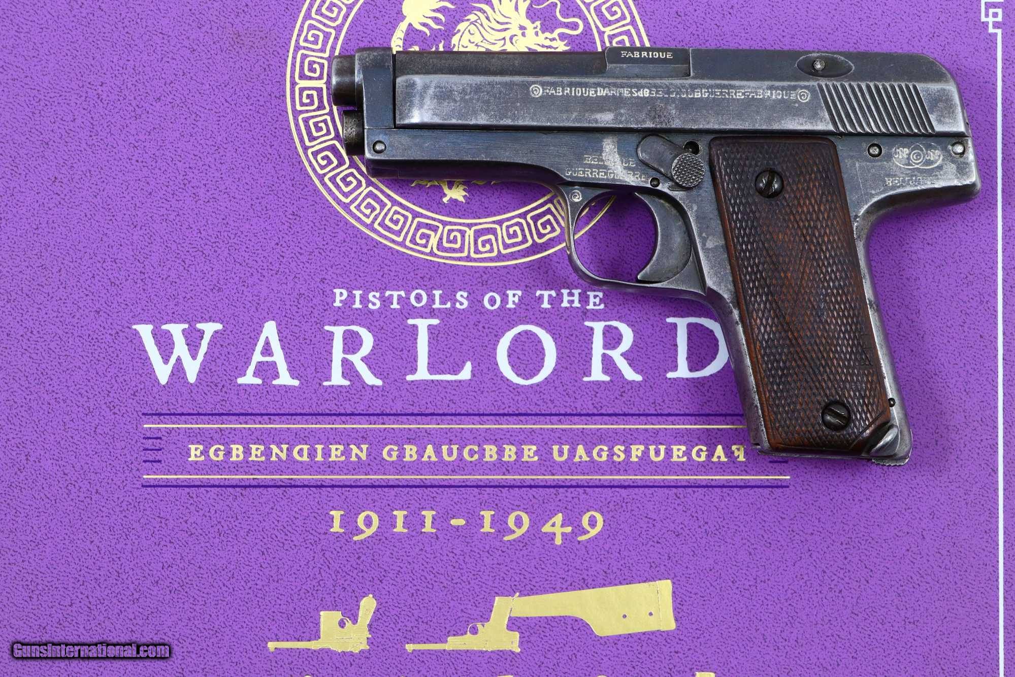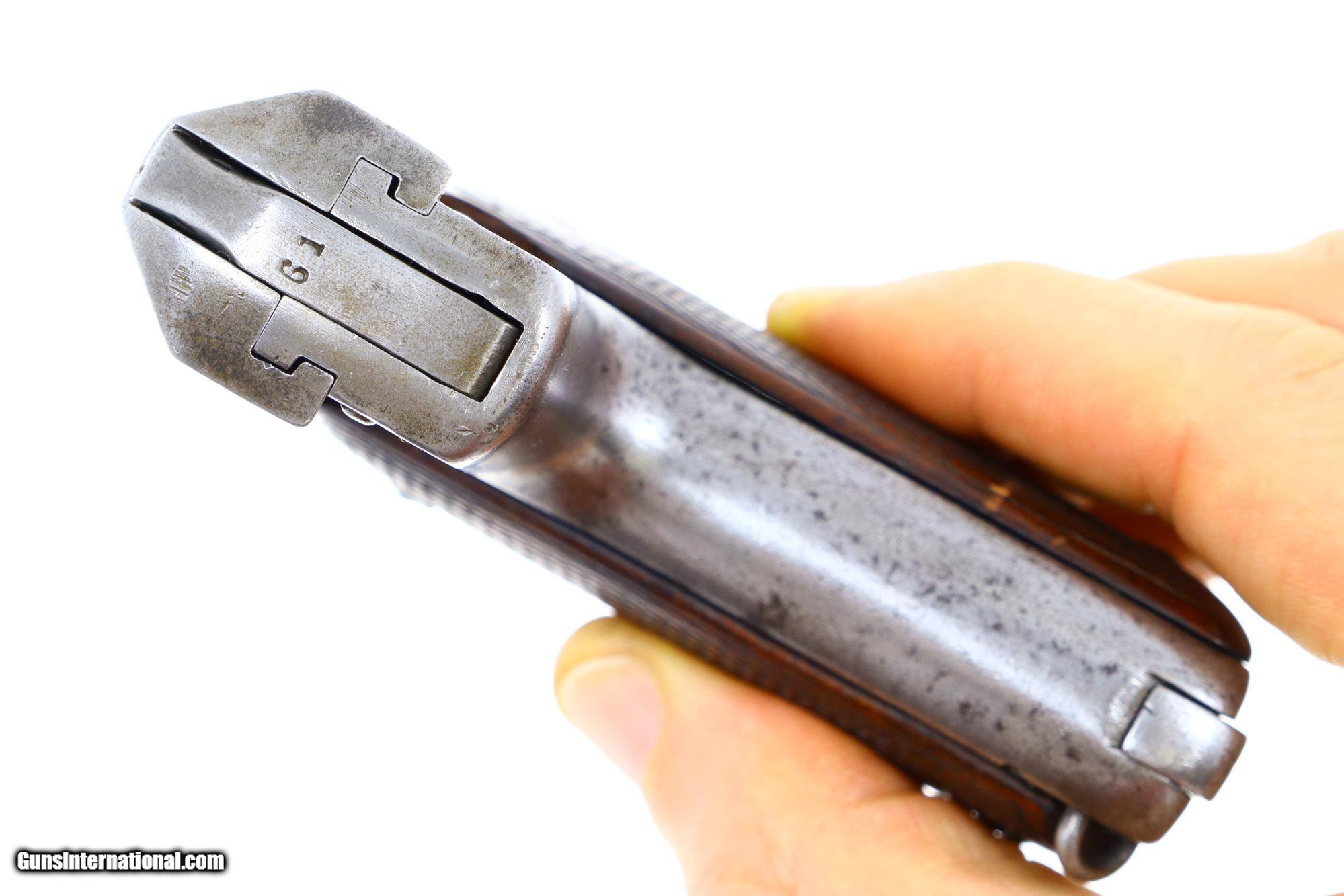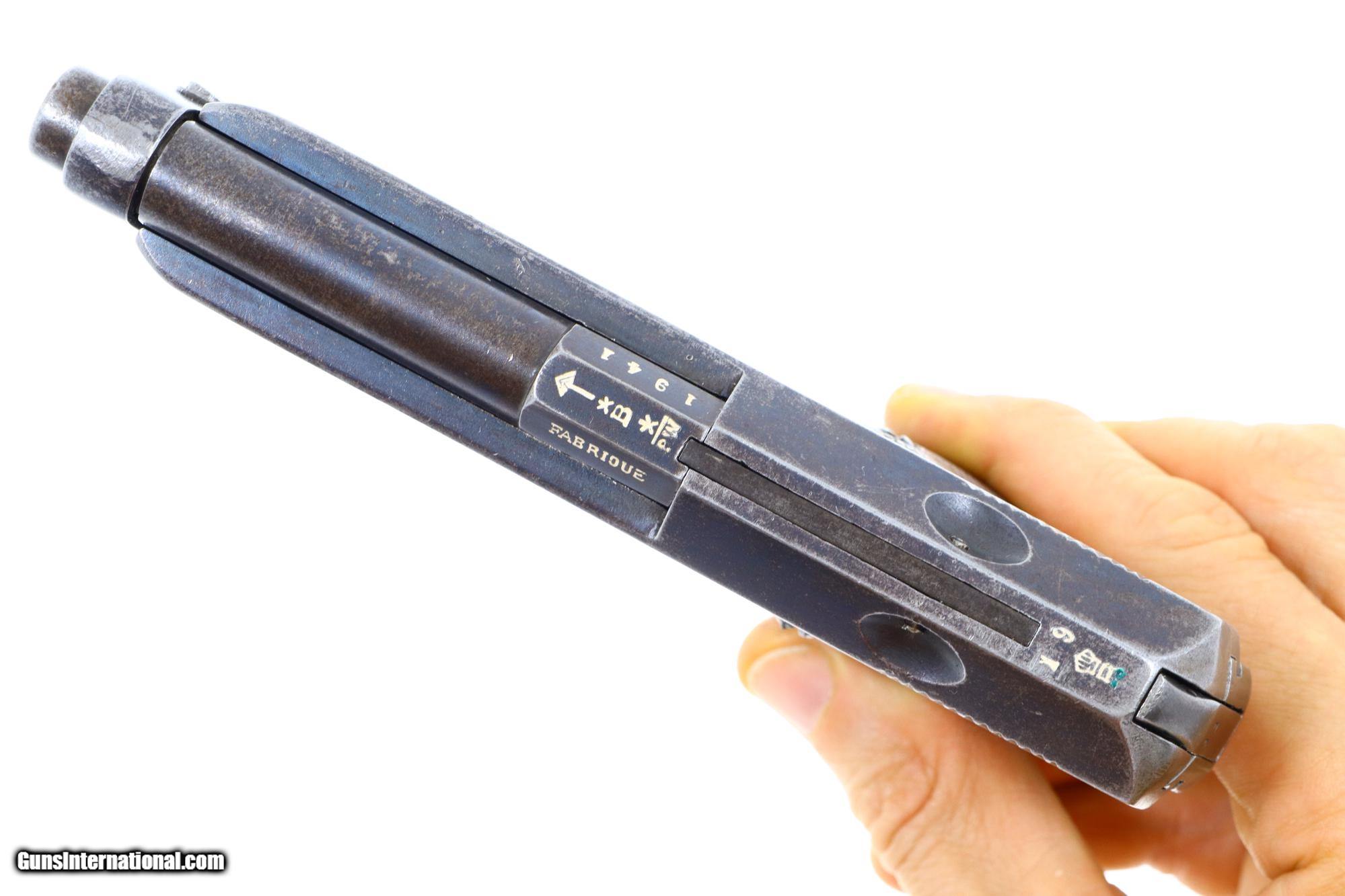 Description: Single action blowback pistol with external hammer, now bobbed, having fixed front sight, loaded indicator, and no rear sight. The right side of the slide and both sides of the frame have a scattering falsified FN and Mauser markings along with "Crown/R" proofs. Full serial number is on the right side of the chamber flat, slide and frame. The left side of the frame has been fitted with a mid-frame Eibar-type safety, retained with a separate screwed-in forked spring. Original wood checkered grips. Magazine with 5 indicator holes on left side, 3 indicator holes on the right side and a falsified "Mauser Banner" floorplate. This exact pistol is pictured in the "Pistols of the Warlords 1911-1949" by Ian McCollum pages 170-171. Synopsis: Unusual Chinese Warlord era pistol with dimpled, open-top slide, having a scattering of falsified FN and Mauser markings. Condition: Original rust blue with wear as one might expect from moderately heavy use. Safety functions properly but does not always release the hammer when rotated to the fire position. Dull bore with sharp rifling. Very unusual Chinese Warlord pistol, well marked, and especially nice it was pictured in the Chinese Warlord pistol book. NOT TO BE FIRED! NOT TO BE FIRED! NOT TO BE FIRED! ~~Insured shipping fee of $65; most packages shipped using FedEx 2nd Day.~~ SOLD Manufacturer: Chinese Arsenal Serial Number: 1941 Caliber Info: 7.65mm |