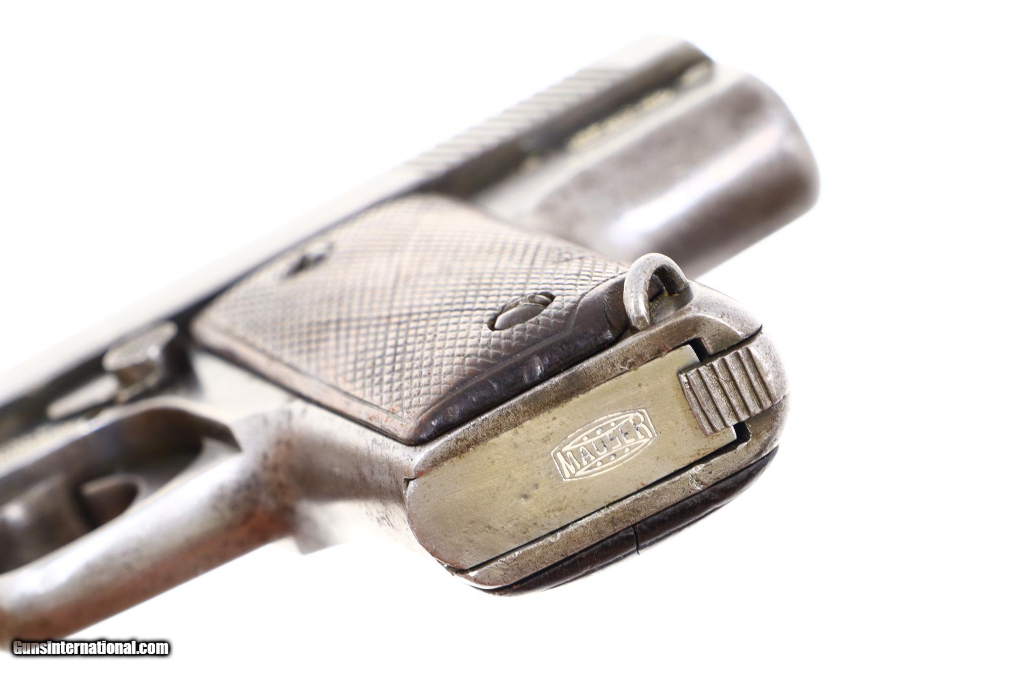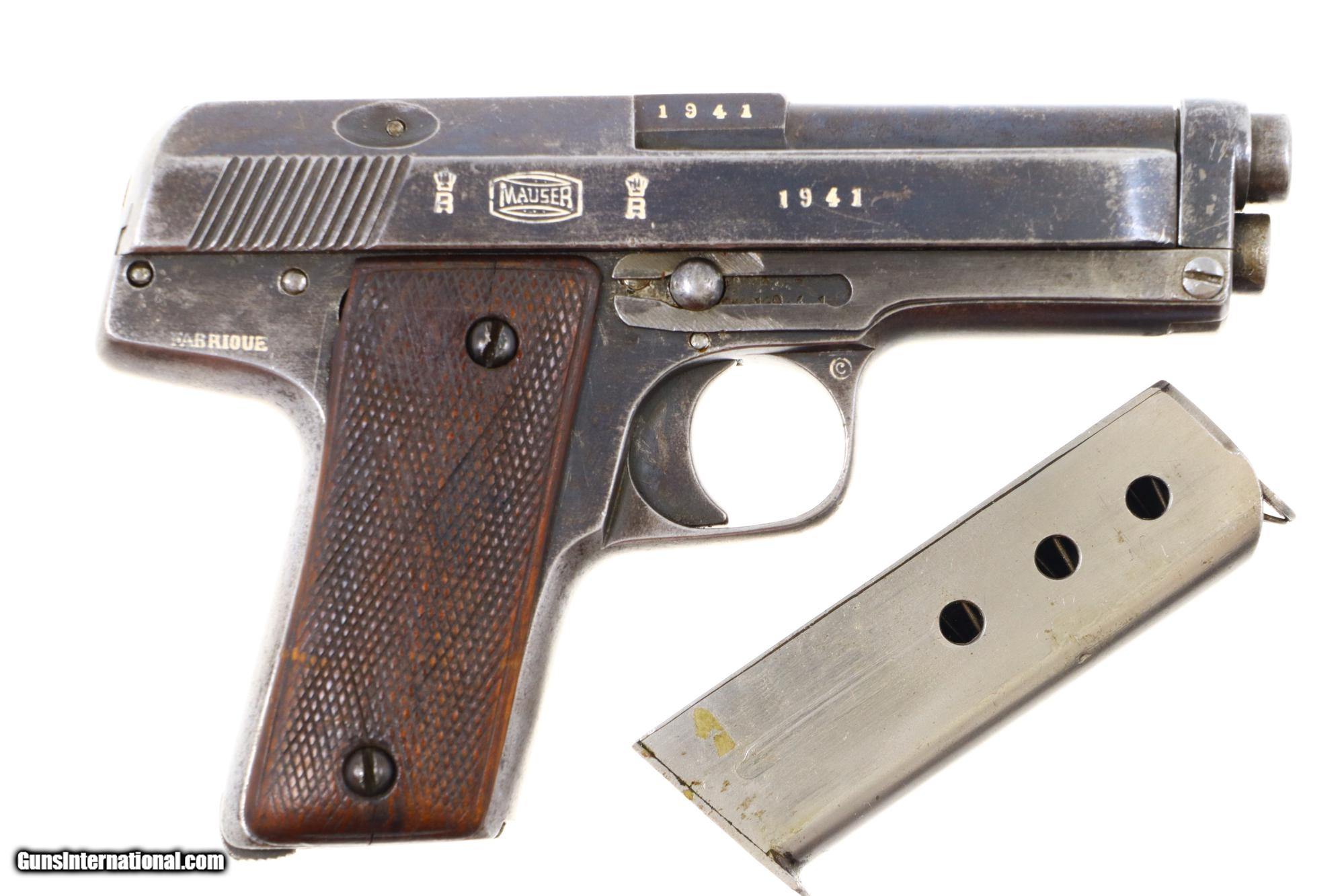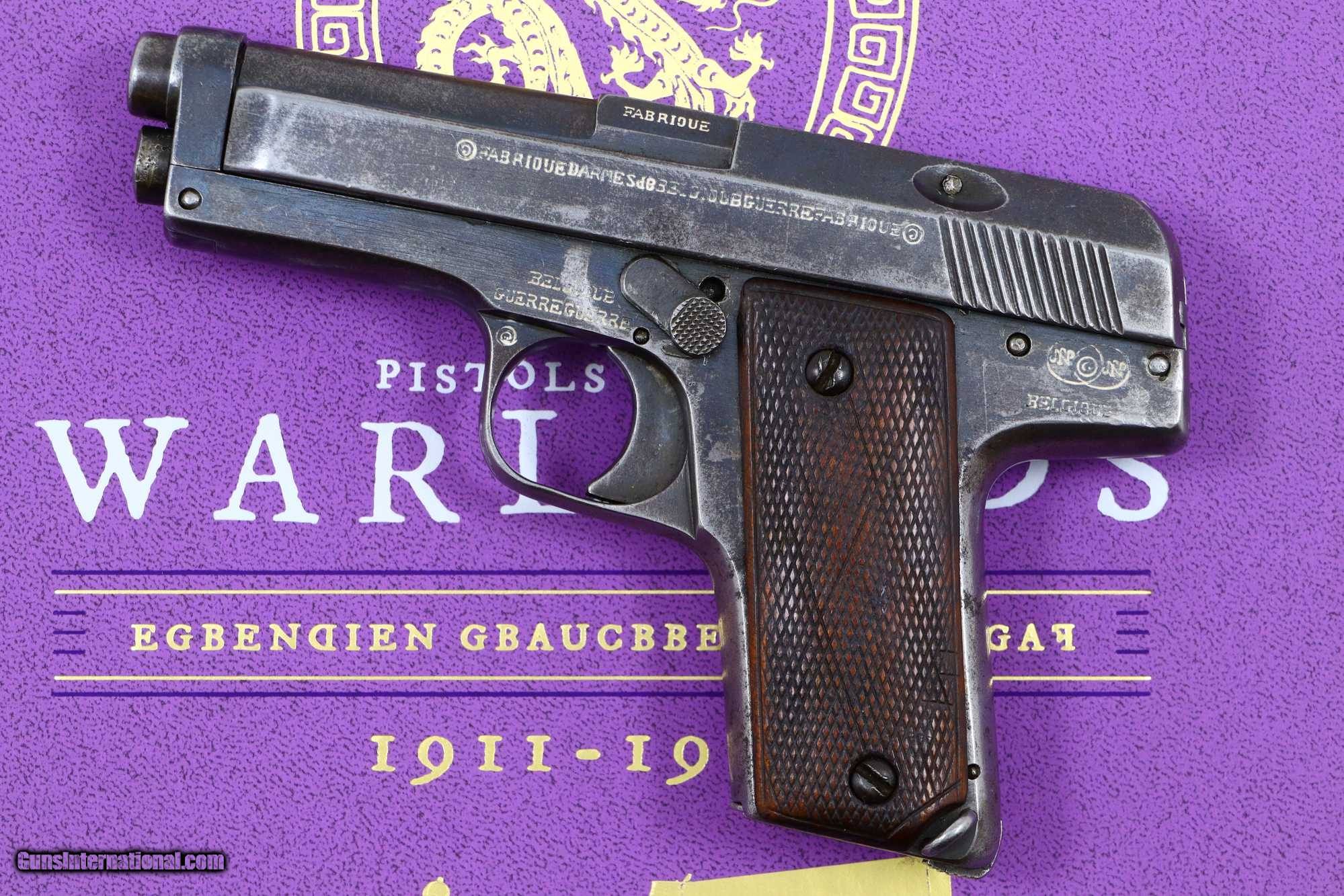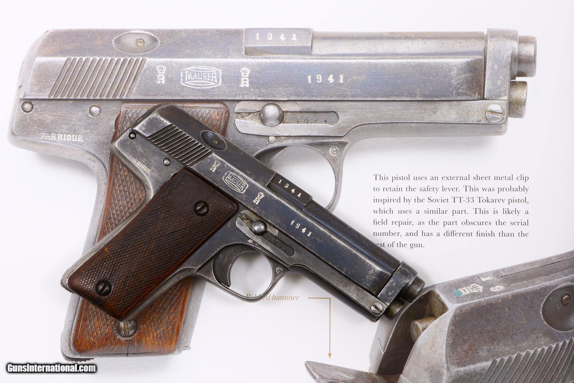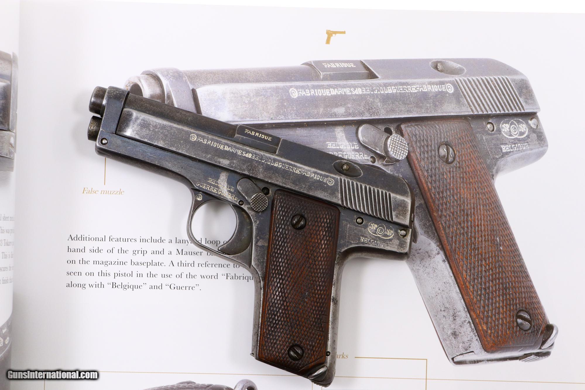 Description: Single action blowback pistol with external hammer, now bobbed, having fixed front sight, loaded indicator, and no rear sight. The right side of the slide and both sides of the frame have a scattering falsified FN and Mauser markings along with "Crown/R" proofs. Full serial number is on the right side of the chamber flat, slide and frame. The left side of the frame has been fitted with a mid-frame Eibar-type safety, retained with a separate screwed-in forked spring. Original wood checkered grips. Magazine with 5 indicator holes on left side, 3 indicator holes on the right side and a falsified "Mauser Banner" floorplate. This exact pistol is pictured in the "Pistols of the Warlords 1911-1949" by Ian McCollum pages 170-171. Synopsis: Unusual Chinese Warlord era pistol with dimpled, open-top slide, having a scattering of falsified FN and Mauser markings. Condition: Original rust blue with wear as one might expect from moderately heavy use. Safety functions properly but does not always release the hammer when rotated to the fire position. Dull bore with sharp rifling. Very unusual Chinese Warlord pistol, well marked, and especially nice it was pictured in the Chinese Warlord pistol book. NOT TO BE FIRED! NOT TO BE FIRED! NOT TO BE FIRED! ~~Insured shipping fee of $65; most packages shipped using FedEx 2nd Day.~~ SOLD Manufacturer: Chinese Arsenal Serial Number: 1941 Caliber Info: 7.65mm |